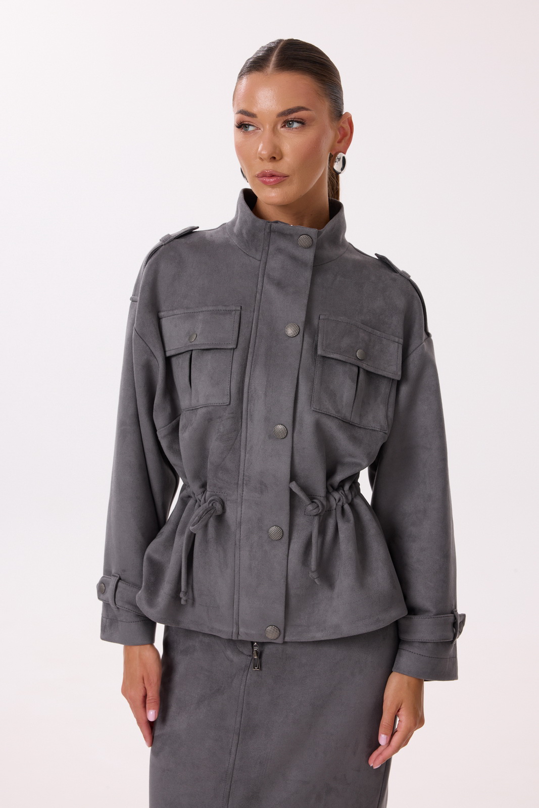 Описание: Костюм женский, состоящий из жакета и юбки. Жакет прямого силуэта с центральной застежкой на молнию. Перед с нагрудными накладными карманами с клапаном, застегивающимся на кнопку, обработана притачная планка с кнопками, закрывающая застежку. Спинка цельнокроеная. Плечо спущено, обработана декоративная пата с кнопкой. Рукав длинный одношовный, по низу декорирован патой с кнопкой. В области талии расположена кулиса для регулирования степени прилегания. Горловина обработана притачной стойкой. Юбка прямого силуэта. Перед со средним швом, в котором обработана застежка на молнию. Задняя половинка со средним швом и кокеткой. В боковых швах обработаны карманы, в левом по низу разрез. Верх обработан притачным поясом (частично на резинке), застегивающимся на кнопку. Декоративные элементы и фурнитура могут отличаться от заявленных на фото. Цвет материала может отличаться по тону в зависимости от настроек вашего монитора!