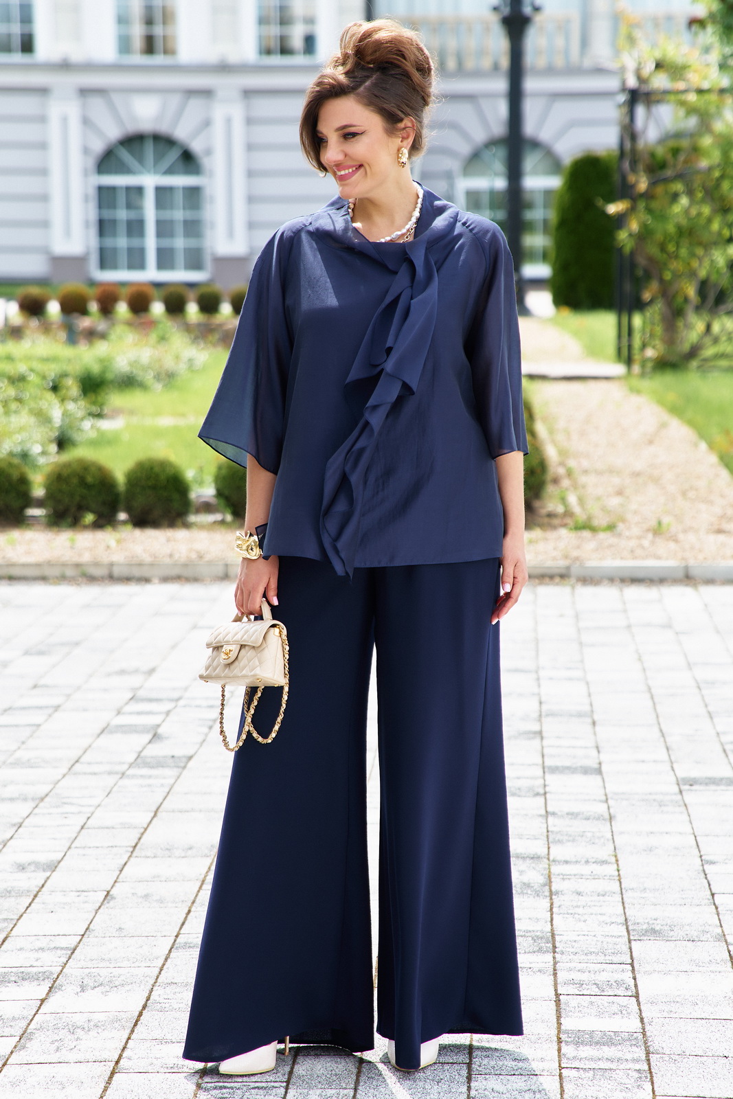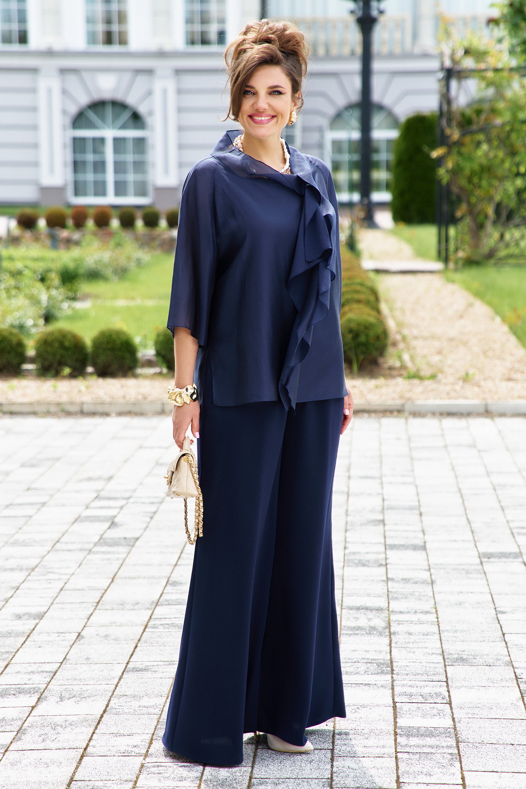 Описание: Элегантный брючный костюм, выполненный в мерцающем оттенке, который идеально подходит для создания утонченных образов. Комплект состоит из свободной блузы широких брюк палаццо, обеспечивая непревзойденный комфорт и легкость движений. Блуза привлекает внимание своим асимметричным дизайном с драпировками и широким, ниспадающим воротником, который придает образу динамичность и изысканность. Блуза свободного силуэта, с двойными деталями переда и спинки. Головина округлой формы. Рукав в блузе реглан, длиной ¾, что добавляет силуэту легкости и воздушности. В боковых швах блузы разрезы. Брюки с высокой посадкой и струящимся кроем визуально удлиняют ноги, создавая безупречный и гармоничный ансамбль. Этот костюм идеально подходит как для торжественных мероприятий, так и для деловых встреч, подчеркивая ваш безупречный вкус и чувство стиля. Длина блузы по спинке 68 см. Длина рукава блузы 48 см (р 50-54), 49 см (р 56-60). Длина брюк по боковому шву 108см (р 50-56), 108,5 см (р 58-60).
