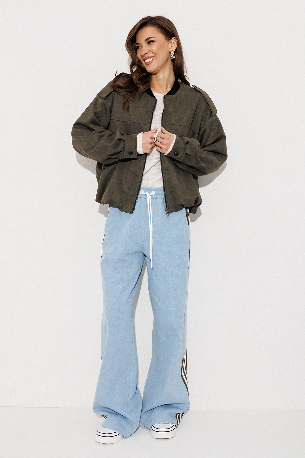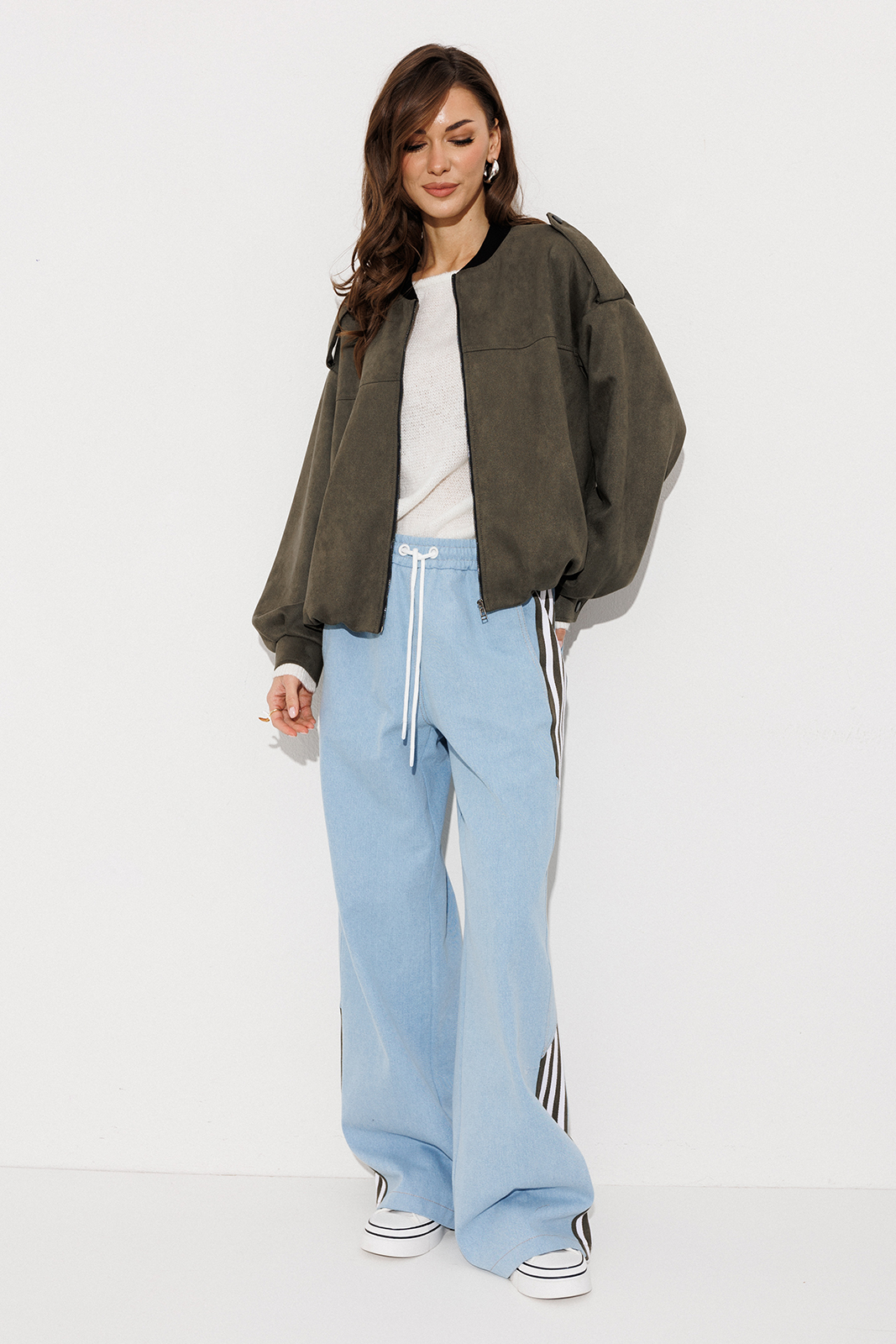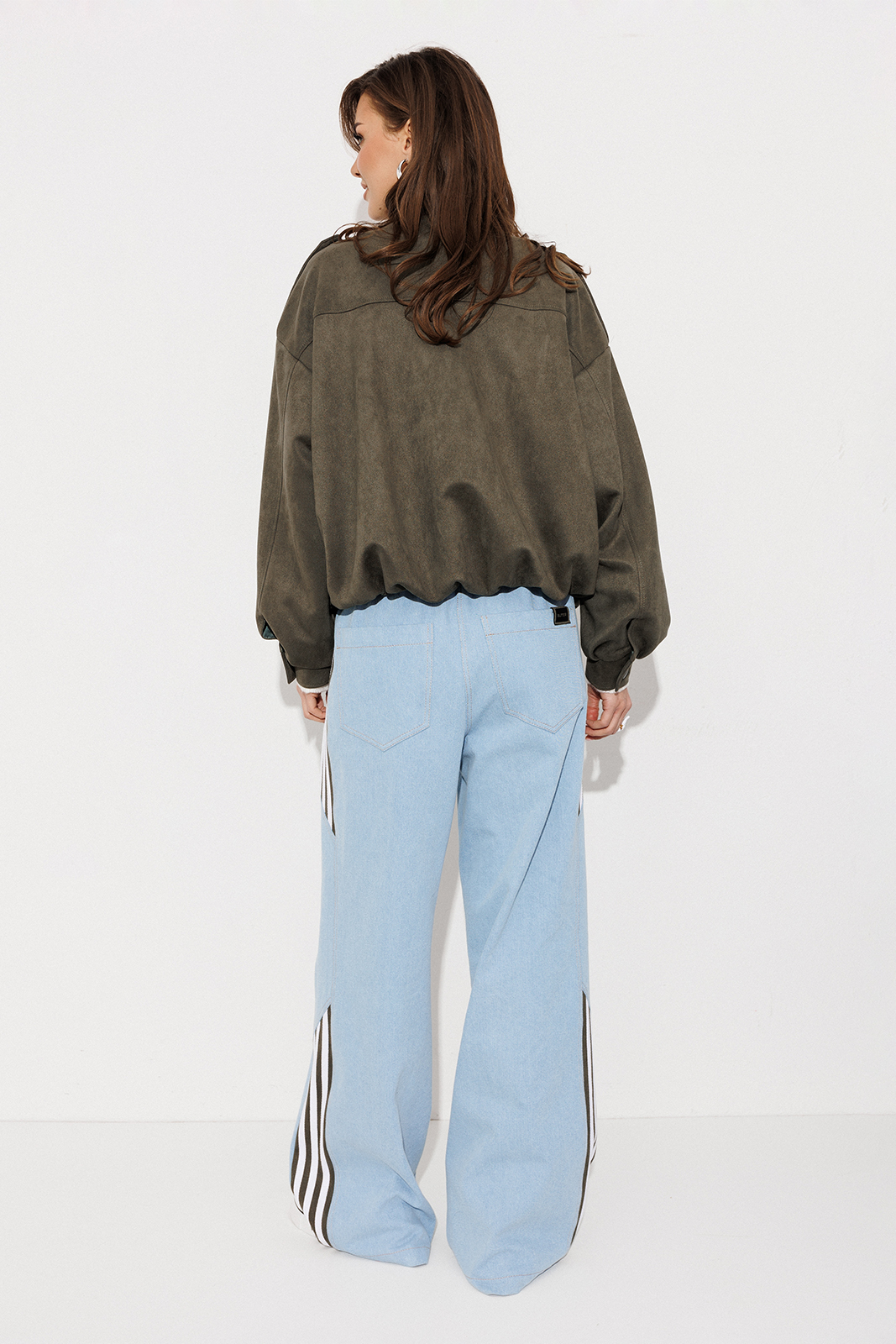 Описание: Курта из замши прямого силуэта со спущенной линией плеча. Рукав втачной двух шовный внизу со складками от притачной планки с застежкой на кнопку. Полочка с застежкой на тесьму молнию, с кокеткой и карманами с застежкой на молнию. Спинка с кокеткой. По плечевому шву погон с застежкой на кнопку. По горловине планка из довяза. Низ куртки со сборкой. Куртка на подкладке.