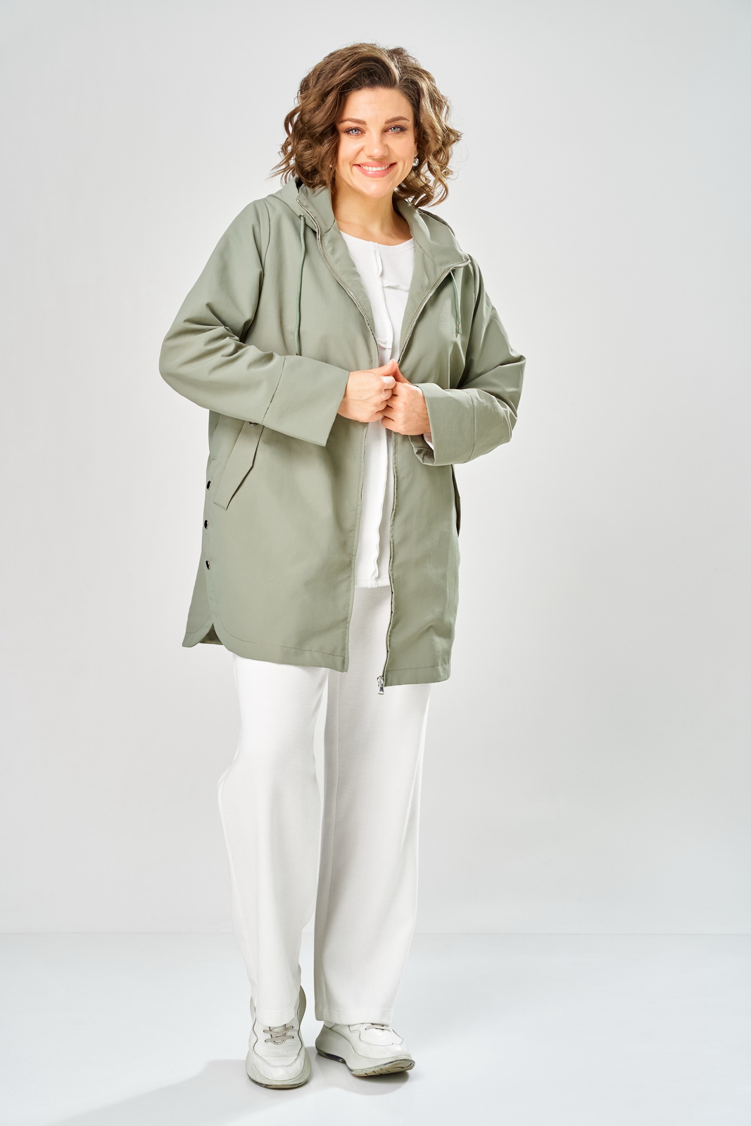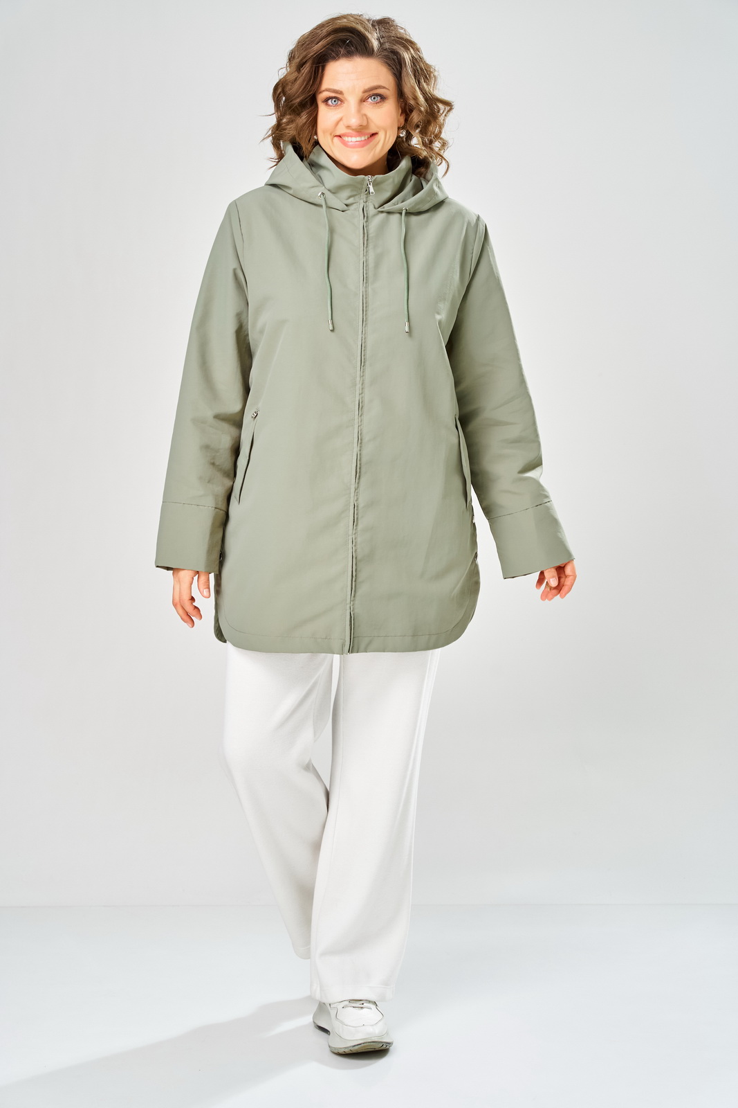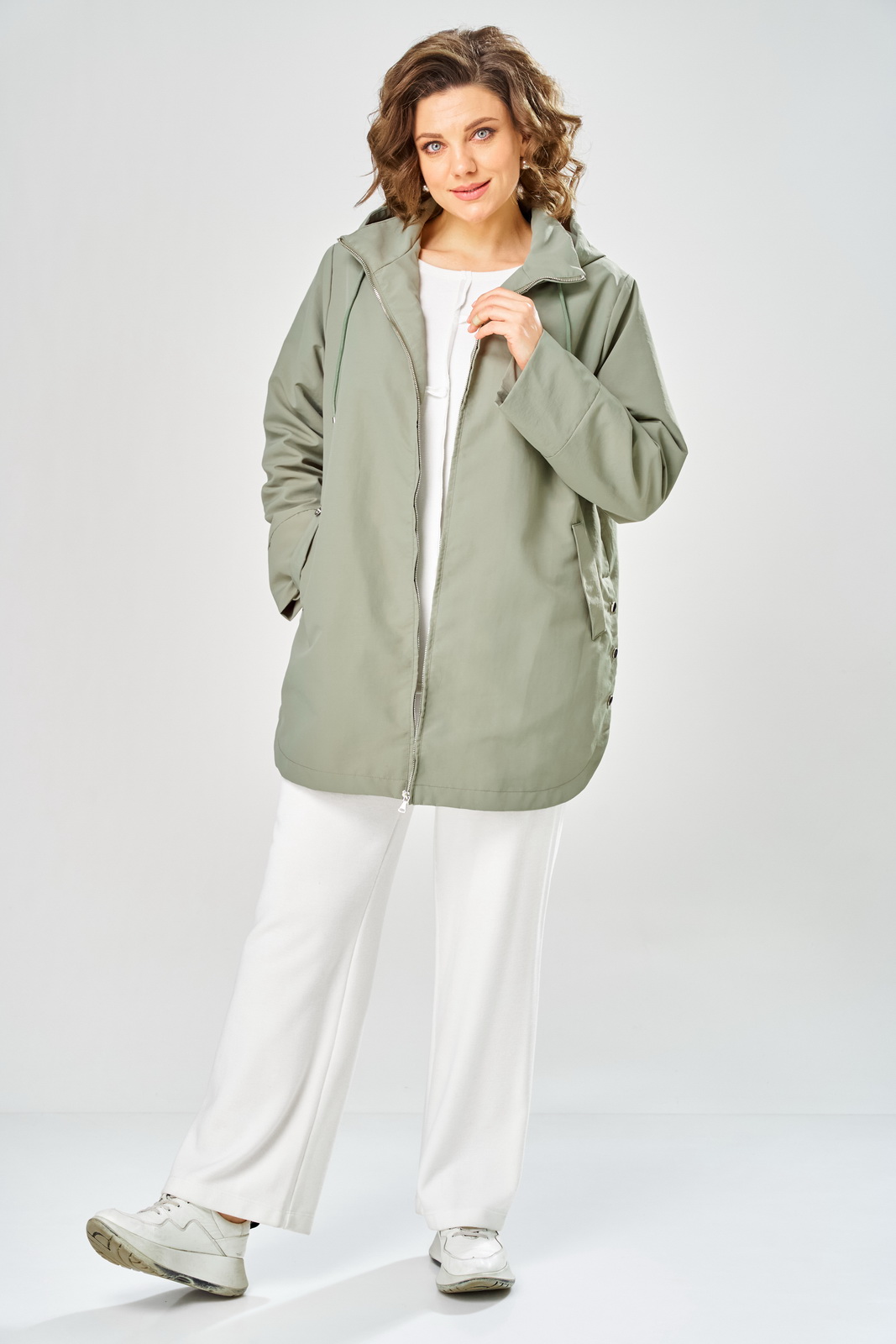 Описание: Куртка женская с центральной застежкой молния, свободного кроя , на подкладке. Перед с боковыми карманами, отложная листочка. Рукав втачной, одношовный с манжетами. Воротник стойка плюс капюшон с кулисой и шнуром. Низ куртки округлой формы. По бокам разрезы с зестежкой на 3 кнопки. Фурнитура может отличаться от заявленной на фото. Правый карман с металлической нашивкой.