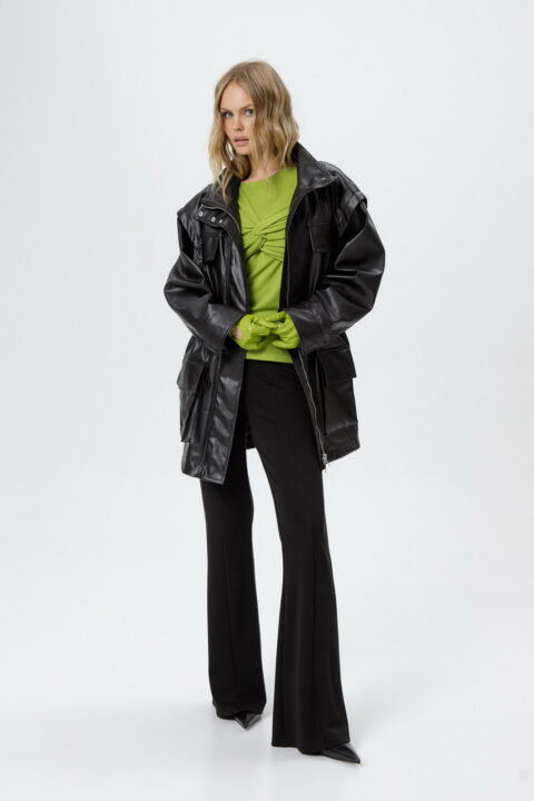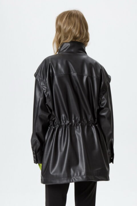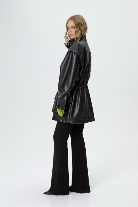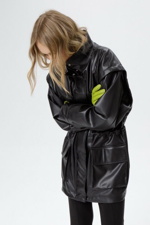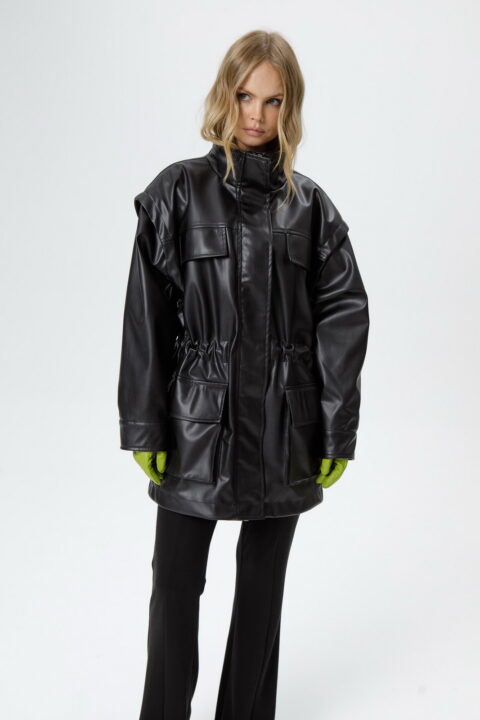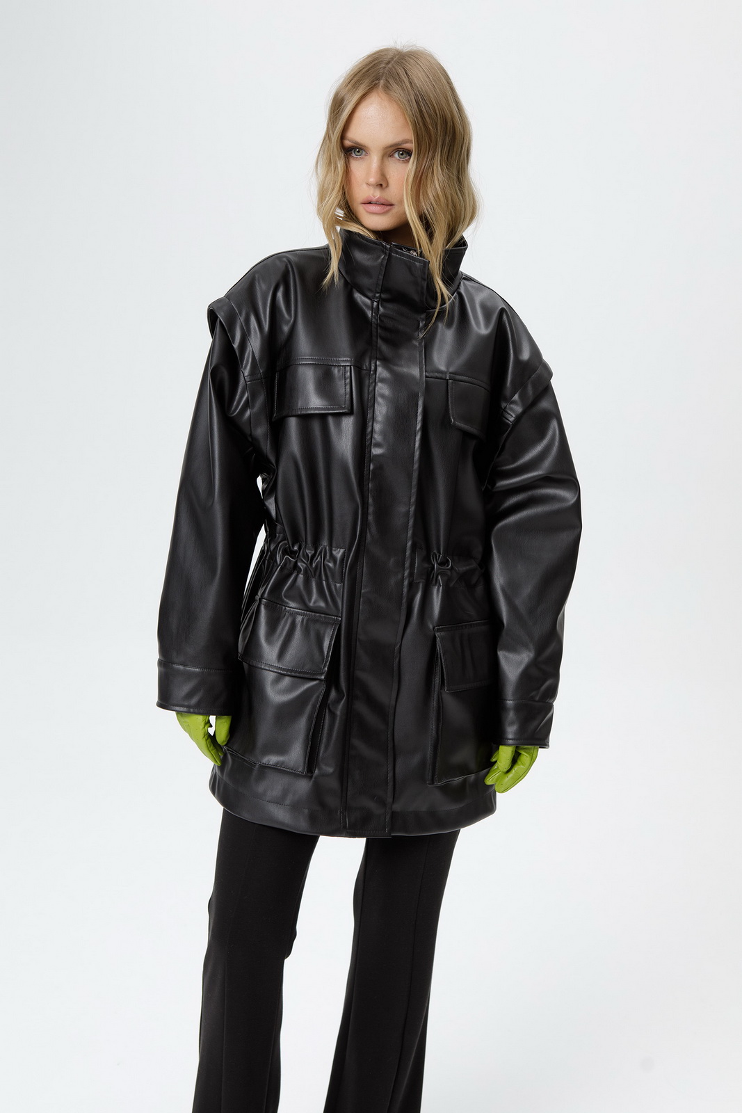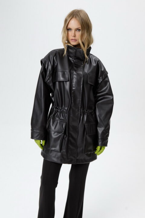 Описание: Удлиненная куртка-парка свободного кроя из экокожи и большими карманами.
