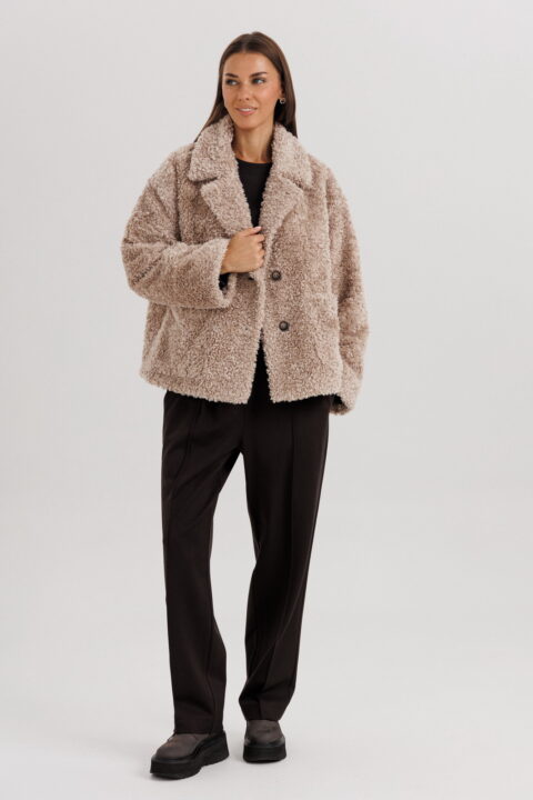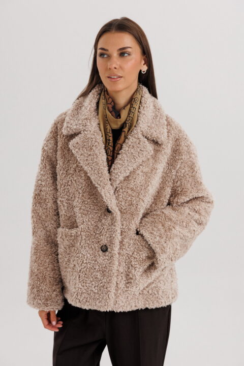 Модель выполнена с однобортной застёжкой на пуговицы, широким отложным воротником и удобными накладными карманами. Универсальный бежевый оттенок легко сочетается с различными элементами гардероба: будь то классические брюки, джинсы или романтичные платья.