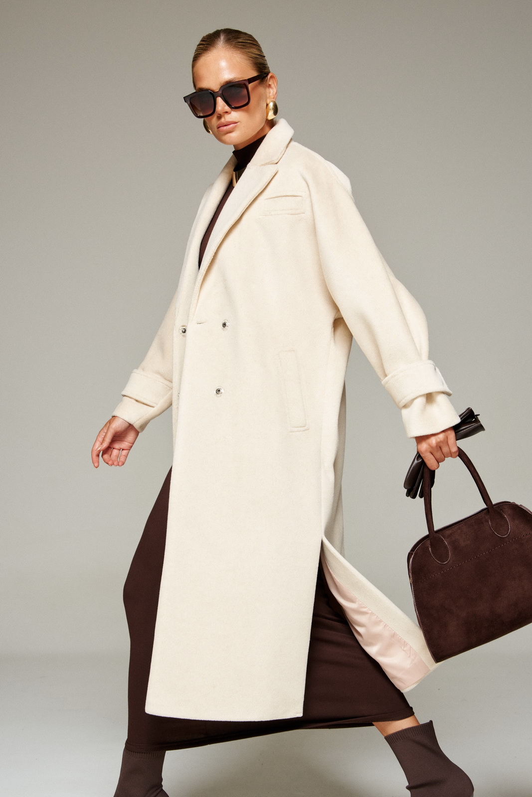 Пальтовыполненоиз шерстяной ткани, которая обеспечивает теплоизоляцию и защитуот ветра и влаги,подходит для межсезонья и теплой зимы.Двубортное, на подкладке.  Изделие рассчитано на температурный режим от +10 до -5 градусов.Модель прямого силуэтаактуального покроя «летучая мышь»; предназначена для повседневного использования.