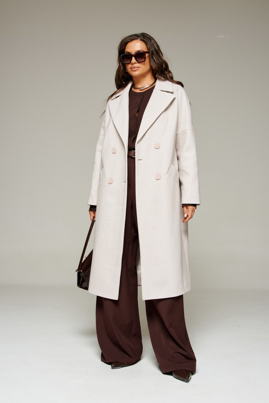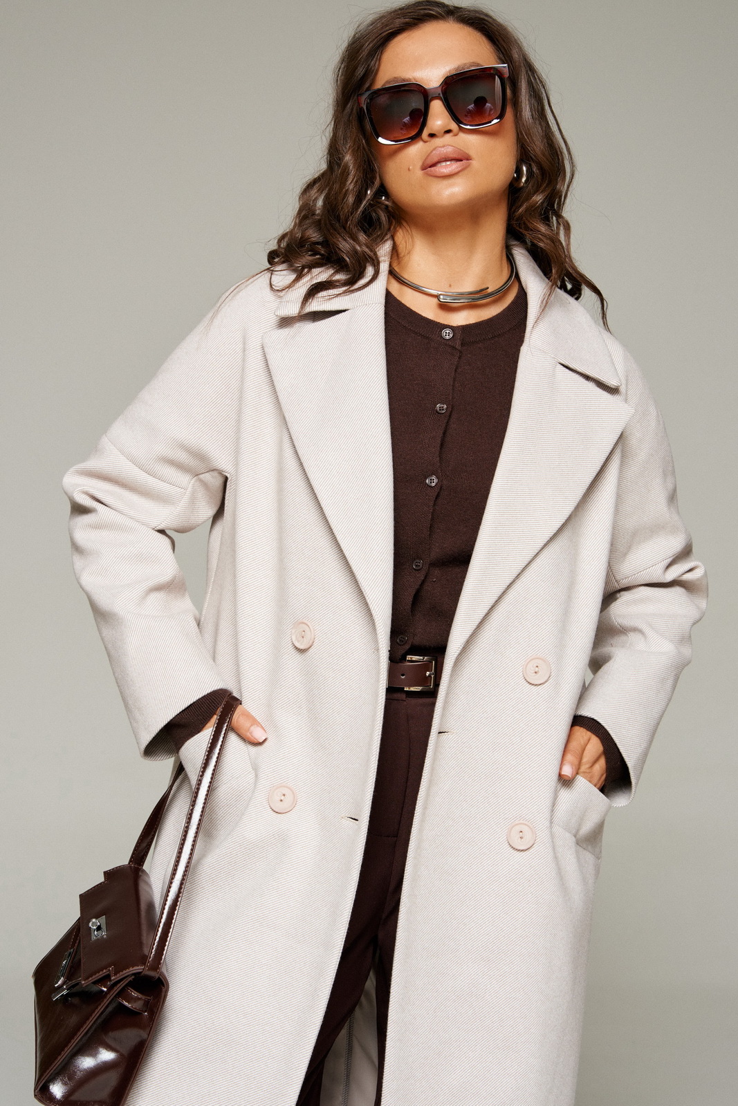 Пальтовыполненоиз шерстяной ткани, которая обеспечивает теплоизоляцию и защитуот ветра и влаги,подходит для межсезонья и теплой зимы.Двубортное, на подкладке.  Изделие рассчитано на температурный режим от +10 до -5 градусов.Модель прямого силуэта, с цельнокроеным покроем рукава; предназначена для повседневного использования.