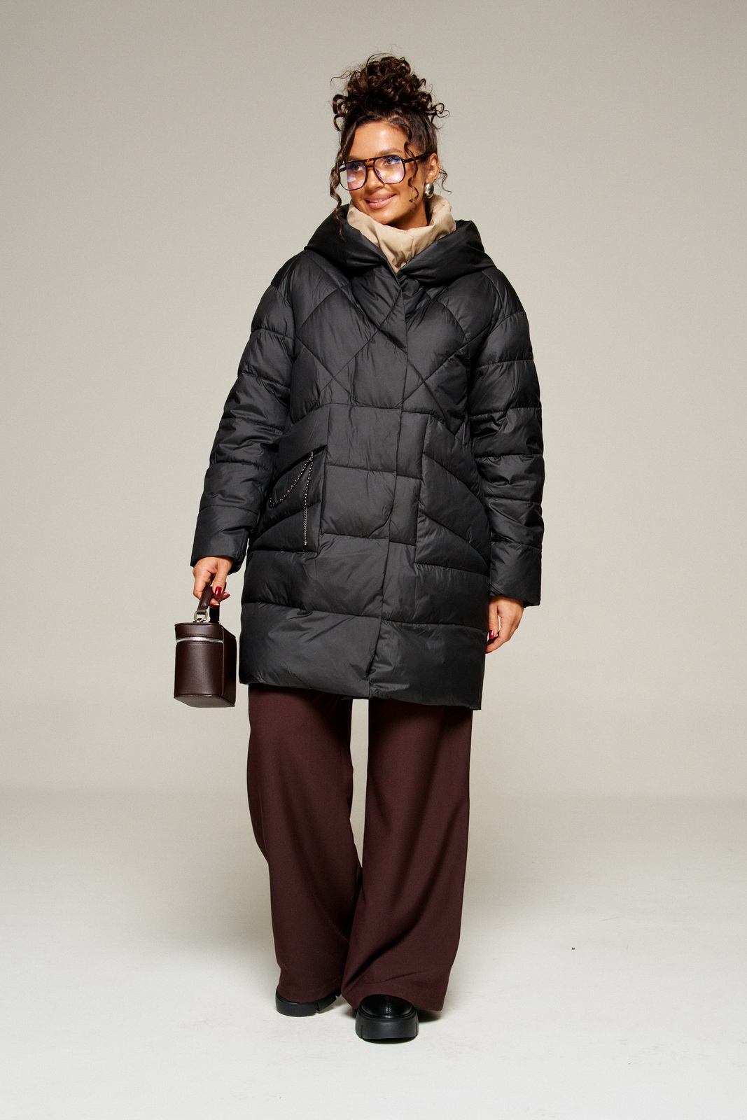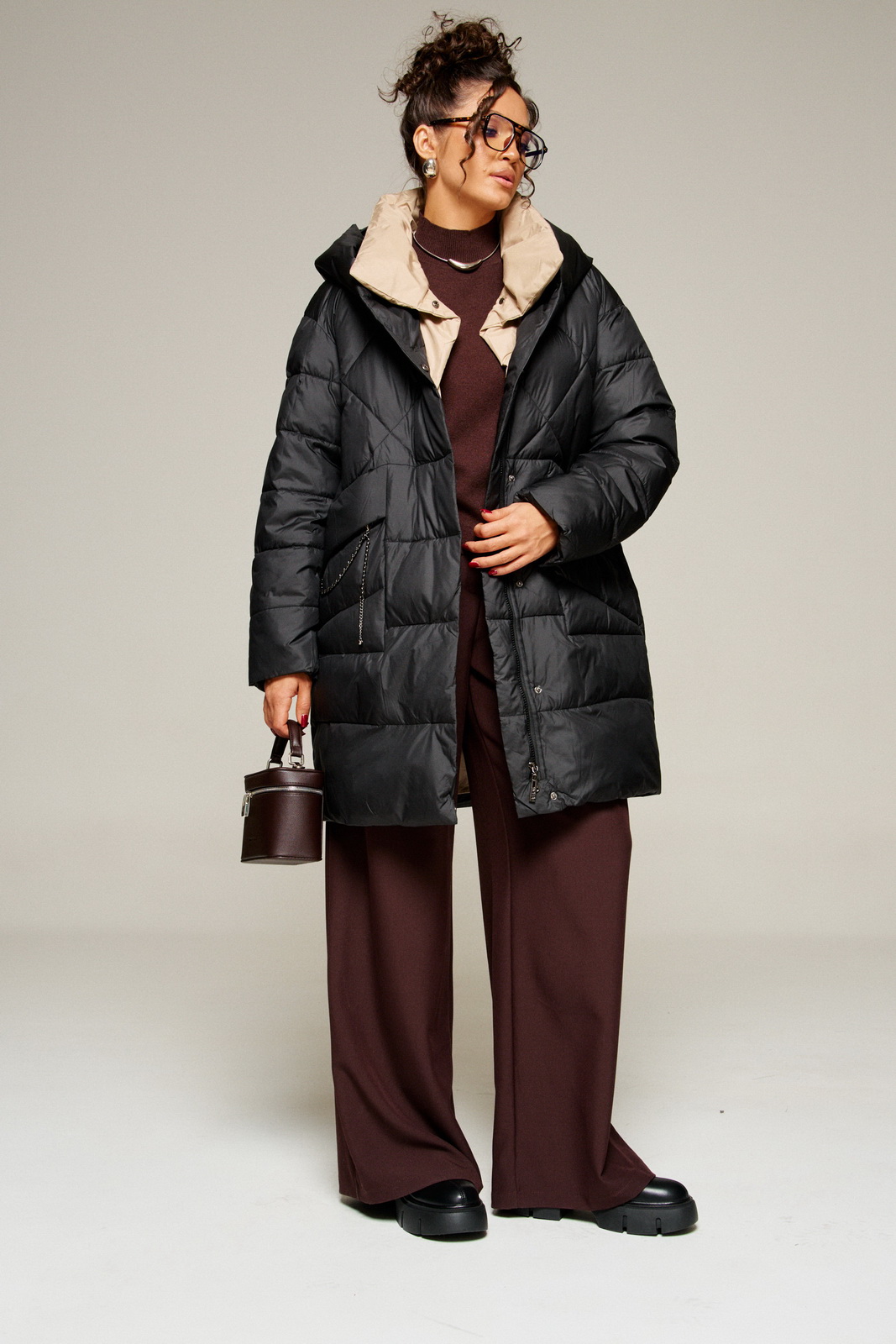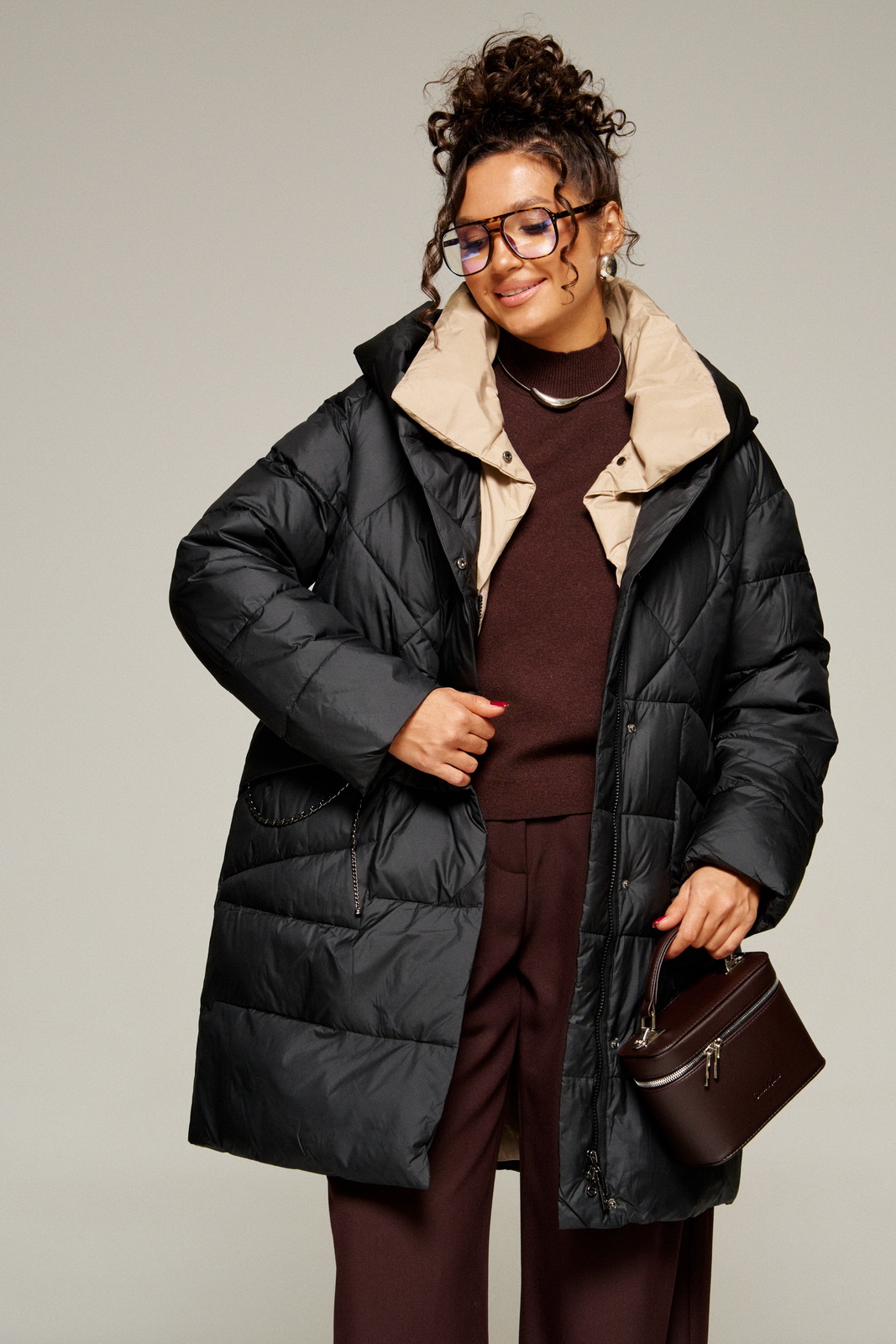 Современный объёмный крой и спущенная линия плеч создают расслабленный актуальный силуэт. А широкий воротник играет роль дизайнерского акцента.