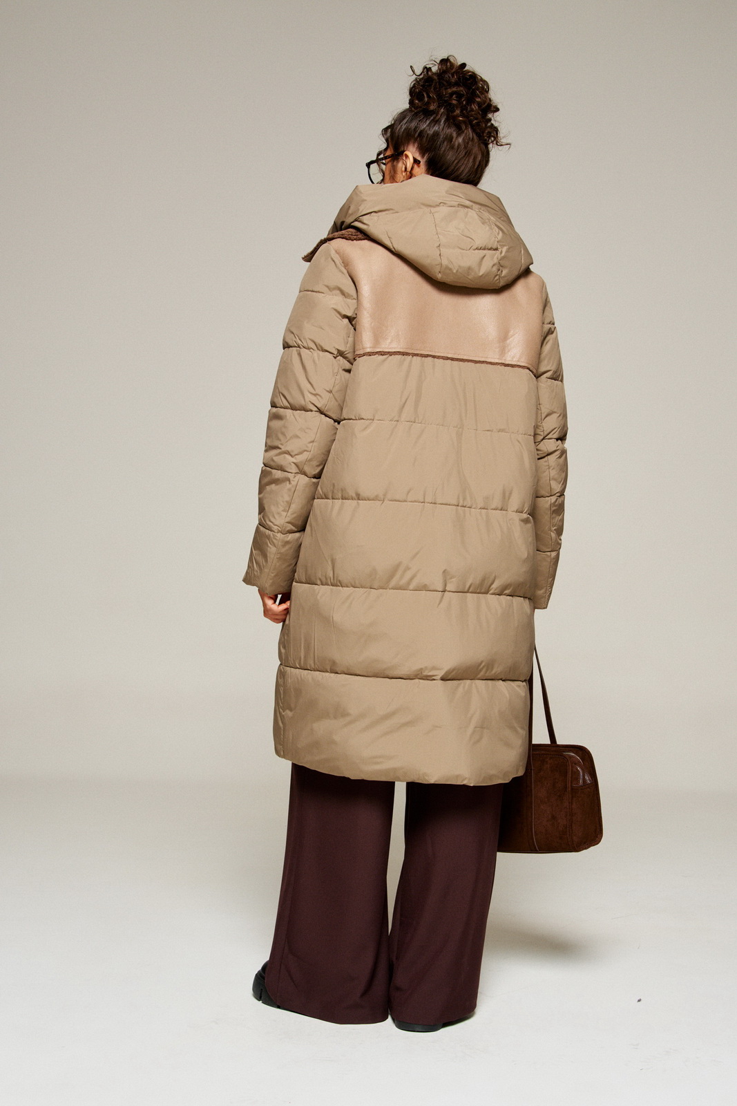 Перед с подрезной кокеткой из экокожи и с симметричными боковыми прорезными карманами с широкой обтачкой, фиксируемые на кнопку. На правом кармане выполнен декоративный элемент в виде широкой репсовой тесьмы. Центральная вставка переда, переходящая в воротник, выполнена из двусторонней экокожи, где внутренняя сторона – искусственный мех «овчина».