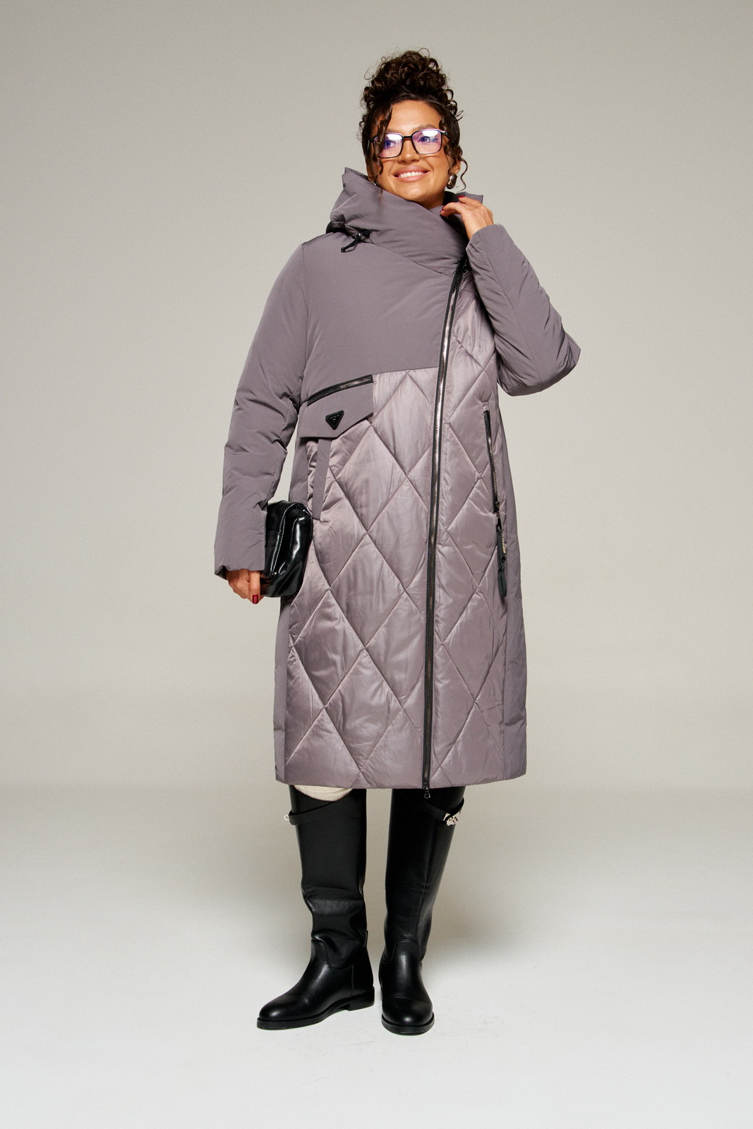 Перед асимметричный. С правой стороны расположены кокетка и вертикальный подрез от неё. В кокетку вставлена декоративная молния и клапан с пришивным отделочным элементом. На центральной правой части переда расположен боковой прорезной карман с обтачкой. С левой стороны – два вертикальных рельефа: от плеча (в который вставлена часть молнии) и от проймы, а также боковой прорезной карман на молнии с декоративным фиксатором. Центральные части переда выполнены из отделочной стеганой ткани с блеском аналогичного оттенка с цветом изделия.