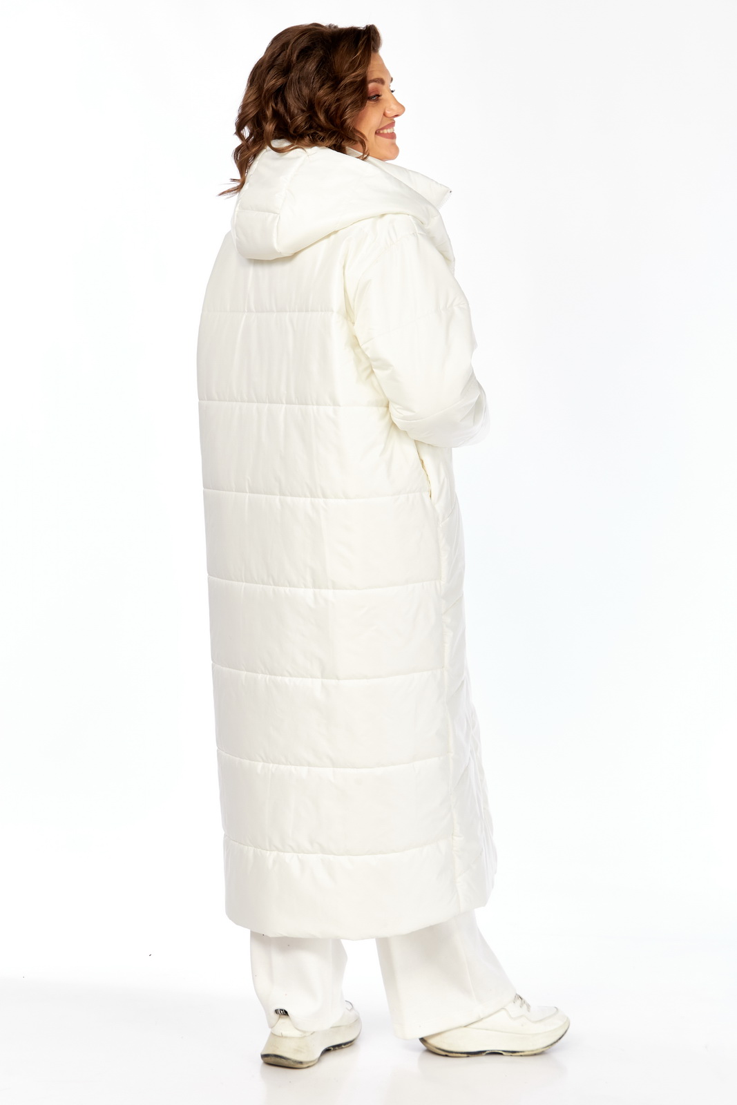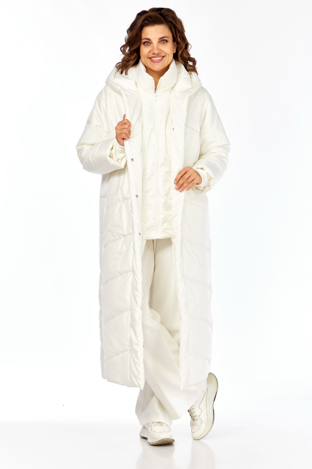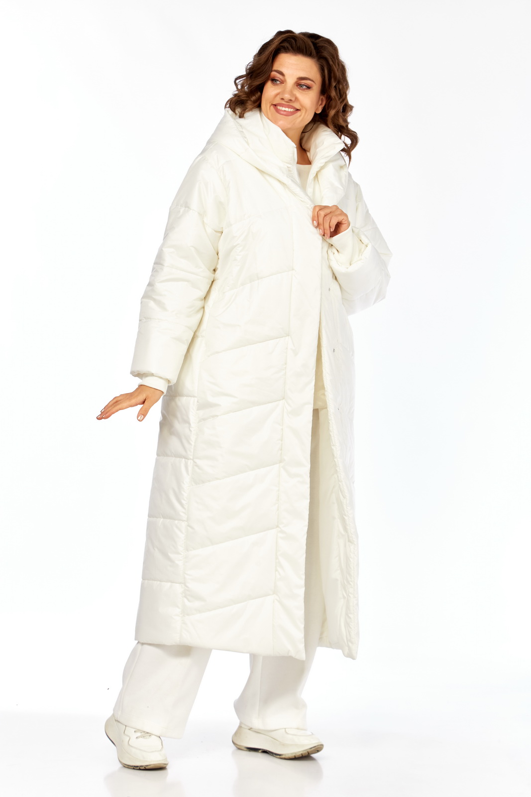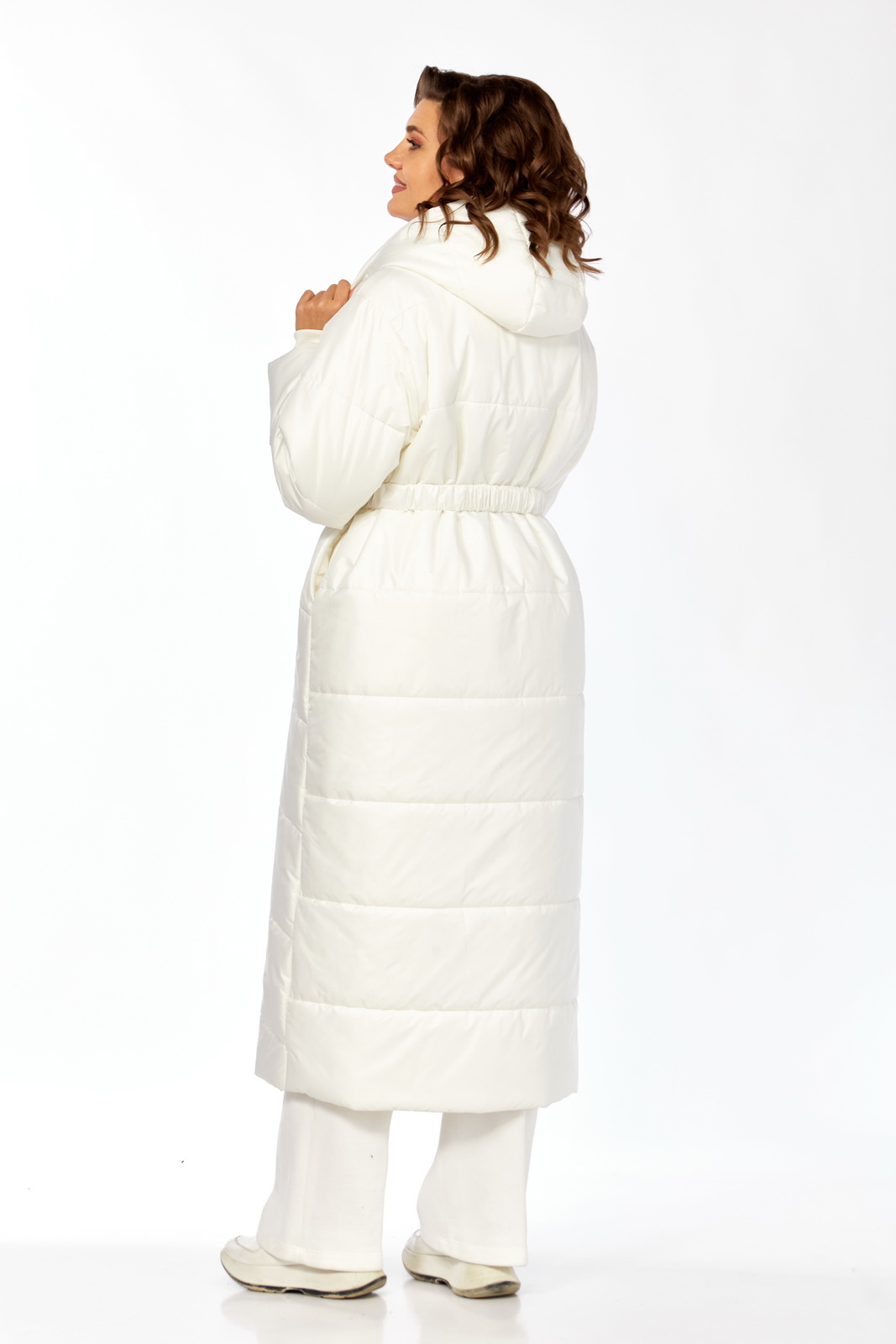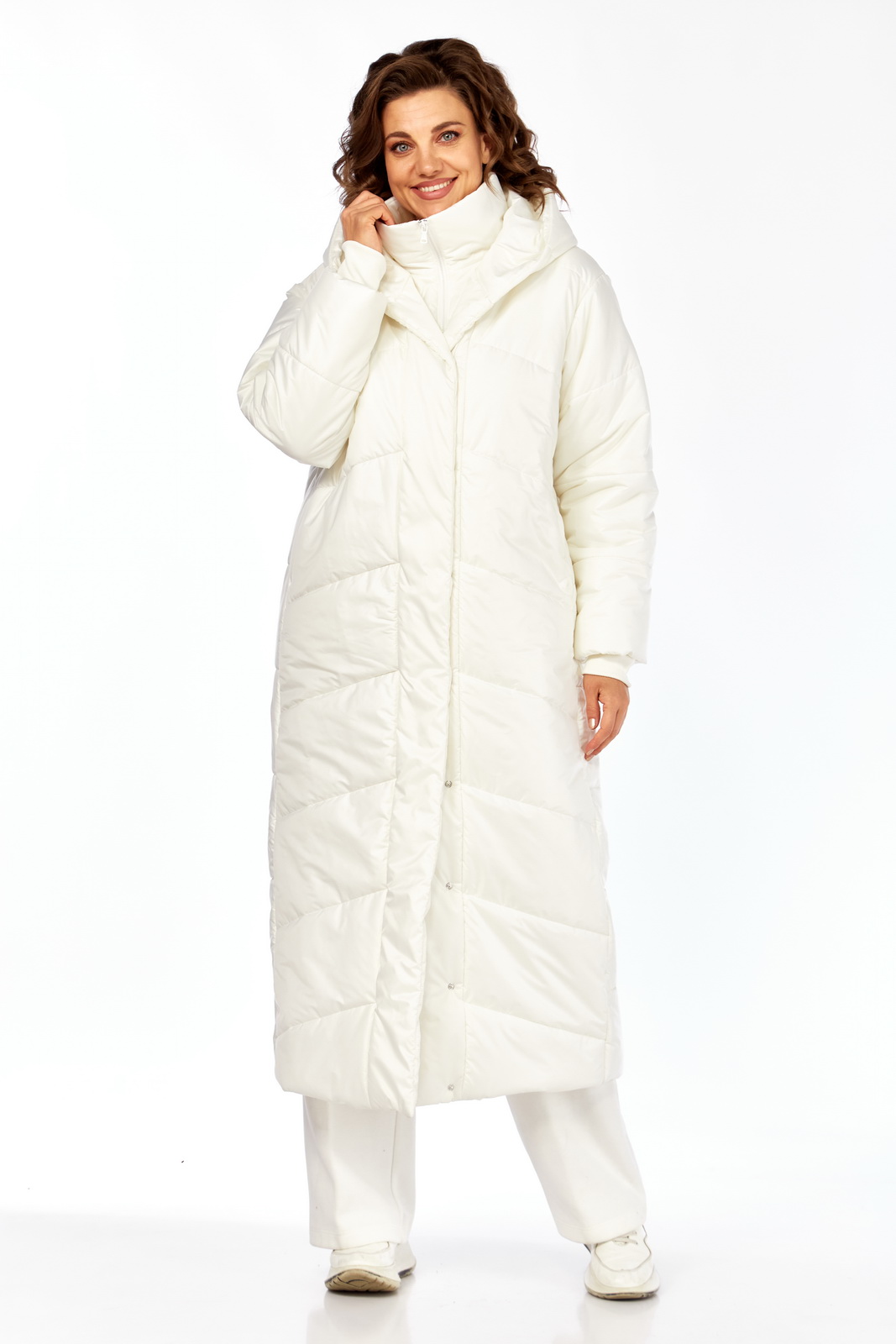 Описание: Пальто женское утепленное (длиной до щиколотки). Спинка с горизонтальной стежкой. Боковые швы смещены на перед. Полочки выстеганы по косой. Боковые карманы обработаны в швах. Рукав втачной, одношовный с трикотажными манжетами из-под подгибки. Паьлто с притачной манишкой, которая с воротником-стойкой и на “молнии”. Капюшон соединен с планкой, которая застегивается на кнопки сверху до низа изделия. Температурный режим до -10 градусов.