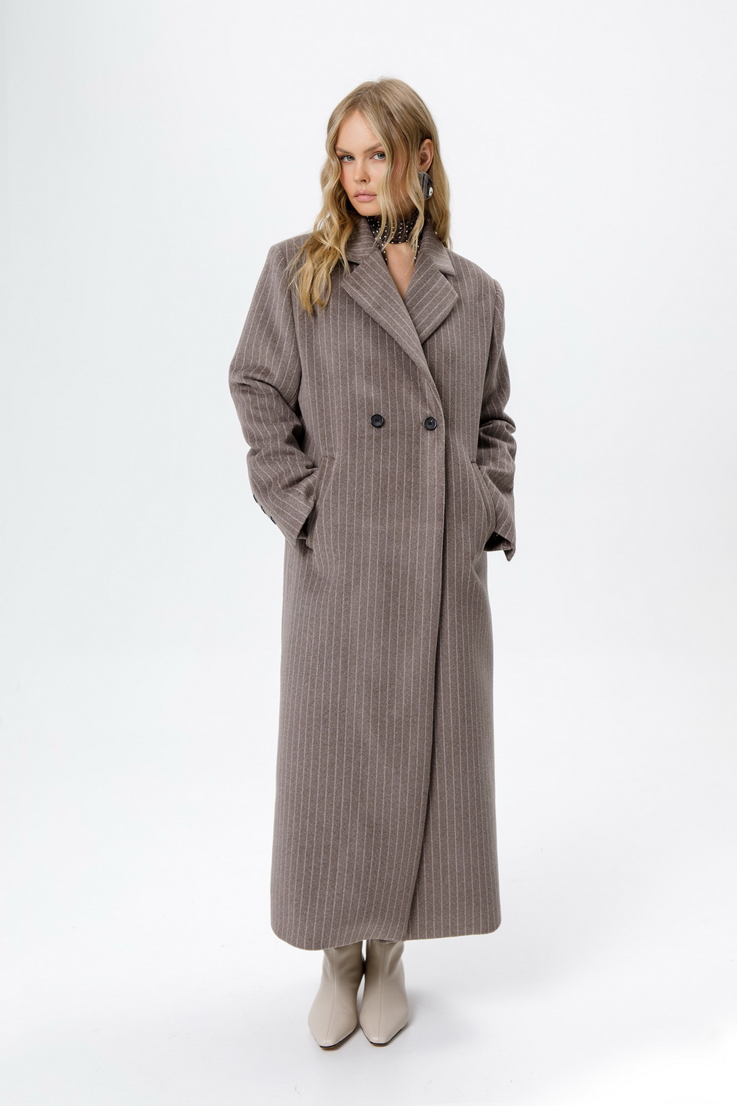 Описание: Пальто свободного силуэта из ткани в полоску.