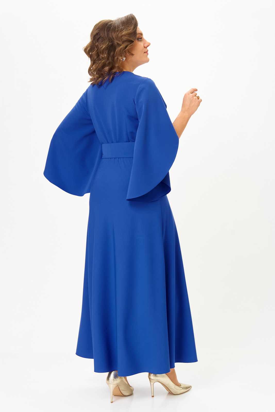 Платье отрезное по линии талии. Полочка с иммитацией запаха и складками по линии талии. Горловина V-образной формы. Спинка с талиевыми вытачками. Рукав втачной, обьемный к низу, с драпировкой. Юбка полуприлегающая по бедрам, свободная и широкая по низу. По боковым швам в области талии настрочены шлевки, через которые продет пояс, крепящийся на пуговицу.