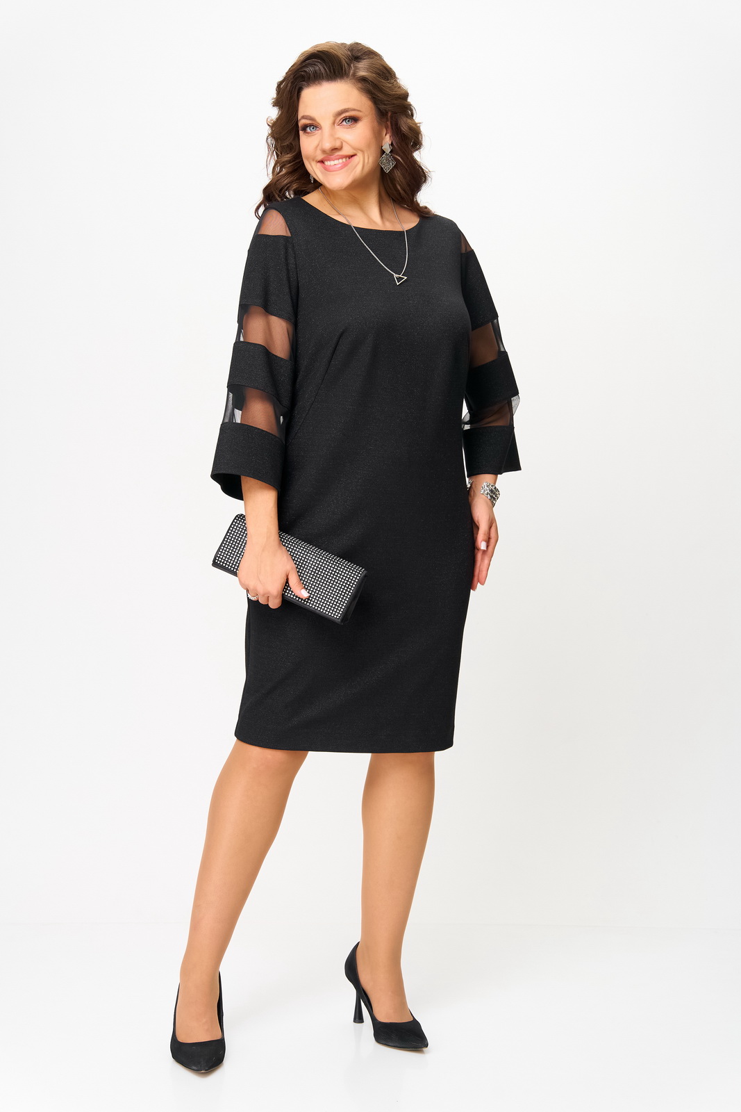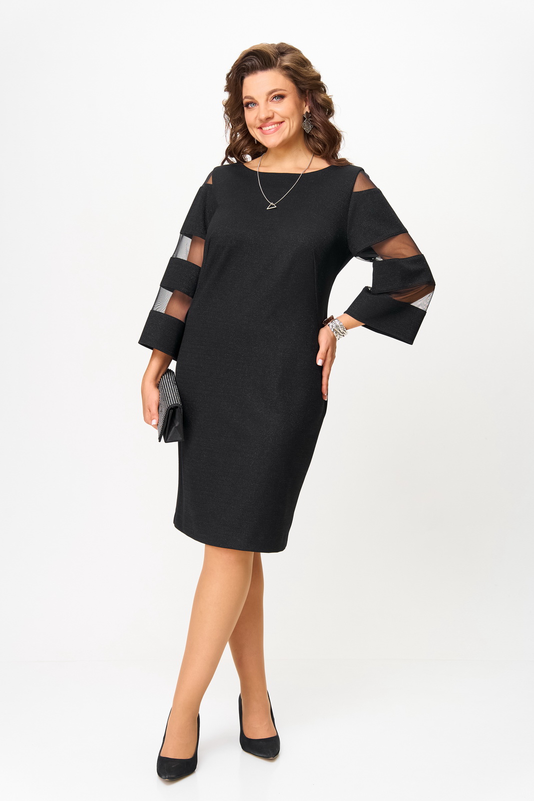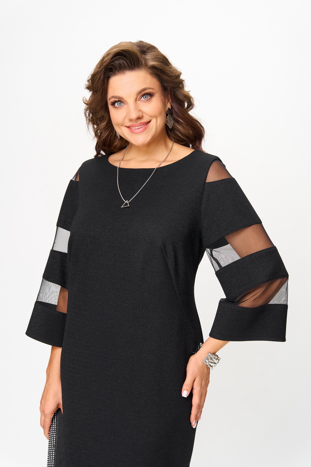 Силуэт прямой. Рукав втачной, слегка расширенный к низу. По рукаву вставлена сетка. Спинка со средним швом, шлица для хода. Платье без застёжки, без подкладки.