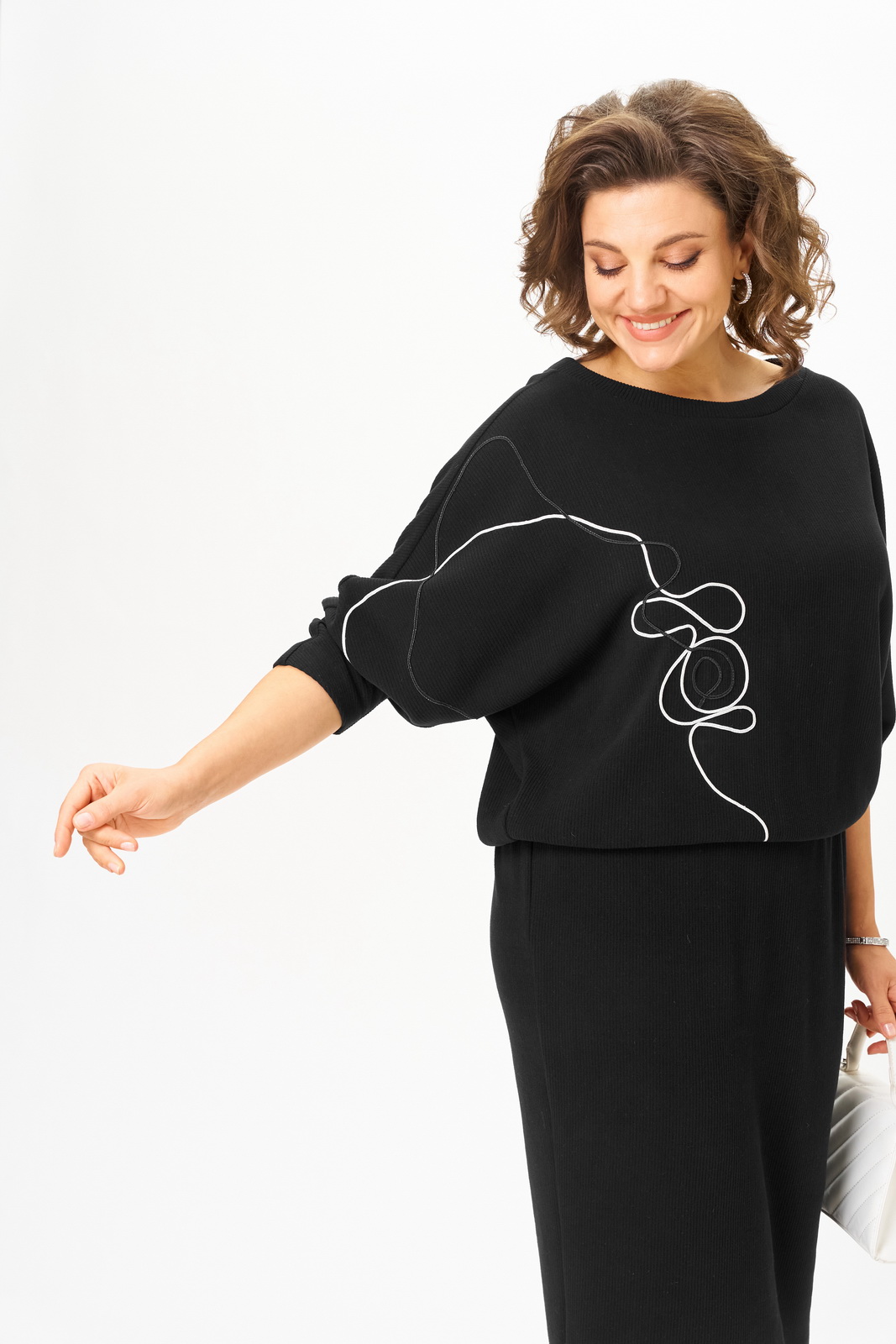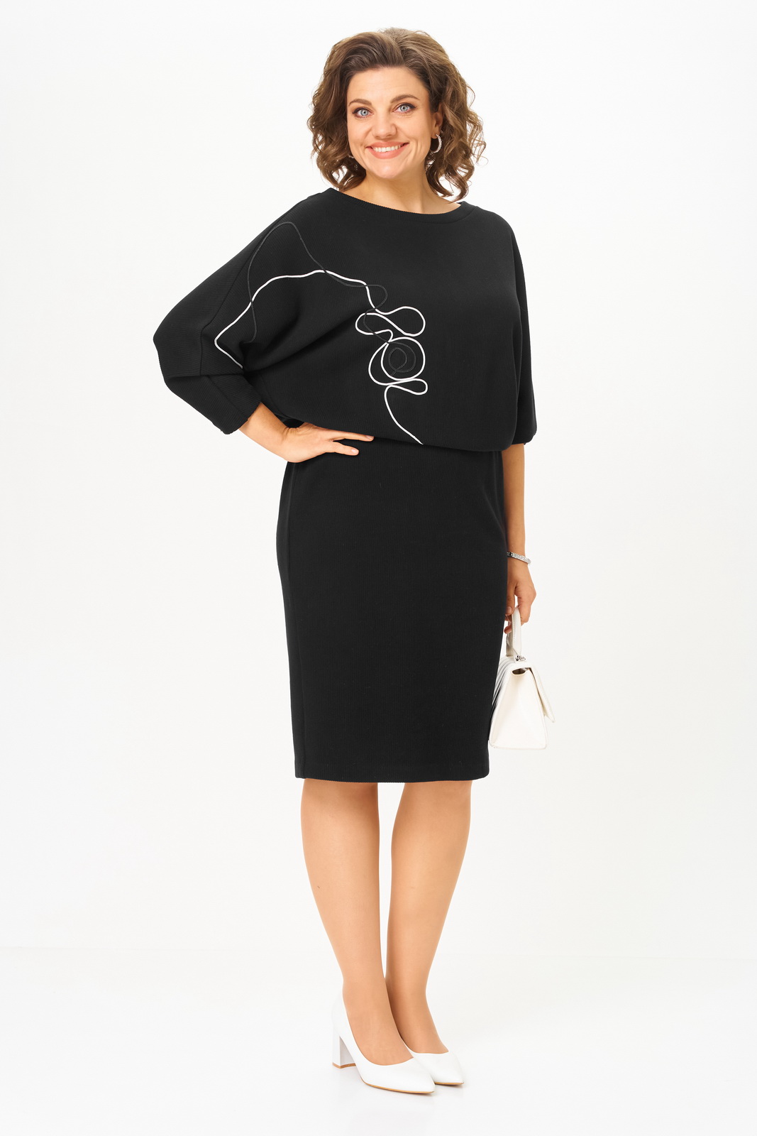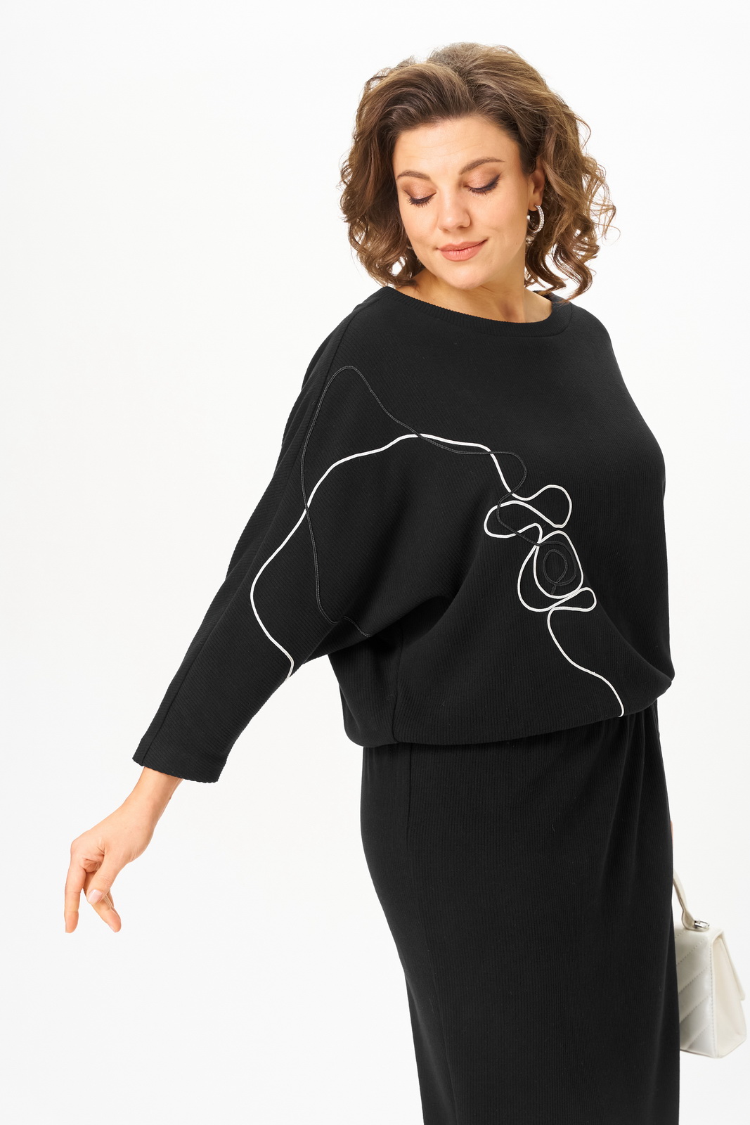 Горловина овальная, обработана бейкой, хорошо растягивается. Покрой изделия цельнокроеный. Силуэт лифа платья свободный. К низу платье прямое, слегка заужено. По линии талии вставлена резиночка. На детали переда выполнена декоративная вышивка тонким шёлковым шнуром. Спинка платья без особенностей. Платье без застёжки, без подкладки