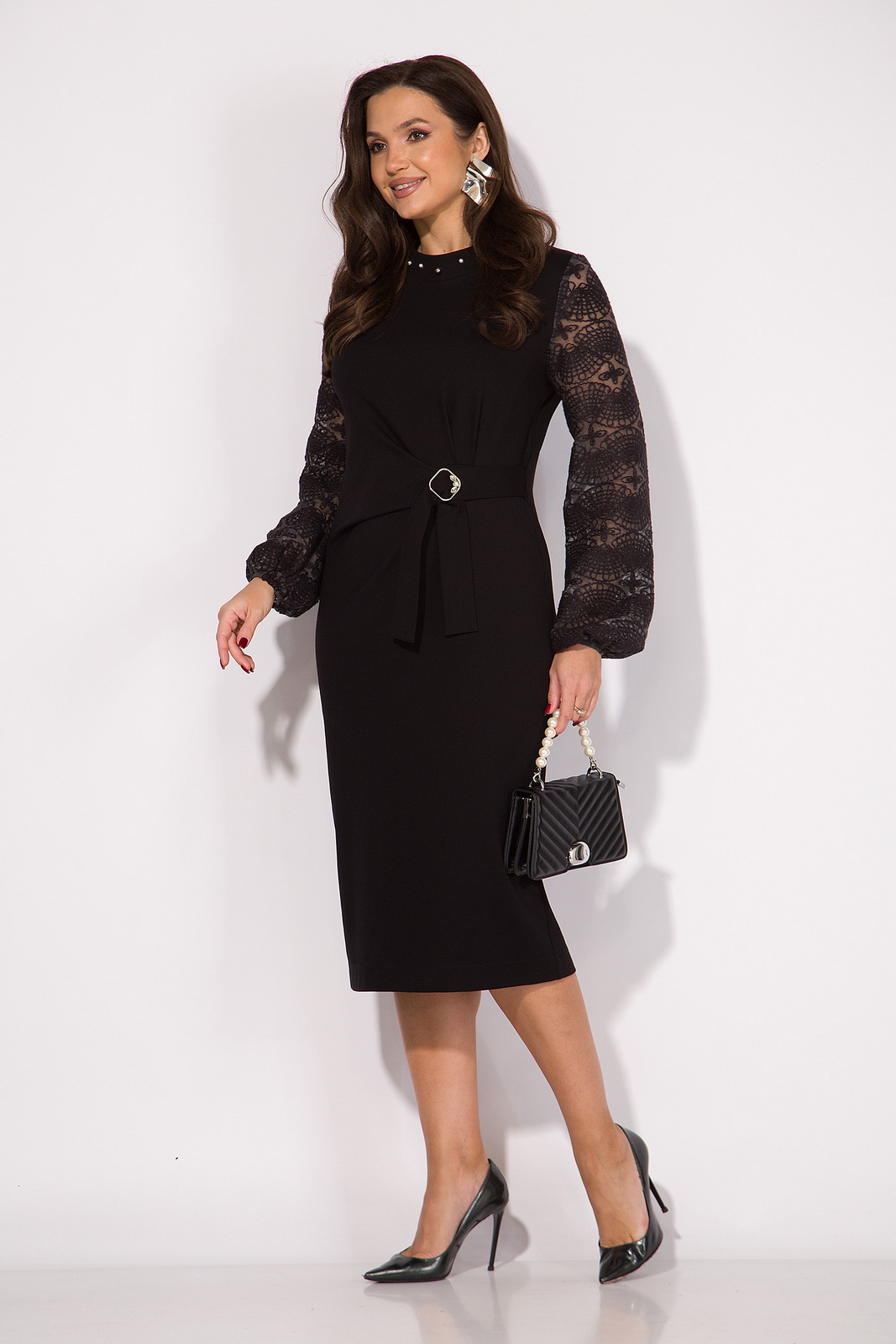 Описание: Эта модель платья из мягкого, уютного трикотажа подходит как для повседневного использования, так и для торжественных мероприятий. Прочная и эластичная ткань делает его незаменимым элементом вашего гардероба. Облегающий силуэт с эффектным подрезом по линии талии, переходящий в пояс с металлической пряжкой акцентирует фигуру и создает стильный, утончённый вид. Мягкая полулежащая стойка у горловины украшена пробивными бусинами из жемчуга. Спинка с центральным швом и обработанной шлицей по низу изделия. Застежка – потайная тесьма-молния по спинке. Эффектный ажурный рукав из сетки с вышивкой крючком дополняют и без того элегантный образ.
