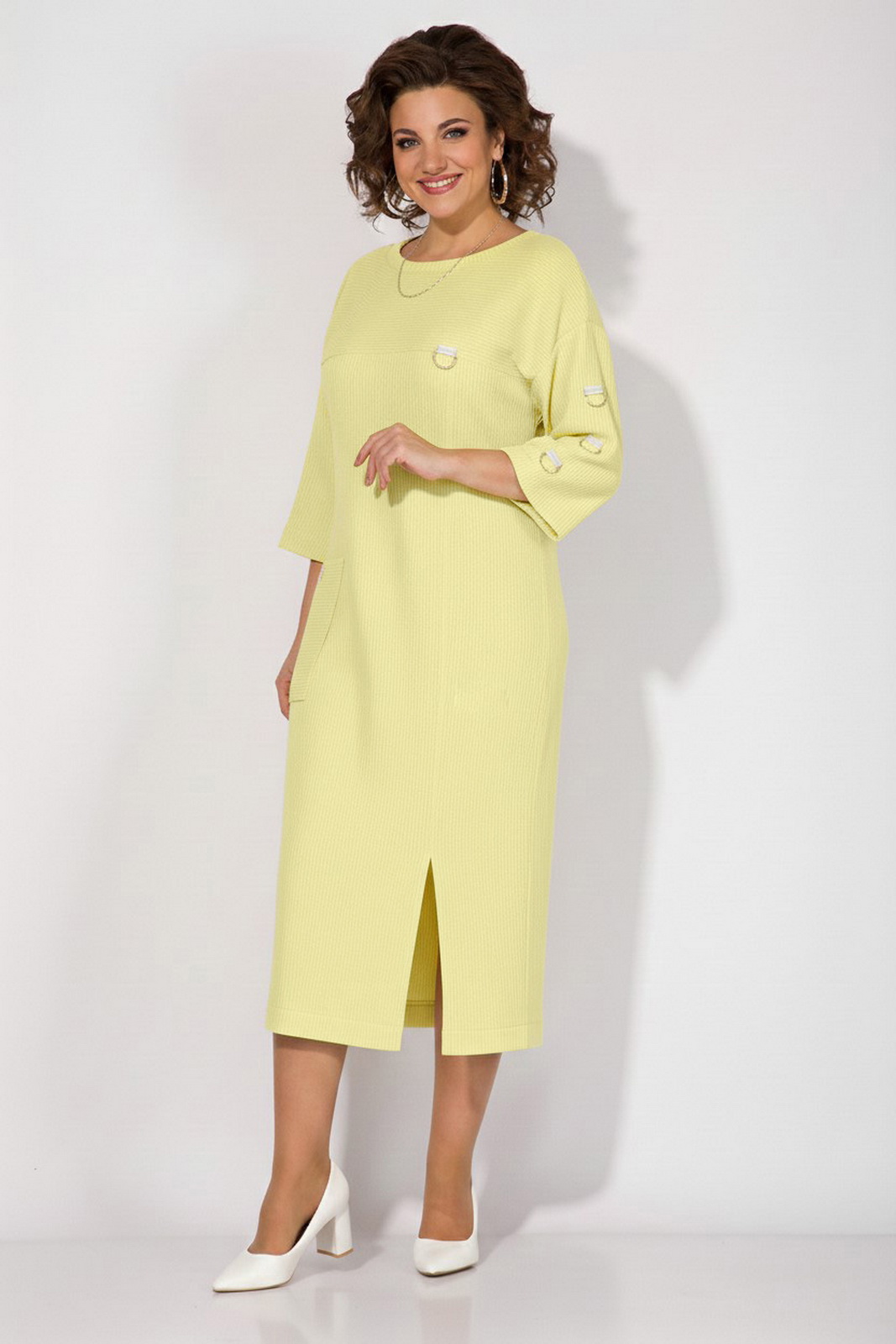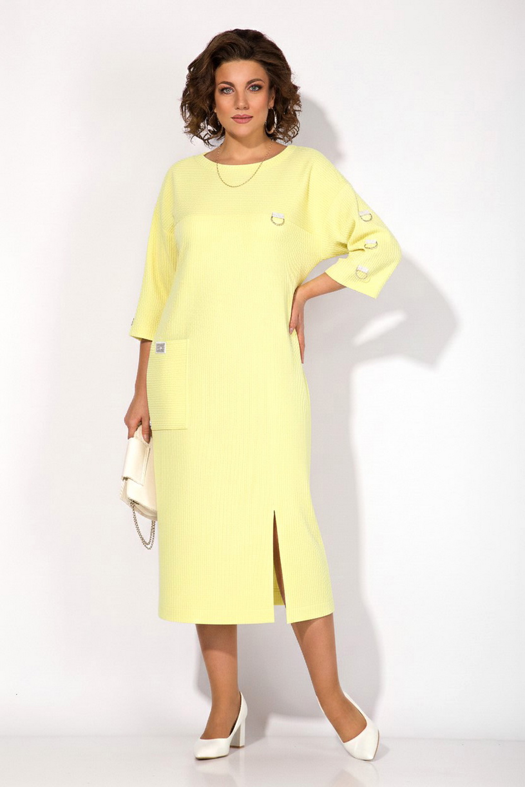 Описание: Эффектное платье выполнено из трикотажного штрукса, создано для тех, кто ценит комфорт в повседневной жизни. Модель полуприталенного силуэта со спущенной линией плеча. Рукав длиной3/4-ти украшает ряд декоративных полуколец. Вырез горловины округлый, на мягкой планке. Полочка с отрезной кокеткой и ассиметричным рельефом, переходящим в разрез на свободу движения. Ассиметричный накладной карман украшает декоративная нашивка.