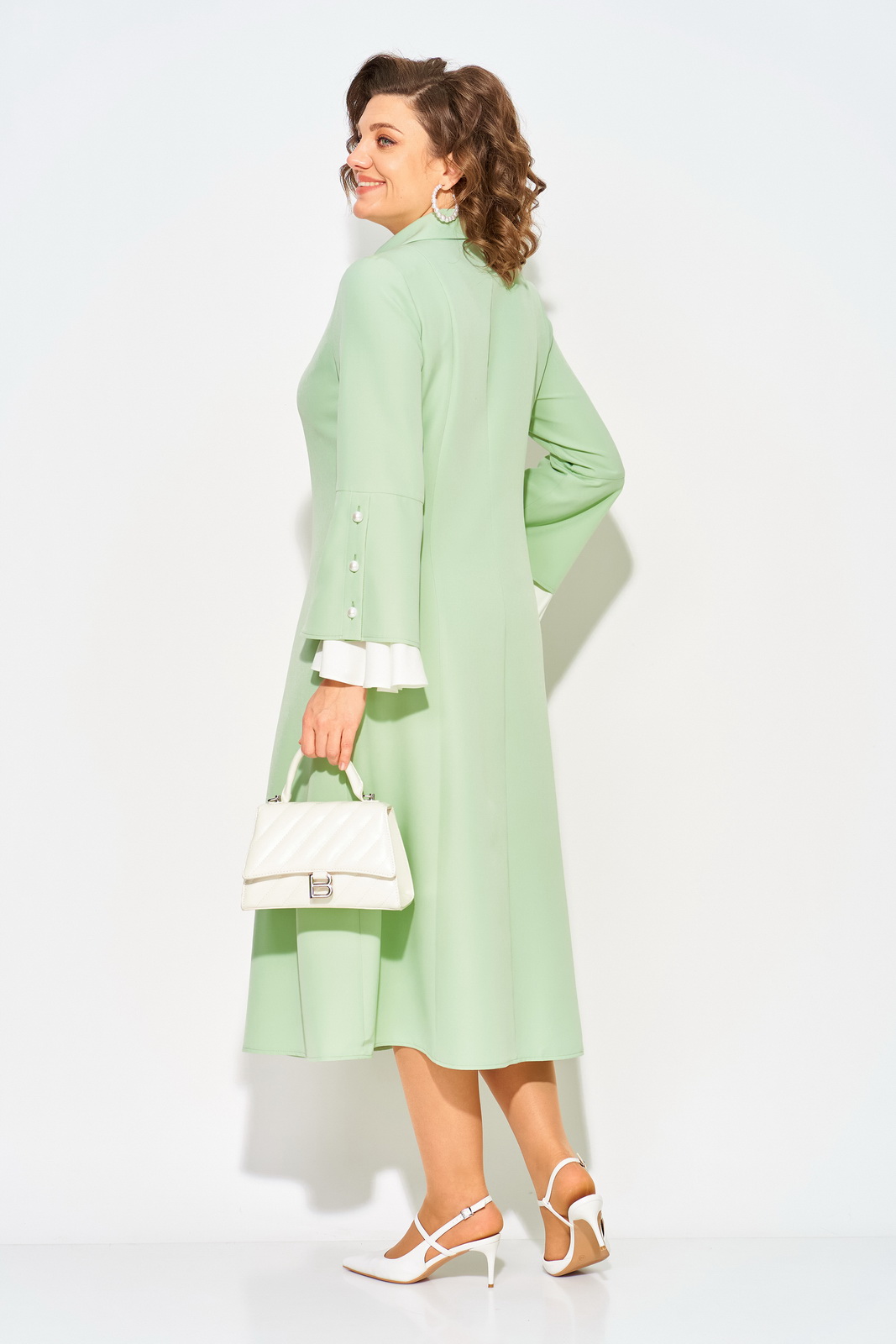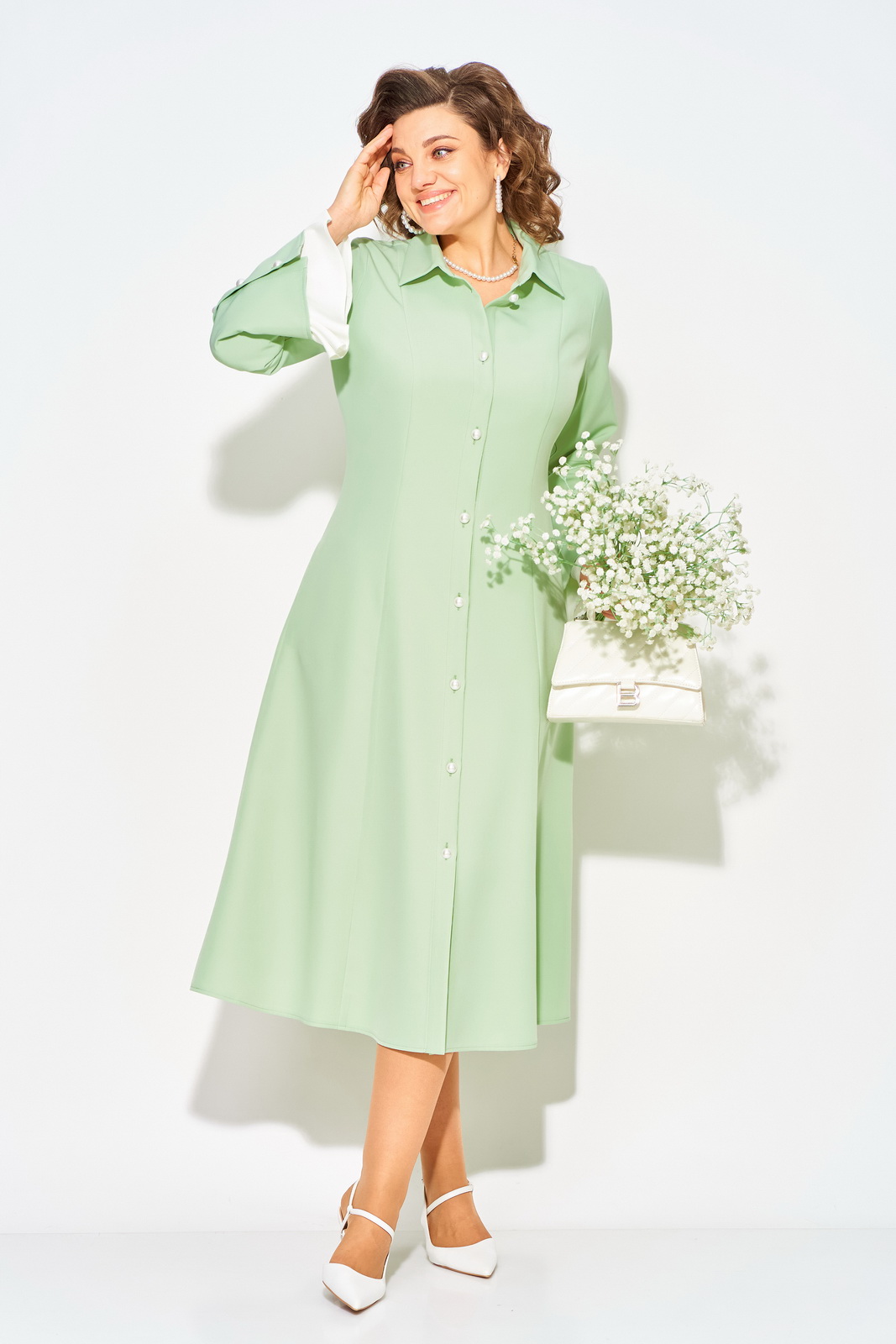 Описание: Нежное и романтическое, нарядное женское платье, длиной миди – станет отличным выбором для девушек и женщин, которые ценят комфорт и стиль. Модель полуприлегающего силуэта с продольными рельефами по полочке и спинке. Воротник отложной на цельнокроеной стойке. Застежка центральная на петли и пуговицы на планке. Эффектный длинный рукав, слегка расклешен к низу; имеет рюшу из отделочной ткани нежно-жемчужного цвета. Пуговицы под жемчуг украшают планку рукава и изделия! В платье имеются боковые карманы. Станьте обладательницей винтажного платья, чтобы подчеркнуть свою индивидуальность и создать стильный образ.