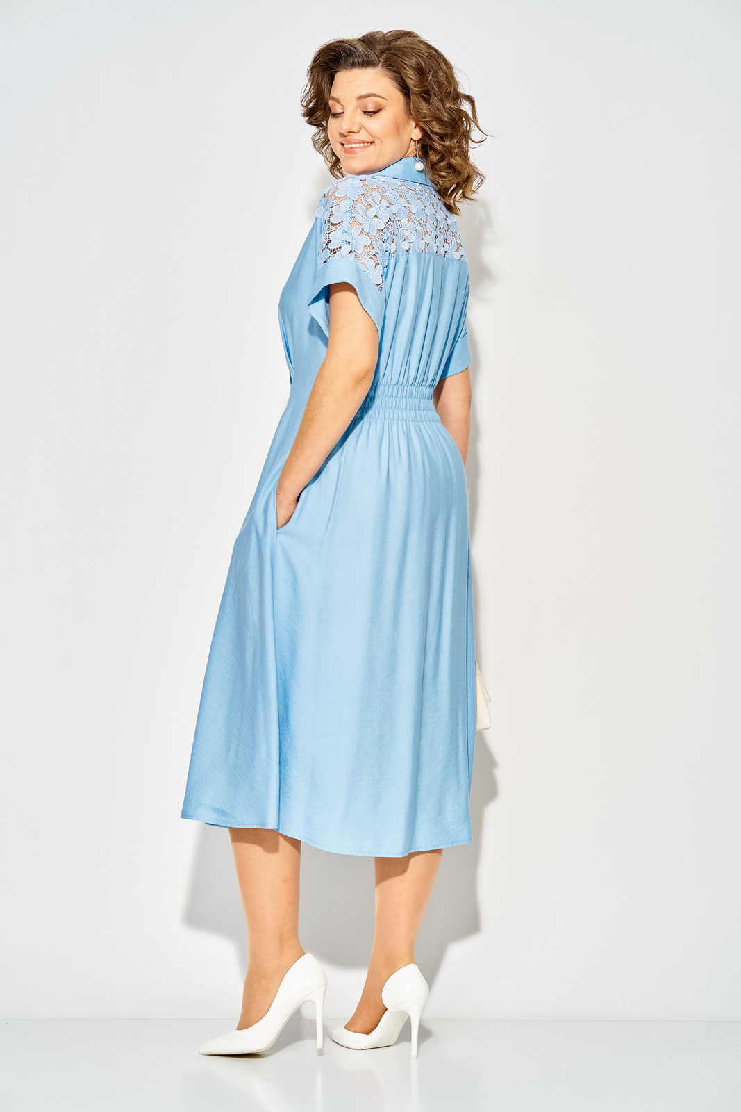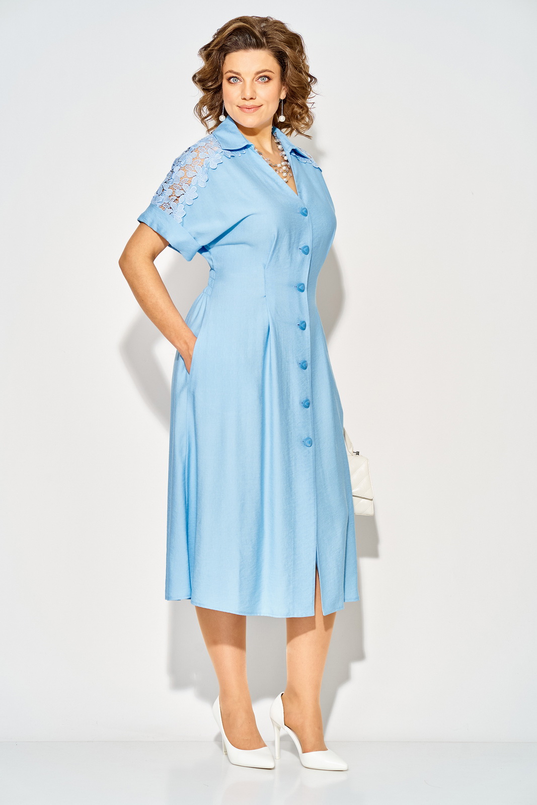 Описание: Эффектное весеннее летнее нарядное женское платье, выполнено из вискозного полотна со вставками из хлопкового кружева. Модель полуприталенного силуэта, с цельнокроеным спущенным рукавом и притачным манжетам по низу. Линия кокетки, переходящая на спинку оформлена вставкой из декоративного кружева. V-образный вырез горловины оформплен небольшим отложным воротником. Застежка – центральная на петли и пуговицы. По талии заложены декоративные складки. Спинка в области талии присборена на резинку, что обеспечивает более комфортное прилегание.