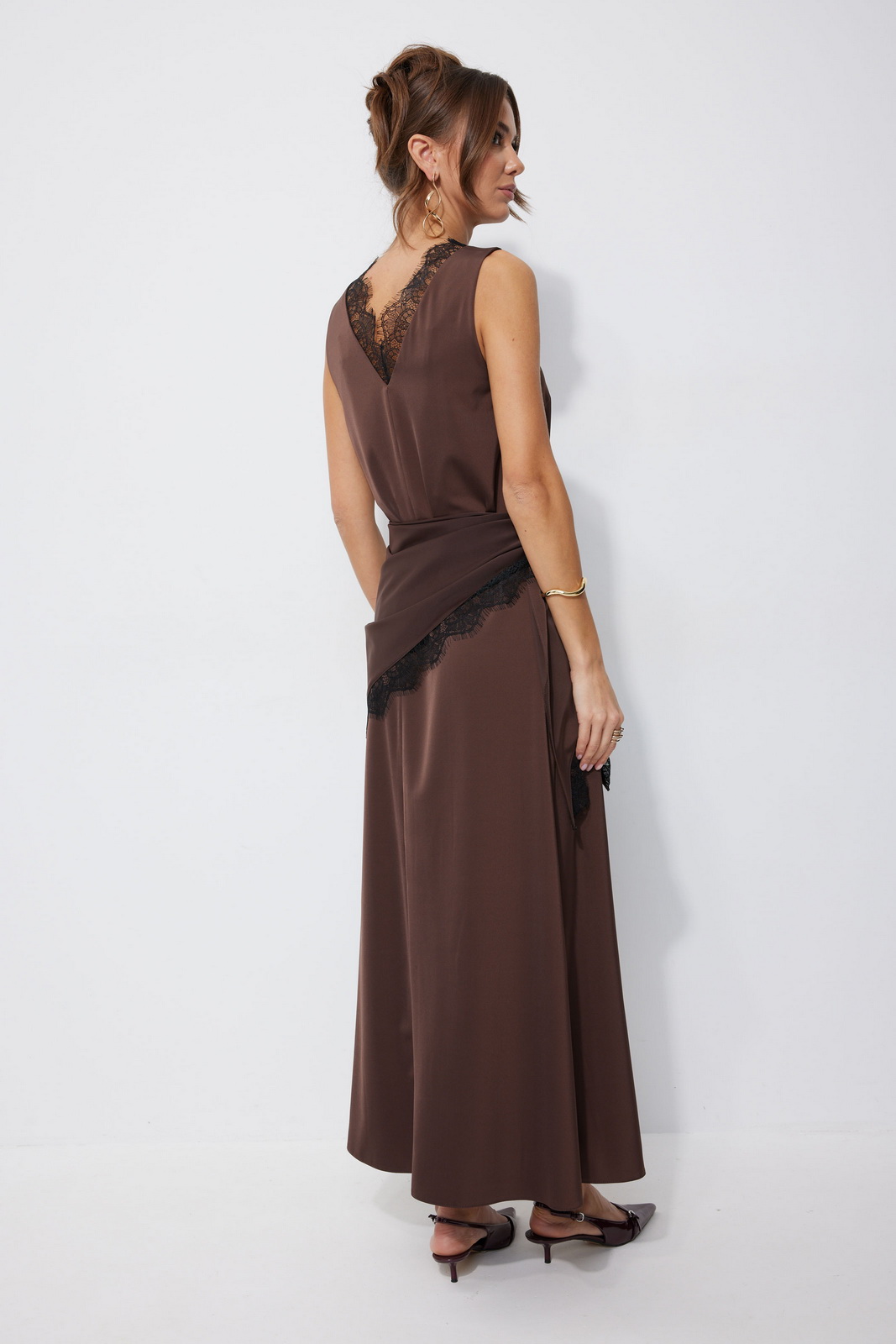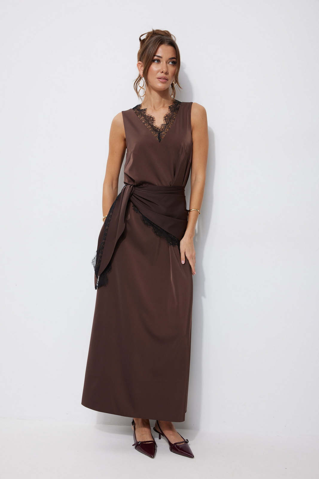 Описание: Нарядное платье из струящейся ткани, длина макси. Платье свободного кроя, прямое, расширенное к низу. С глубоким V-образным вырезом горловины по переду и спинке, декорированным французским кружевом. По переду нагрудные вытачки. Без рукава. Платье дополняется платком из основной ткани. Платок декорирован по двум срезам французским кружевом. Обращаем Ваше внимание, что кружево может незначительно отличаться от фото.