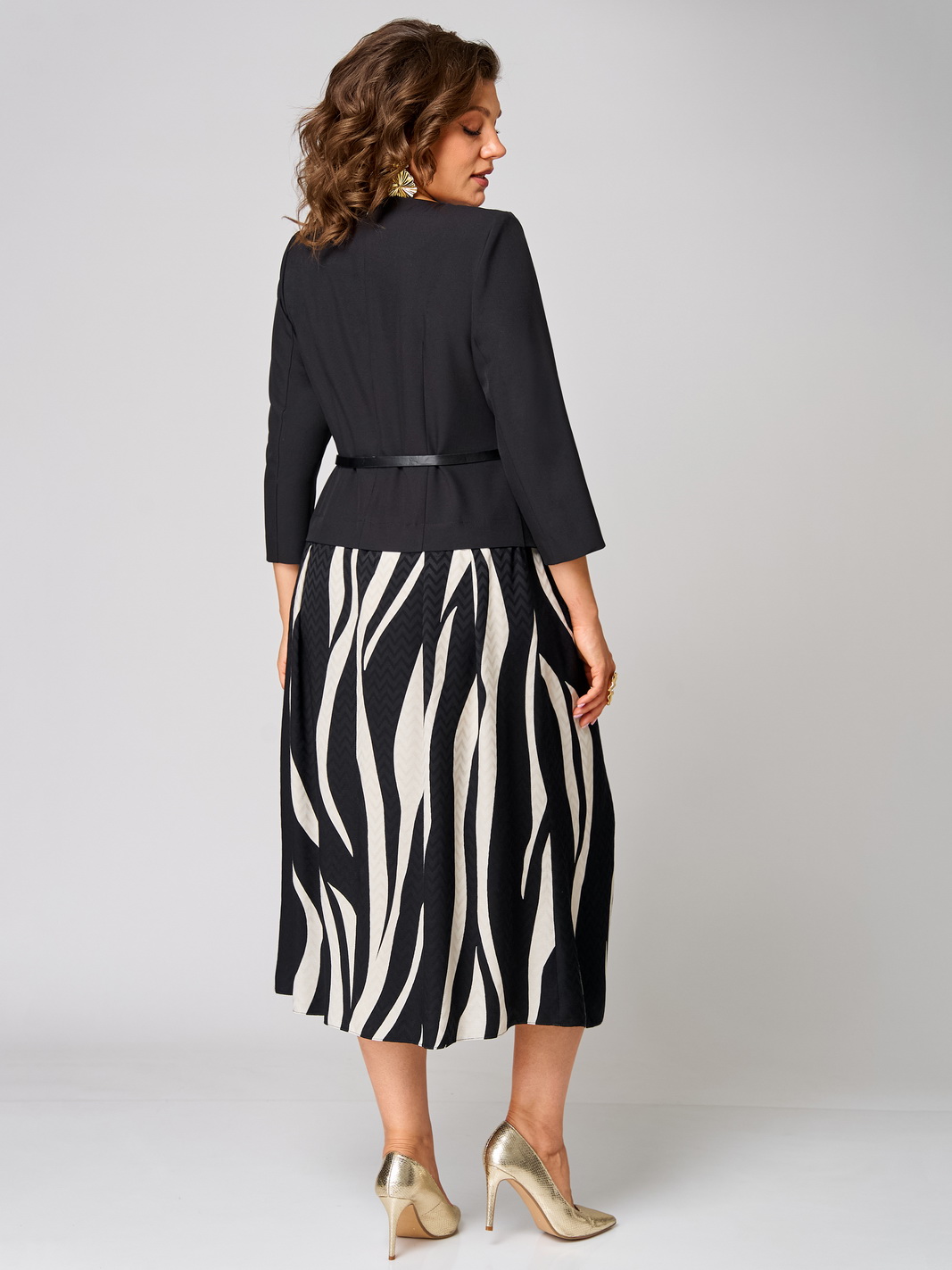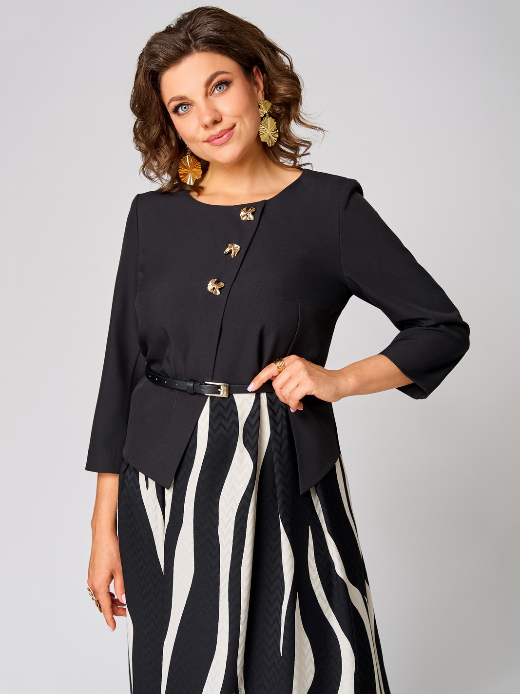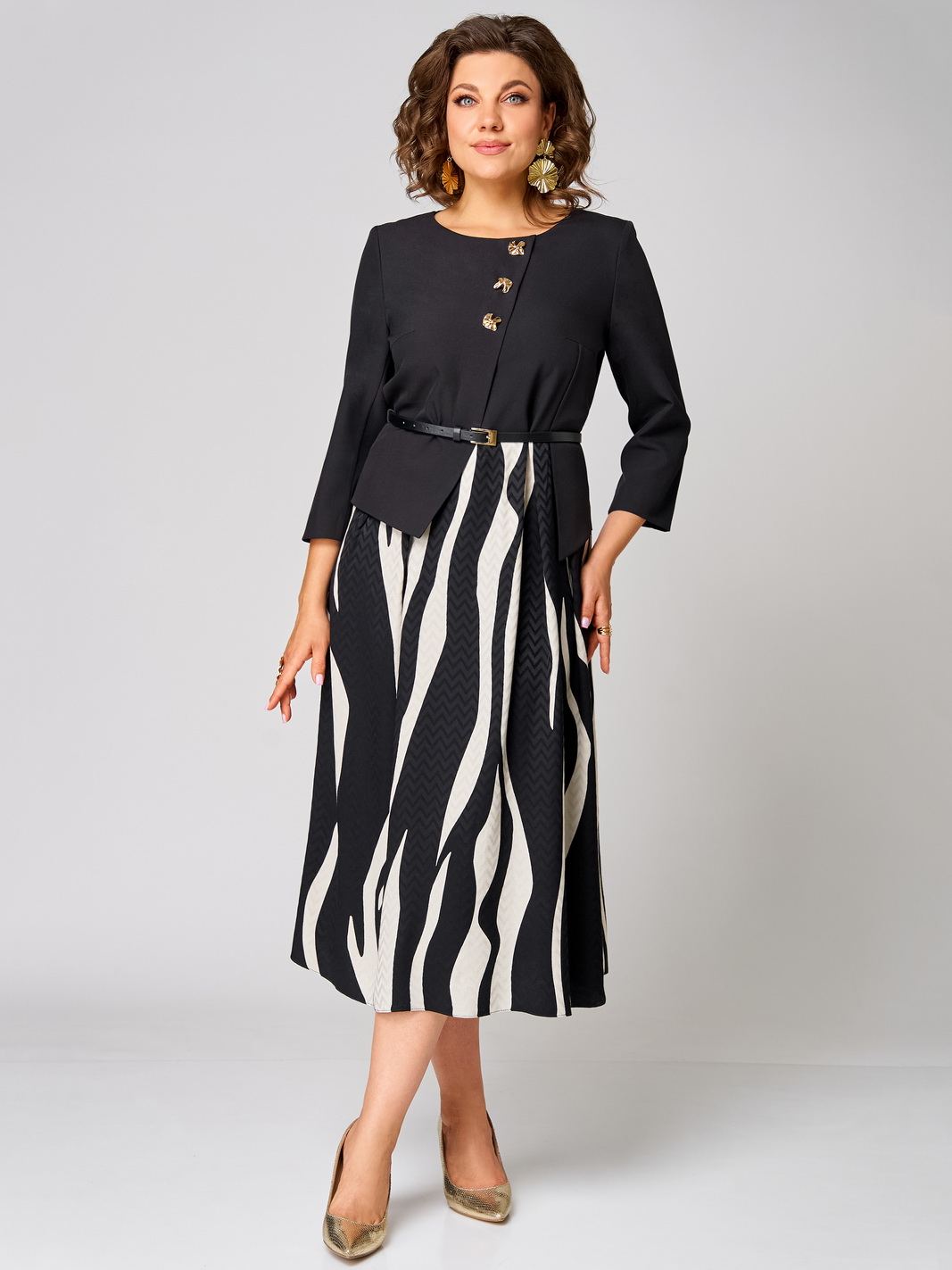 Описание: Платье женское А-силуэта из двух разных фактур тканей, отрезное по линии талии, без подкладки. Округлый вырез горловины. Верх платья выполнен из костюмной ткани. По переду застрочены нагрудные вытачки. По правой части переда ассиметричная складка на 3 пуговицы и петли. По левой части переда от нагрудной вытачки имеется отлетная деталь. Сина со средним швом и застежкой на потайную тесьму-молнию. Рукав втачной двухшовный , длина 49см. Юбка в платье выполнена из вискозы. По переднему и заднему полотнищу застрочены встречный складки. Длина платья 120см. Имеется съемный пояс с пряжкой.