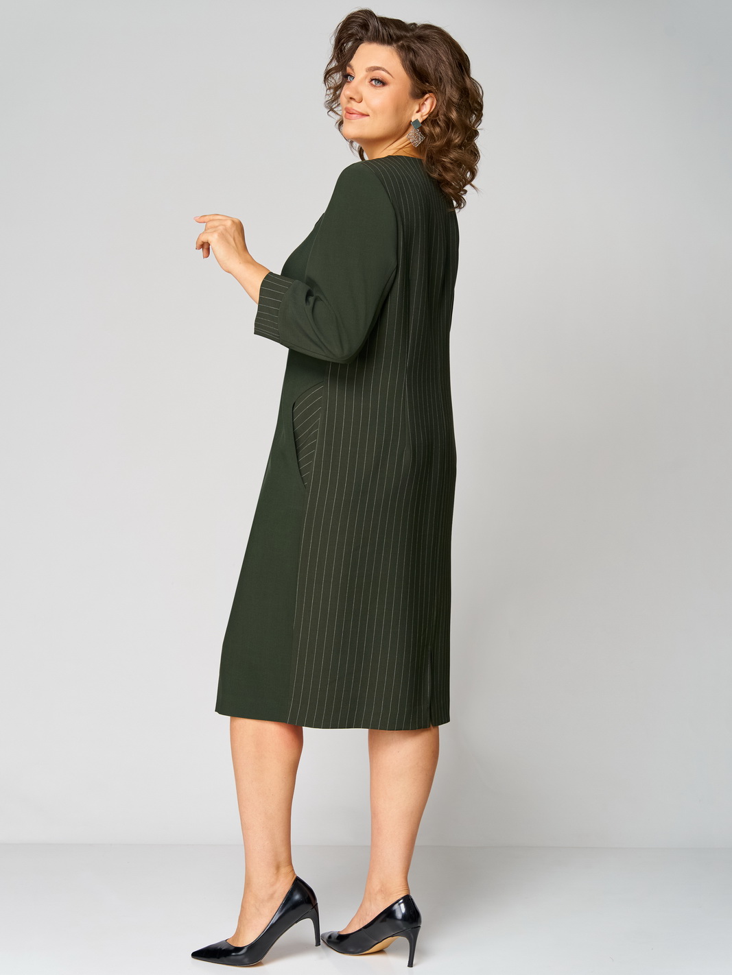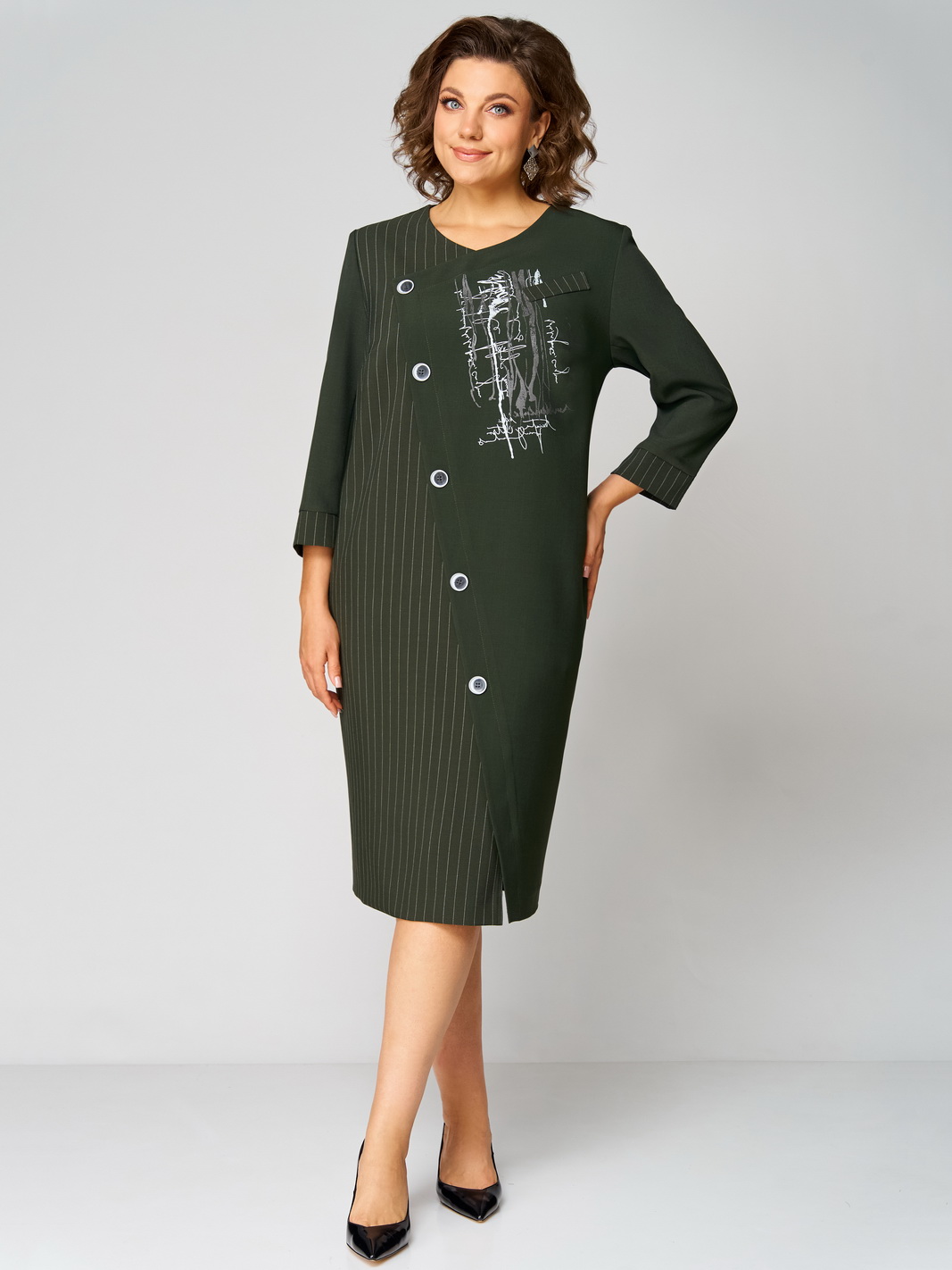 Описание: Платье свободного силуэта. По переду асимметричный подрез, имитирующий застежку. Спинка с потайной молнией в среднем шве, по низу разрез. Пи рукава из ткани компаньона. Карманы в боковых швах с фигурным входом. Украшение платья-печать и отделочные пуговицы