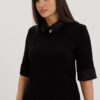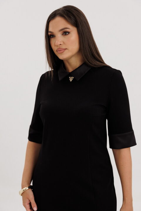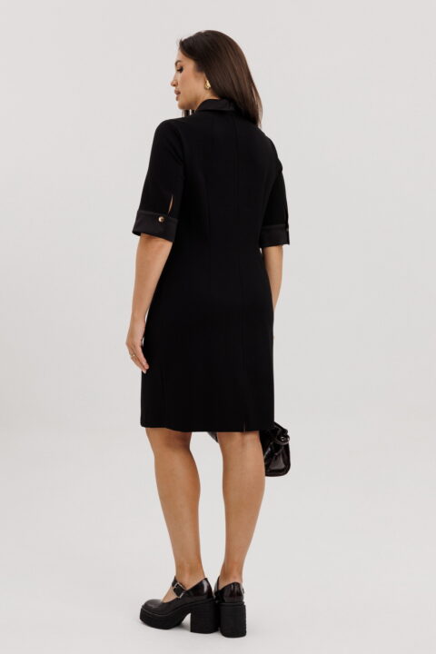 Детали: длина до колена, рукав ¾, строгий воротник с акцентной деталью.