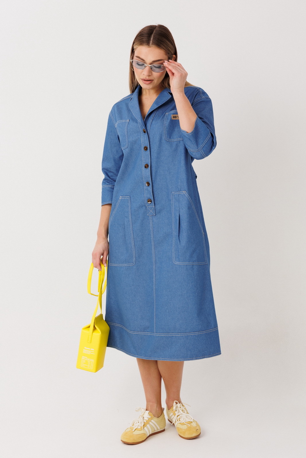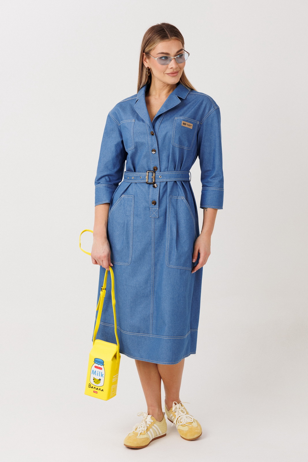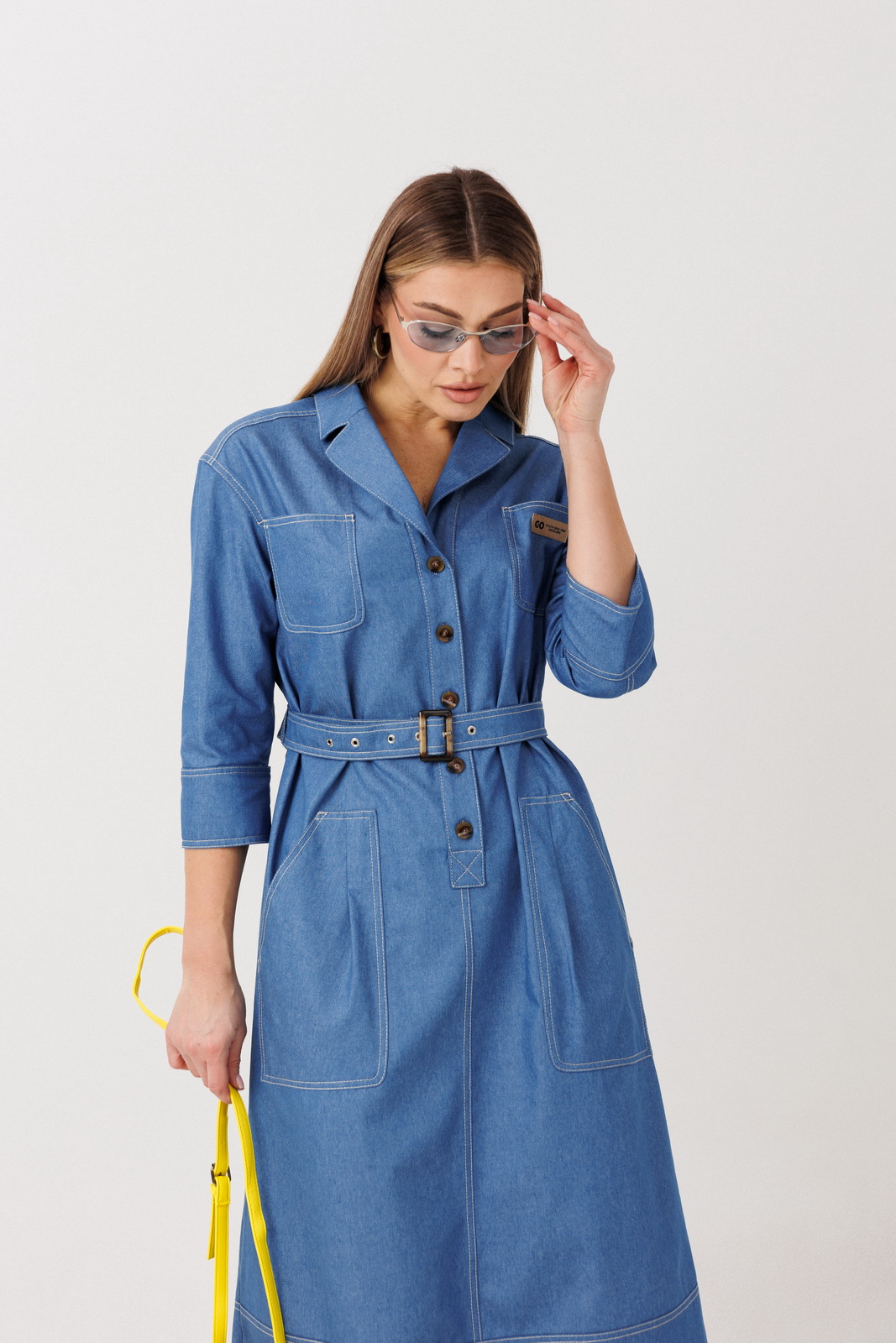 Описание: Элегантное платье прямого силуэта в рубашечном покрое выполнено из мягкого плательного денима на основе хлопка. Материал комфортный, дышащий и пластичный — идеально подходит для повседневной носки. Конструктивные особенности модели: классический рубашечный воротник и застёжка на пуговицы; прямой силуэт, создающий стройную вертикаль; спинка с центральным швом и отрезной кокеткой, обеспечивающей аккуратную посадку по плечам; съёмный пояс, позволяющий подчеркнуть талию или носить платье свободно; функциональные накладные карманы для удобства и актуального casual-акцента.