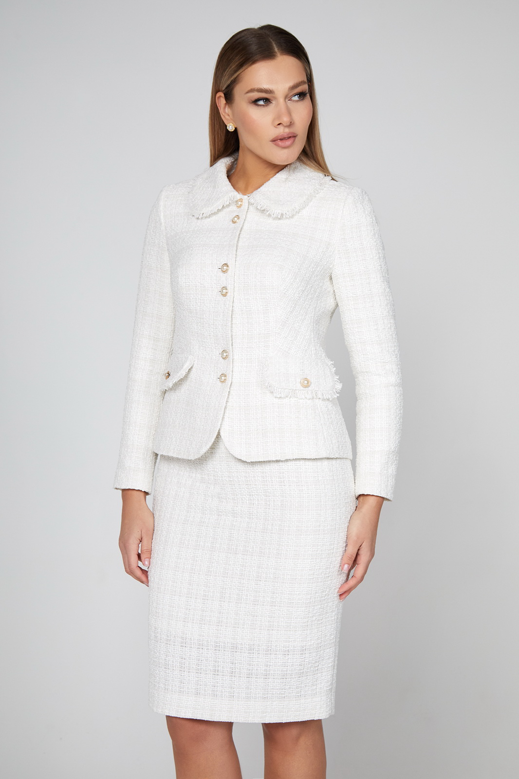 Описание: Полуприлегающий силуэт и широкий отложной воротник, сочетающийся с клапанами отделочной тесьмой в виде бахромы, делают этот жакет особенно женственным, а красивые пуговицы с жемчужинами являются тонкими деталями дизайна, придающими изделию особое очарование. Фоном для такого декора была выбрана красивая мягкая однотонная испанская ткань в стиле шанель. Рукава втачные двухшовные. На подкладке.