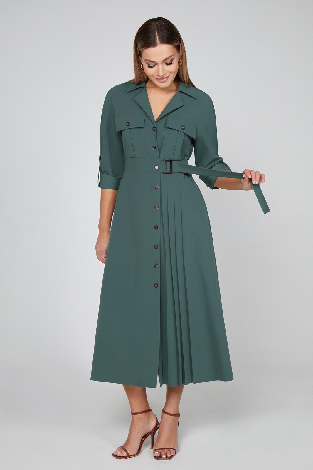 Описание: Просто фантастика! Это изысканное платье длиной мидакси с женственным кроем идеально дополняется аккуратным воротником с лацканами и пояском с пряжкой. Дизайн дополняется карманами с клапанами на груди, спущенной линией плеч с притачными рукавами с манжетами, которые при желании можно подвернуть и зафиксировать при помощи пат и пуговиц. Застежка на пуговицы по всей длине придаёт ему яркий штрих, а карманы в боковых швах добавляют функциональности. Вертикальные складки по детали переда завершают шикарный образ. Высококачественная испанская эластичная ткань также гарантирует износостойкость.