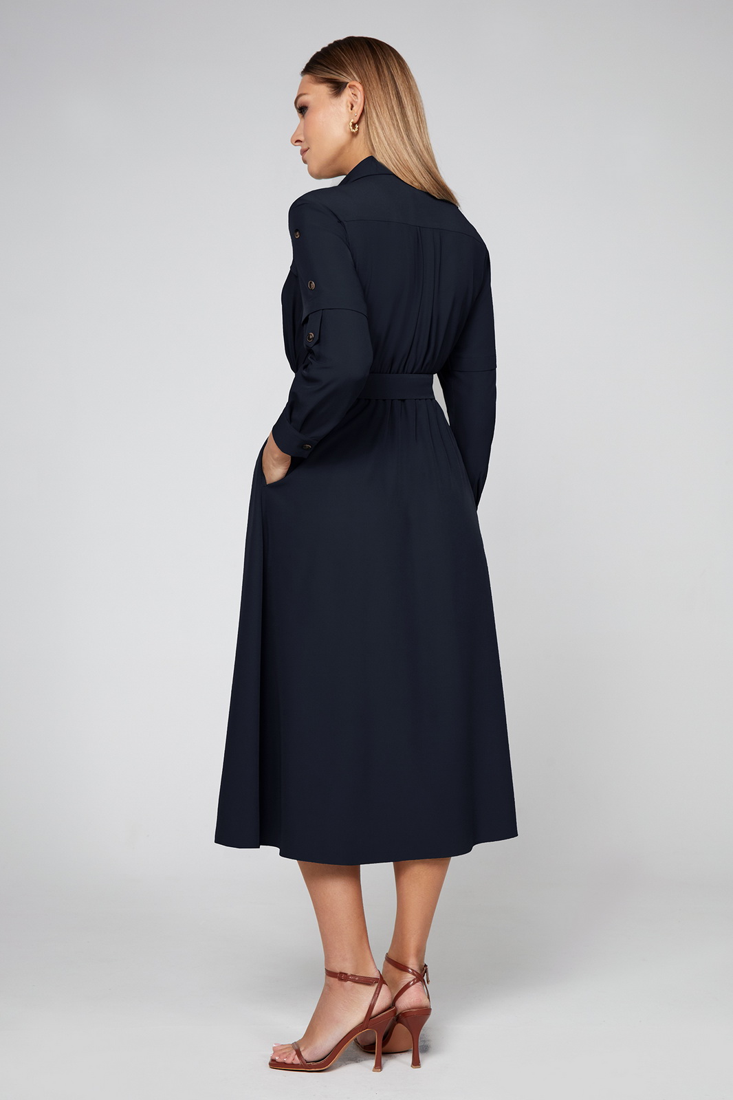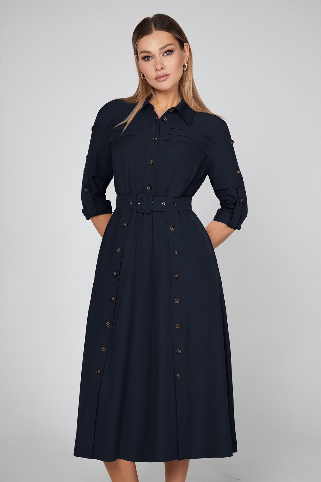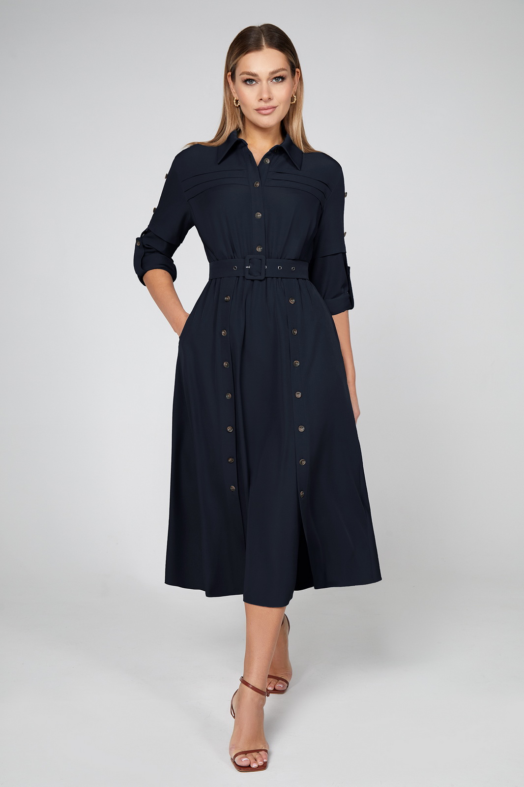 Описание: Стильное платье-рубашка с длинным рукавом и расклешенным кроем — идеальное сочетание легкости и элегантности. Модель со спущенной линией плеч выполнена из приятной вискозной испанской ткани и дополнена интересными элементами, придающими ей спортивный и динамичный характер. Отложной воротник и планка на пуговицах добавляют очарования, а рукава с манжетами можно закатать и зафиксировать при помощи паты и пуговицы, для создания непринужденного образа. Вертикальные складки , декоративные планки по юбке платья и отделочные пуговицы подчеркивают оригинальность этой модели, а карманы в боковых швах добавляют функциональности. Скрытая резинка на талии обеспечивает удобную посадку по фигуре, а пояс в тон с D-пряжками красиво подчеркивает талию.