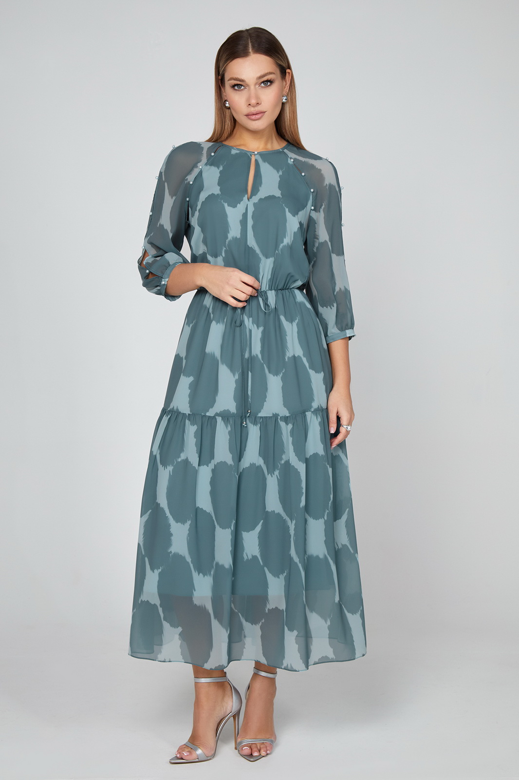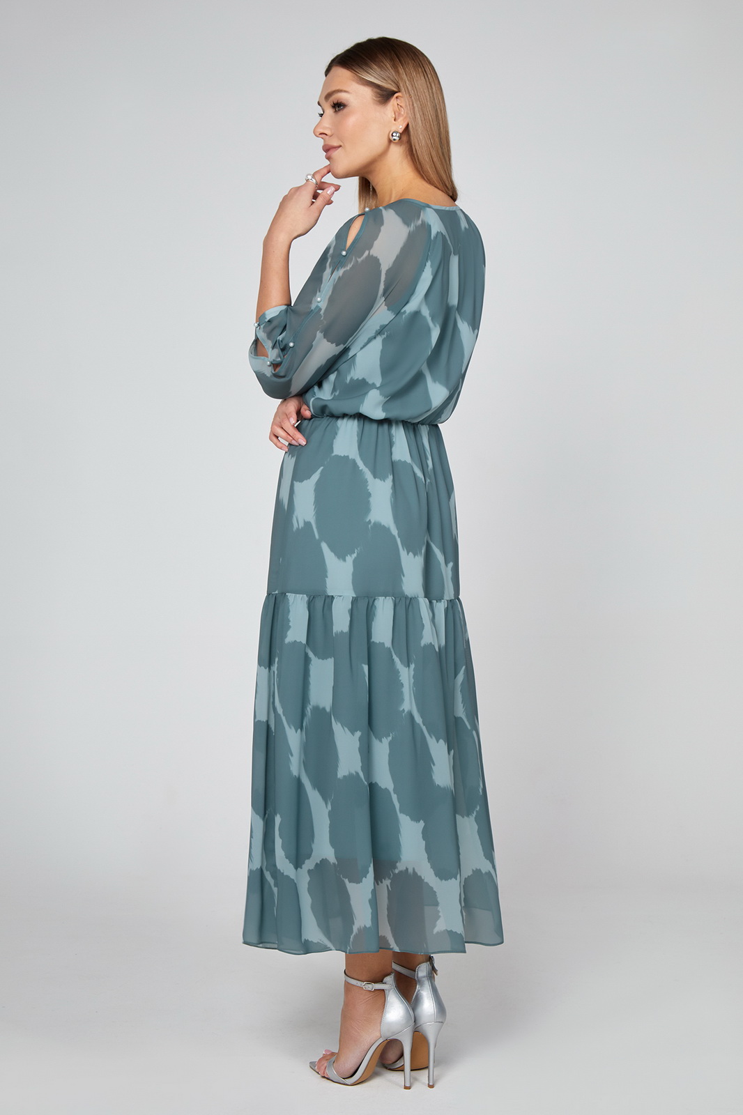 Описание: Изящное платье длины мидакси из приятного, струящегося польского шифона с абстрактным принтом. Перед со щелевидным вырезом горловины и застёжкой на навесную петлю и пуговицу-бусину. Модель отрезная по талии, со скрытой резинкой, обеспечивающей удобную и красивую посадку на фигуре и декоративной кулисой, добавляющей оригинальности модели. Укороченные, полупрозрачные рукава-реглан и перед лифа дополнены эффектными вырезами с декоративной фурнитурой. Летящая юбка добавляет силуэту динамики, а благодаря подкладке из 100% вискозы Вы будете чувствовать себя комфортно. Модная изюминка для самых разных случаев!