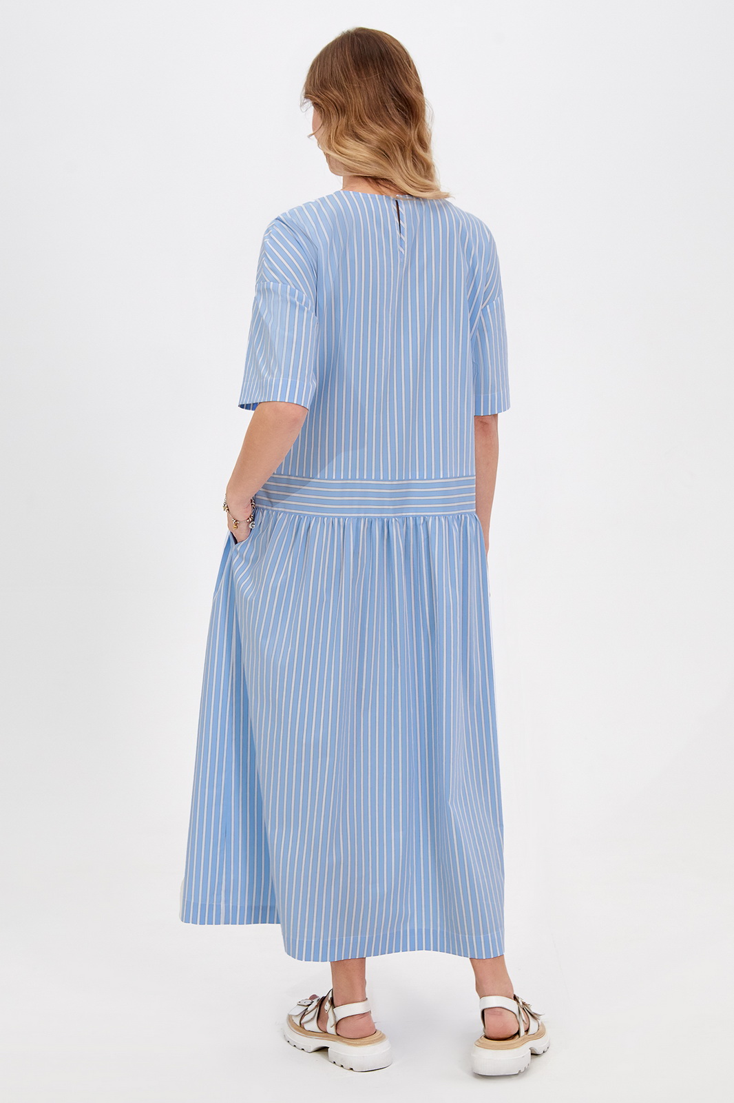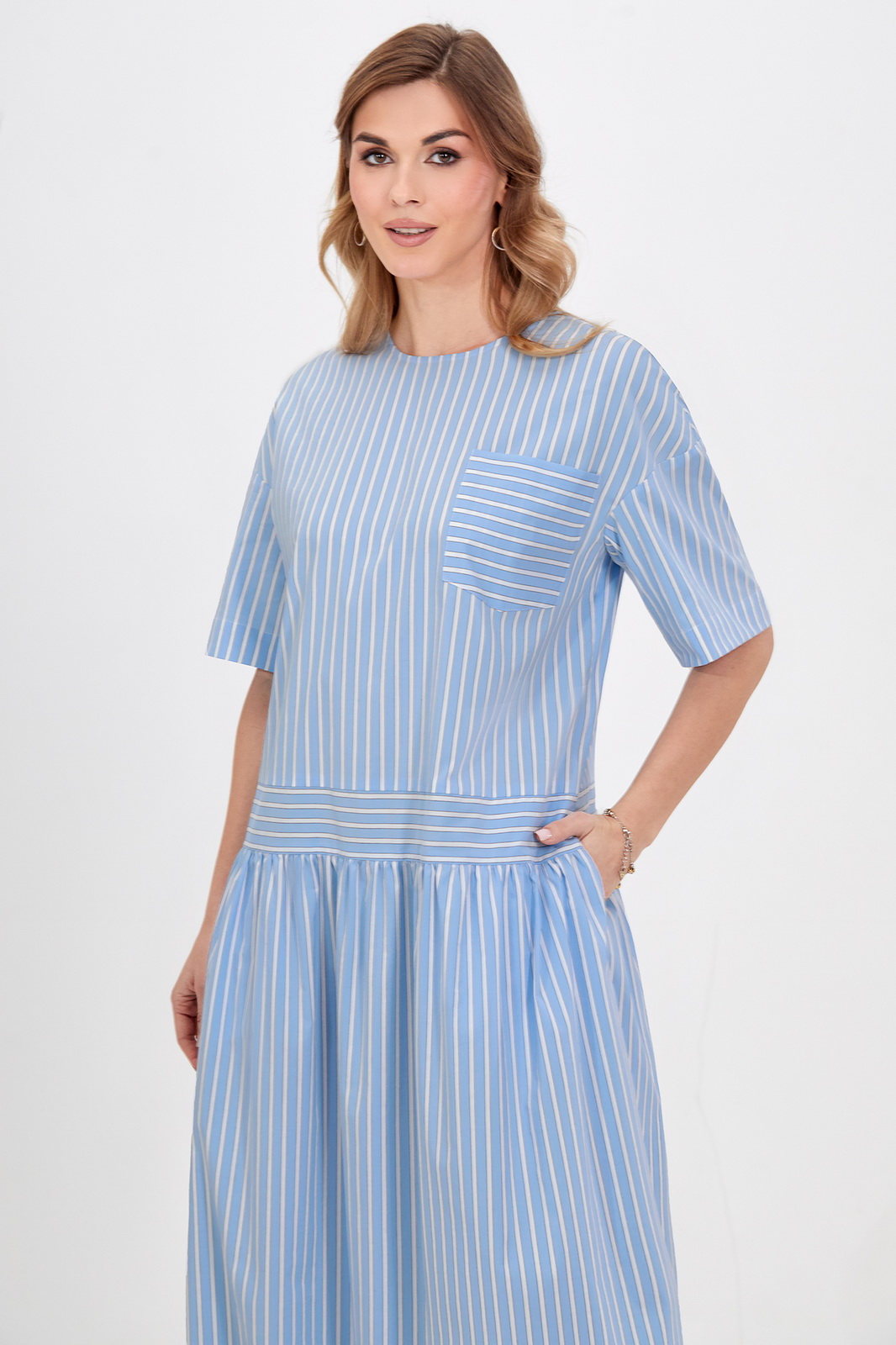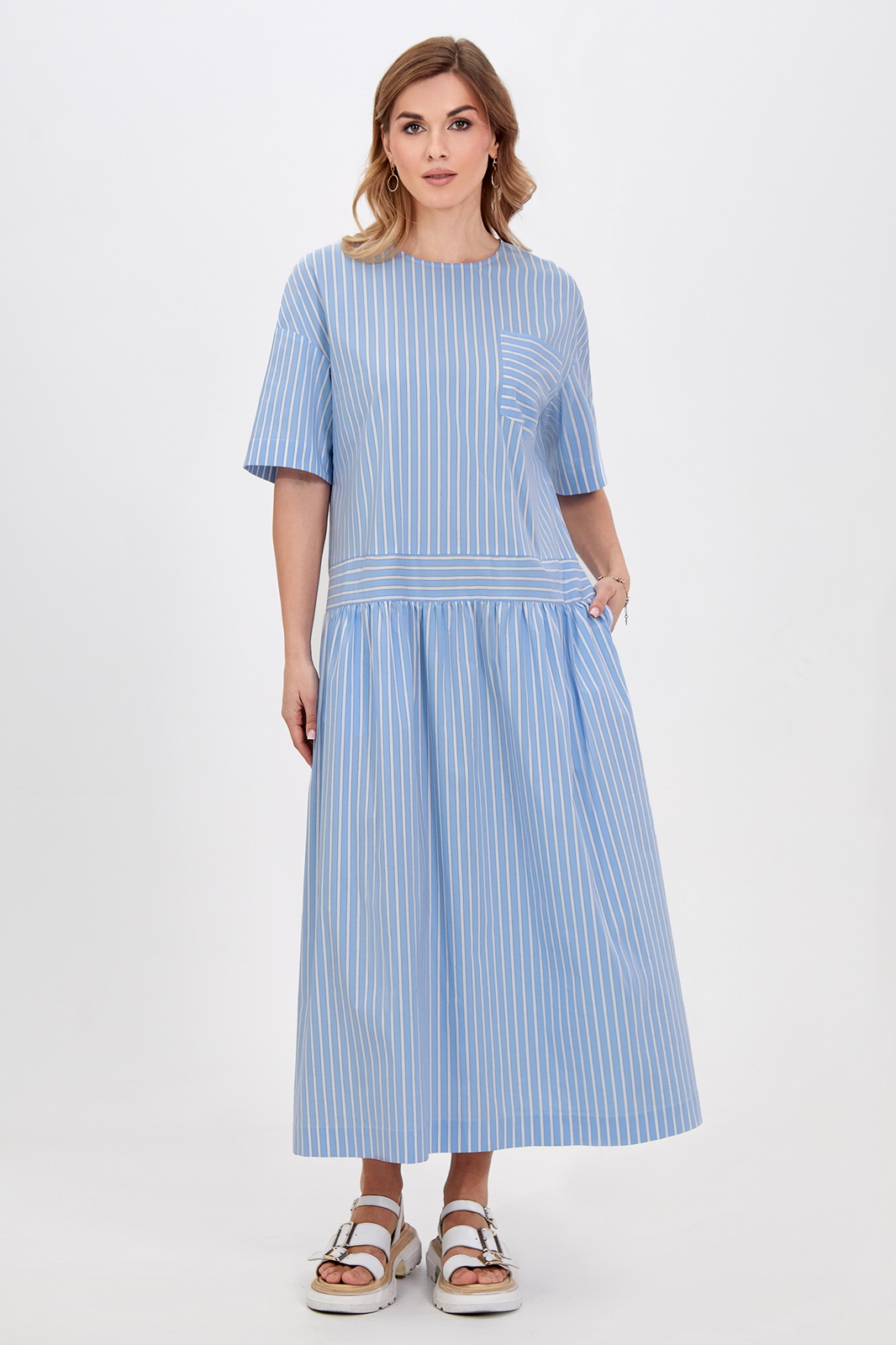 Описание: Это платье свободного кроя оптимально подойдет для создания комфортных и стильных кэжуал образов. Материал с высоким содержанием хлопка отлично пропускает воздух и приятен для кожи. Модель с округлой формой горловины со щелевидной застёжкой по спинке на навесную петлю и потайную пуговицу, со спущенной линией плеч с притачными рукавами, фигурным отделочным карманом и функциональными карманами в боковых швах. Акцентным решением стала игра полоски, добавляющая модели больше динамики. Длина позволяет носить платье с обувью как на каблуке, так и на плоском ходу.