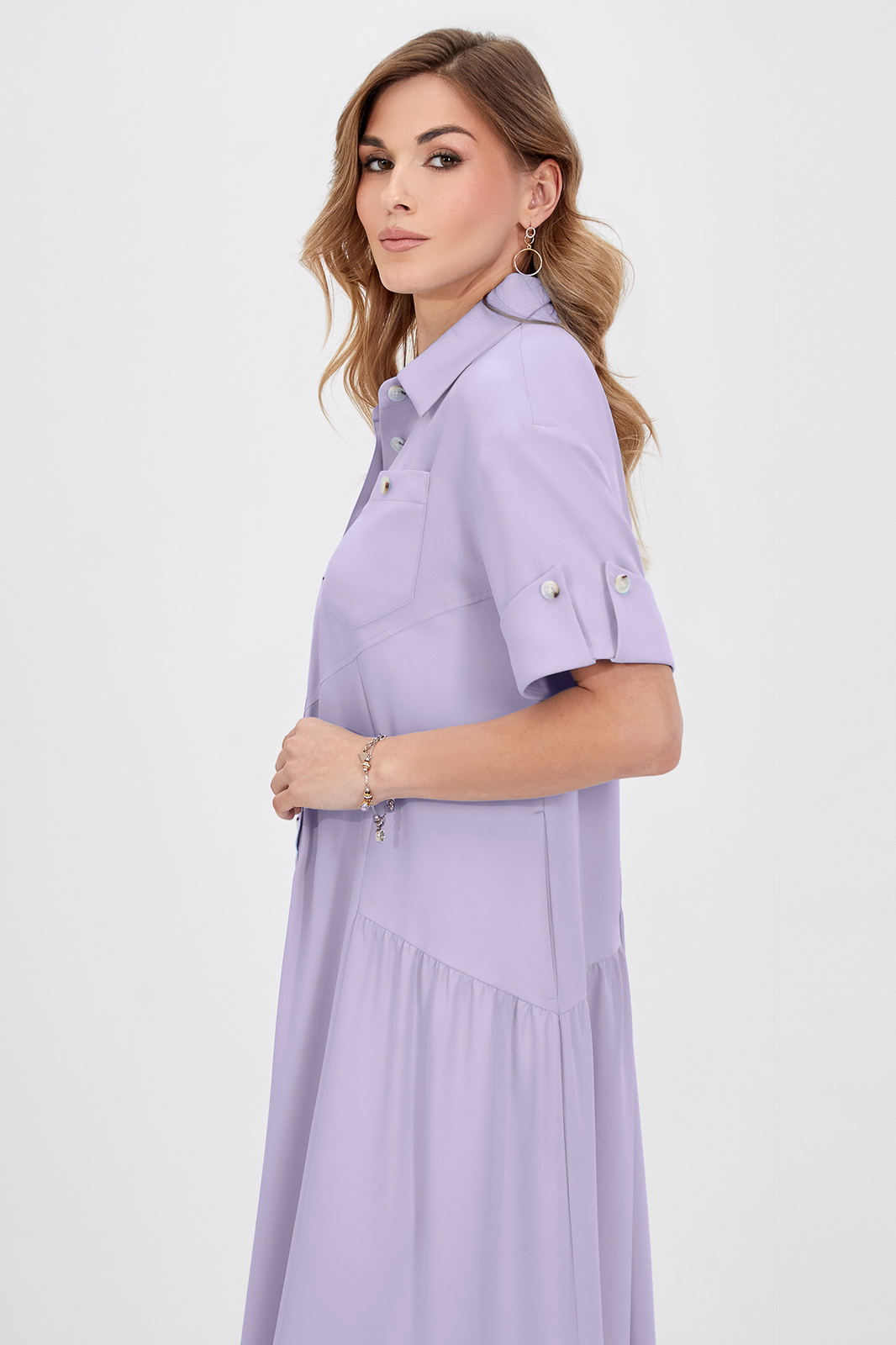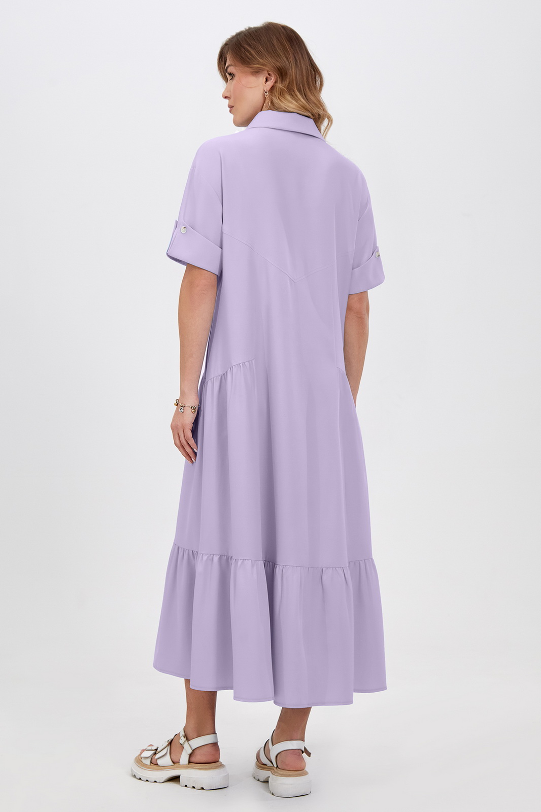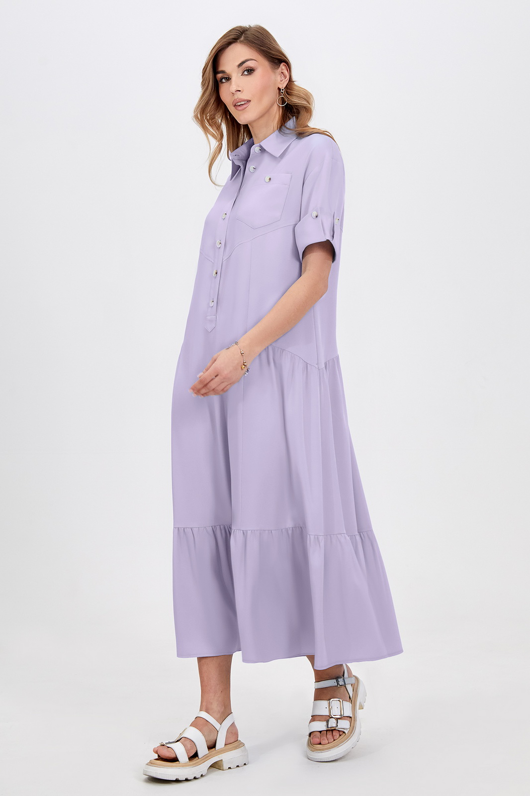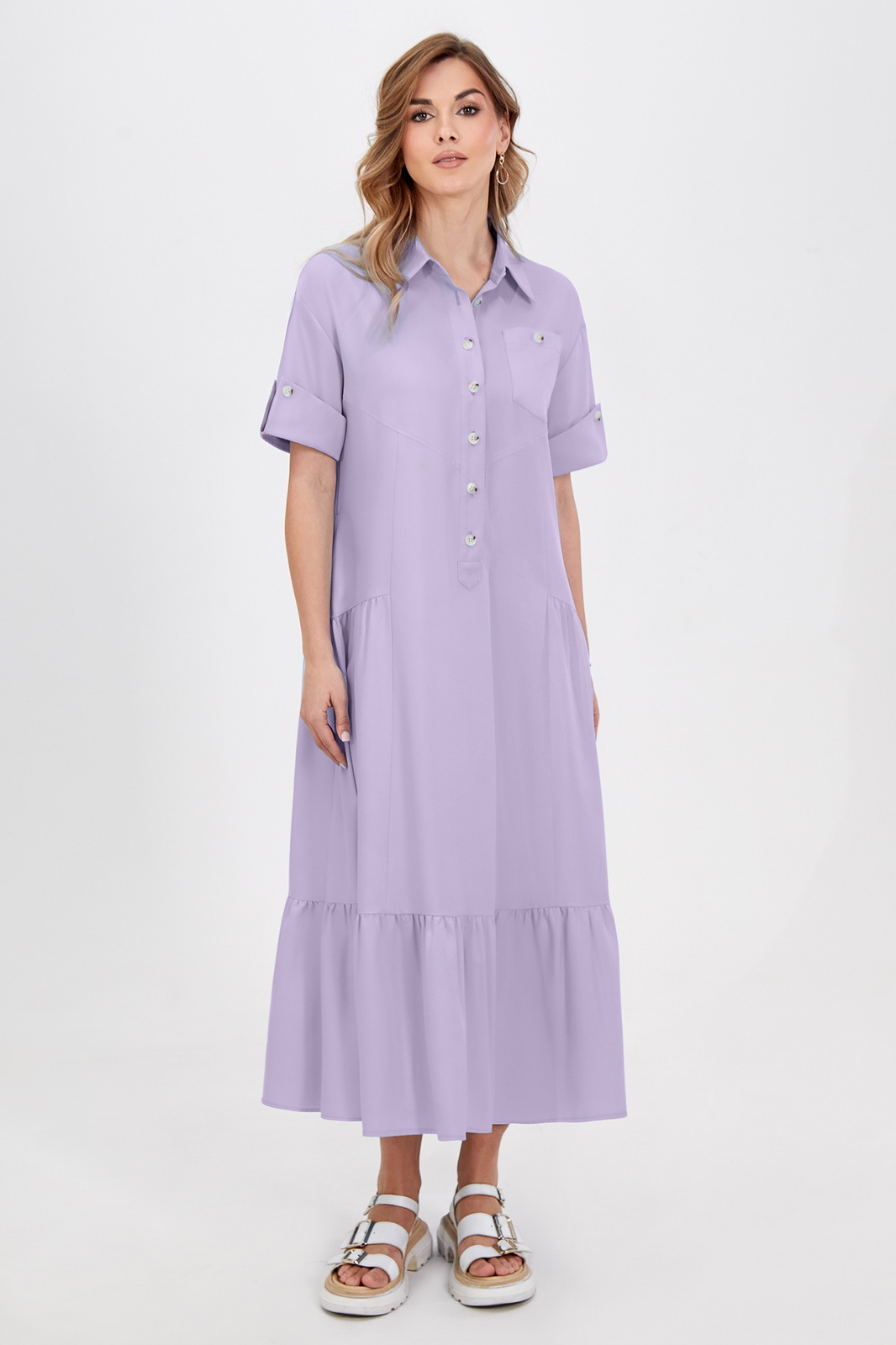 Описание: Это платье-рубашка с отложным воротником и короткими рукава с отделочными фигурными манжетами идеально впишется в городские образы в стиле кэжуал. Легкая вискозная ткань приятна для кожи и красиво струится во время носки. Застёжка на пуговицы позволяет регулировать глубину выреза. Модель свободного кроя дополнена оборками, отделочным карманом по переду и функциональными карманами в боковых швах. Длина позволяет носить платье как на каблуке, так и на плоском ходу.