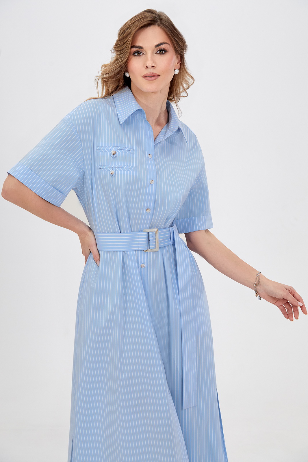 Описание: Это модное платье-рубашка с тонкими полосками,сочетает в себе шик и современность. Модная длина мидакси, разрезы в боковых швах и пояс,подчёркивающий талию- придают платью женственный характер. Рубашечный воротник добавляет образу грациозности, а застёжка на пуговицы по всей длине позволяет регулировать глубину выреза декольте. Нагрудные карманы-обманки и короткие рукава с отложными манжетами – завершают дизайн. Для придания комфорта использована приятная хлопковая ткань. Лучше не бывает!