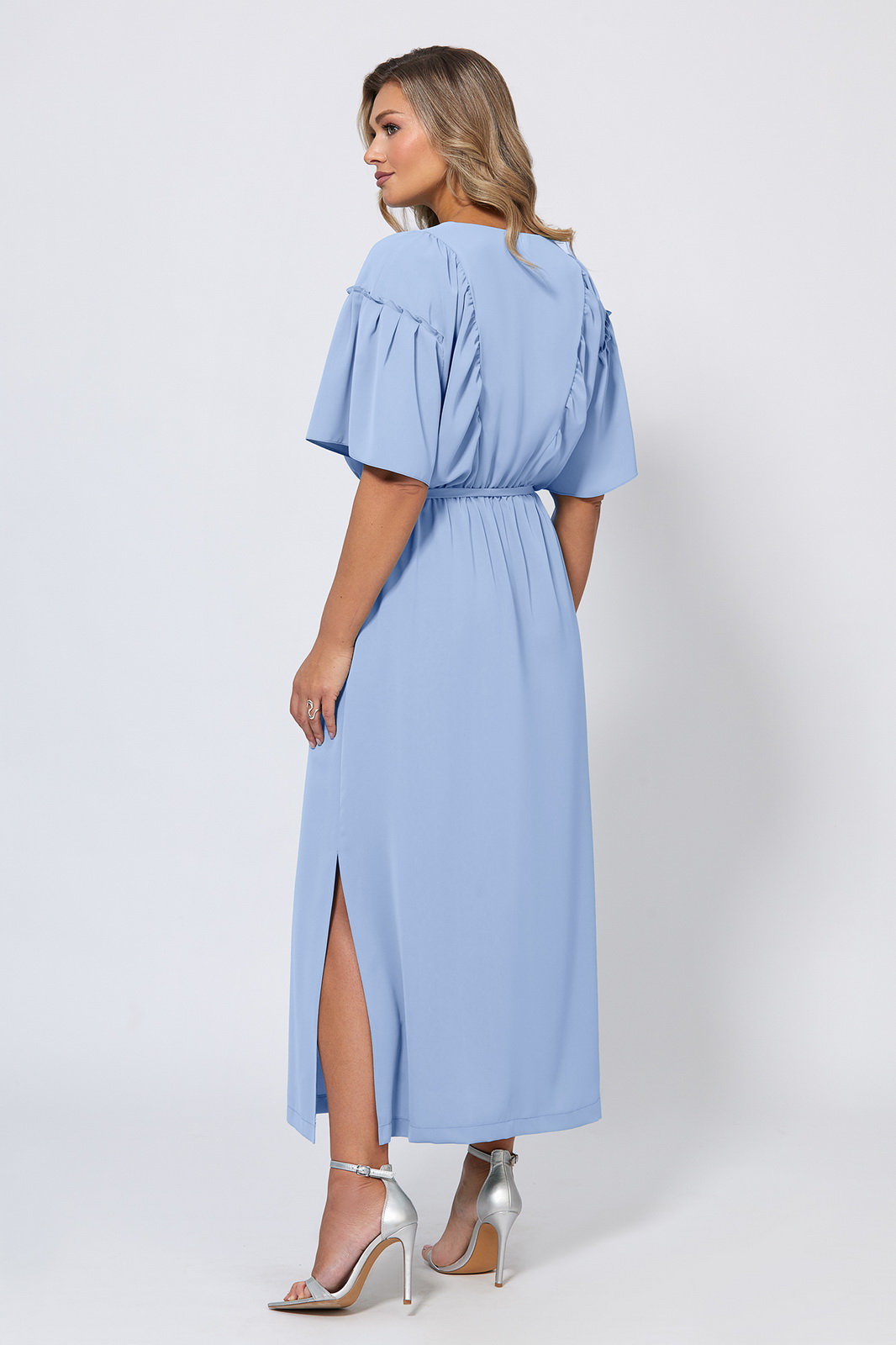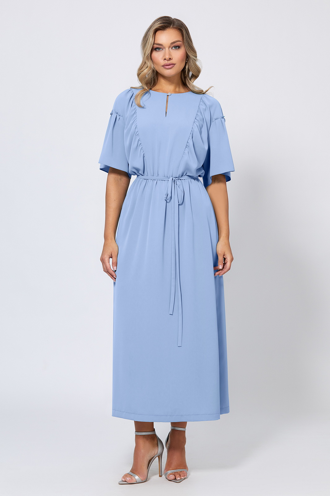 Откройте для себя наше уникальное платье длины мидакси, которое подойдёт для любой фигуры благодаря своему крою. Мягкая струящая ткань придаёт платью элегантный штрих, а разрезы по бокам создают захватывающий эффект, привлекающий внимание, и соблазнительно демонстрируют ваши ноги. Модель с округлой формой горловины с каплевидной застёжкой спереди на навесную петлю и ювелирную пуговицу, со спущенной линией плеч с притачными короткими рукавами, отрезная по линии талии, со скрытой резинкой, обеспечивающей удобную посадку. Мягкие драпировки придают силуэту женственные акценты, а линия талии красиво подчёркивается узким пояском-завязкой, который можно завязывать по своему усмотрению. Стильное заявление для особых моментов!