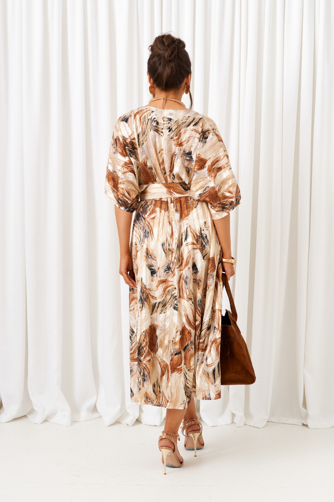Конструкция верхней части платья выполнена в свободном стиле со спущенной линией плеча и глубокими складками на линии талии.