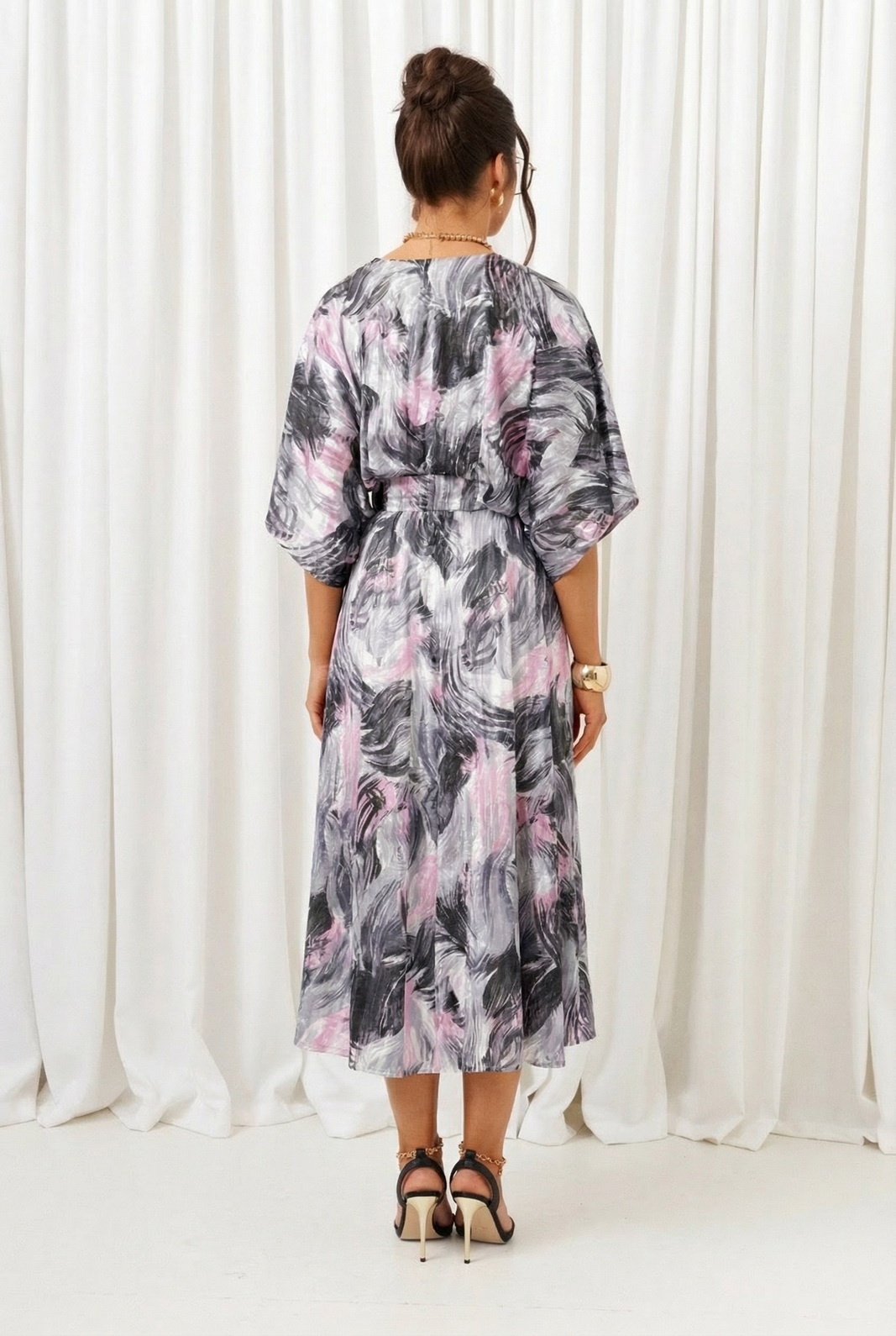 Конструкция верхней части платья выполнена в свободном стиле со спущенной линией плеча и глубокими складками на линии талии.