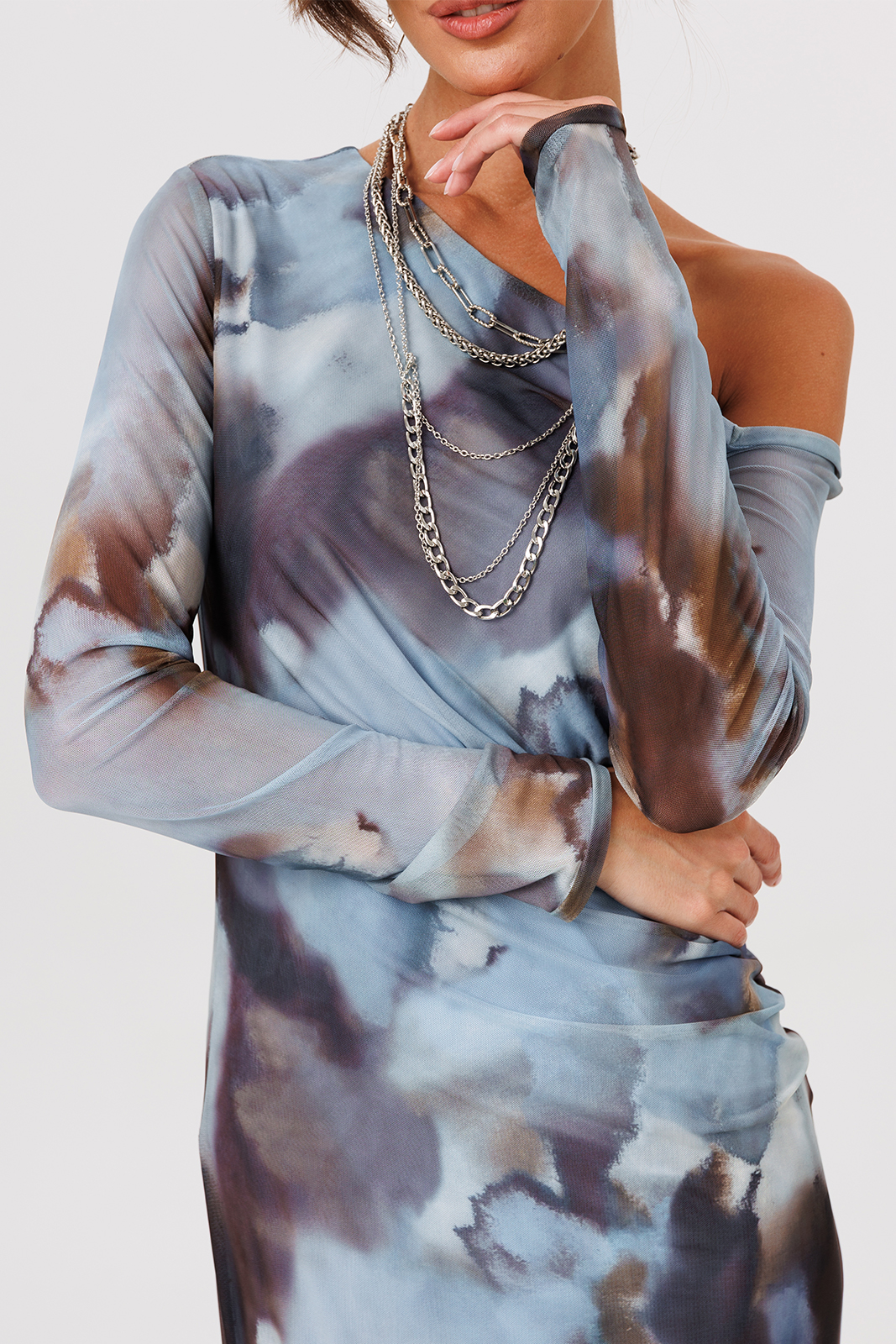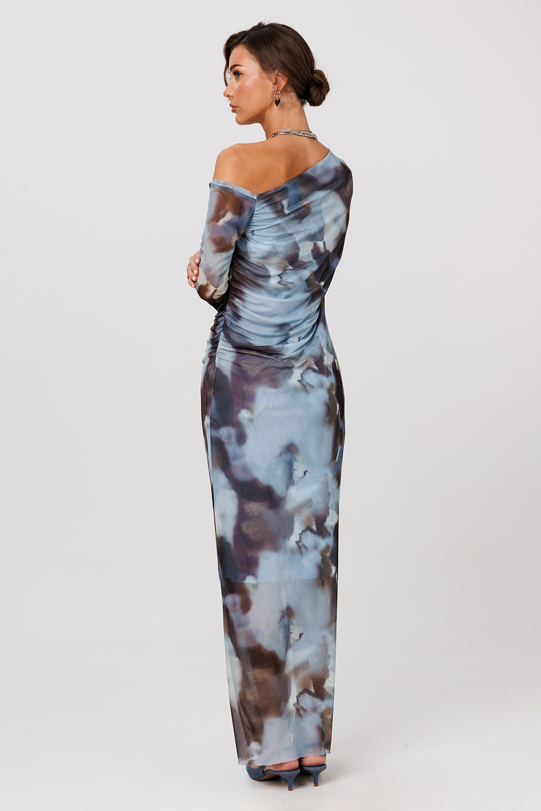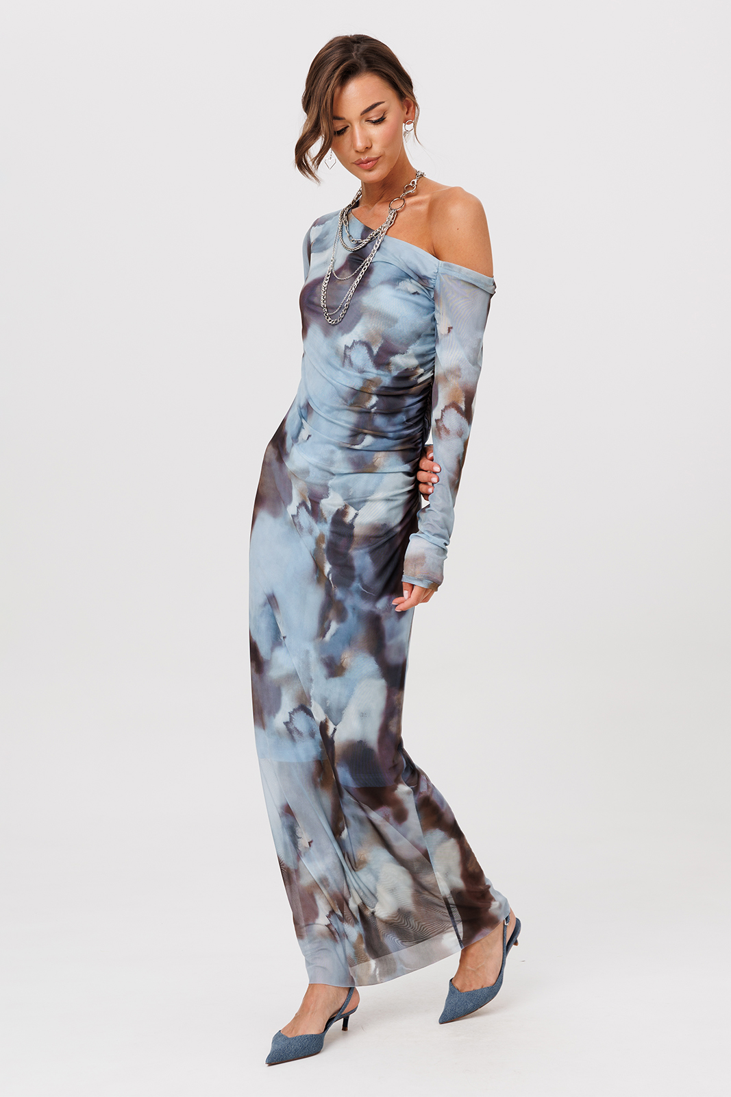 Описание: Платье длинное асимметричное, прилегающего силуэта с втачным рукавом по низу которого притчена планка из основной ткани. Платье со спущенной линией плеча на левом рукаве, по верху которого планка из основной ткани. Полочка и спинка со сборкой на левом боку. Платье на трикотажной подкладке.