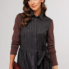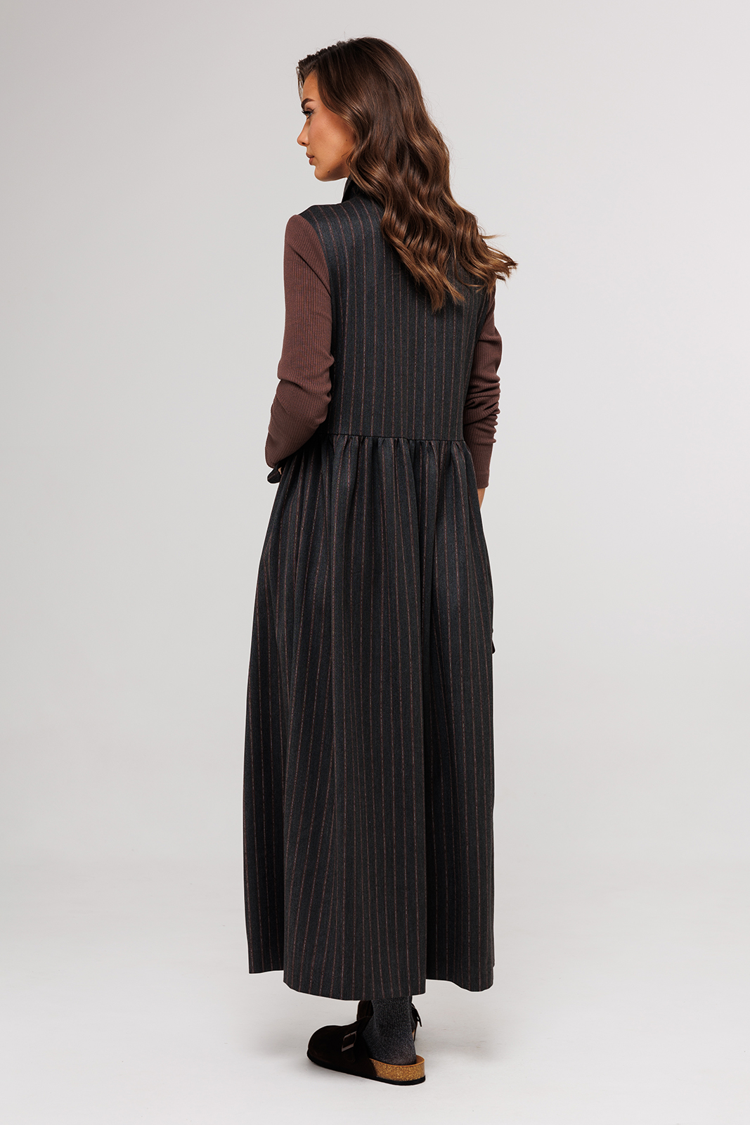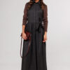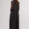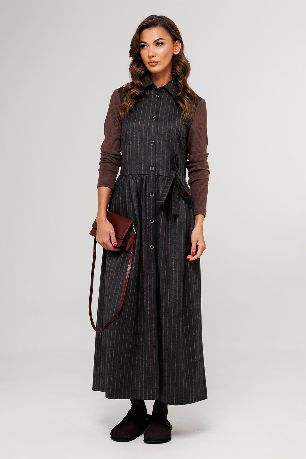 Описание: Платье длинное из костюмной ткани с втачным длинным одношовным трикотажным рукавом. Полочка с центральной застежкой на петли пуговицы и с нагрудными вытачками. По спинке нашивка “BUTER”. Платье отрезное по линии талии и со сборкой по шву притачивания низа. Воротник рубашечный отложной на стойке. По линии талии бант из основной ткани. Платье без подкладки.