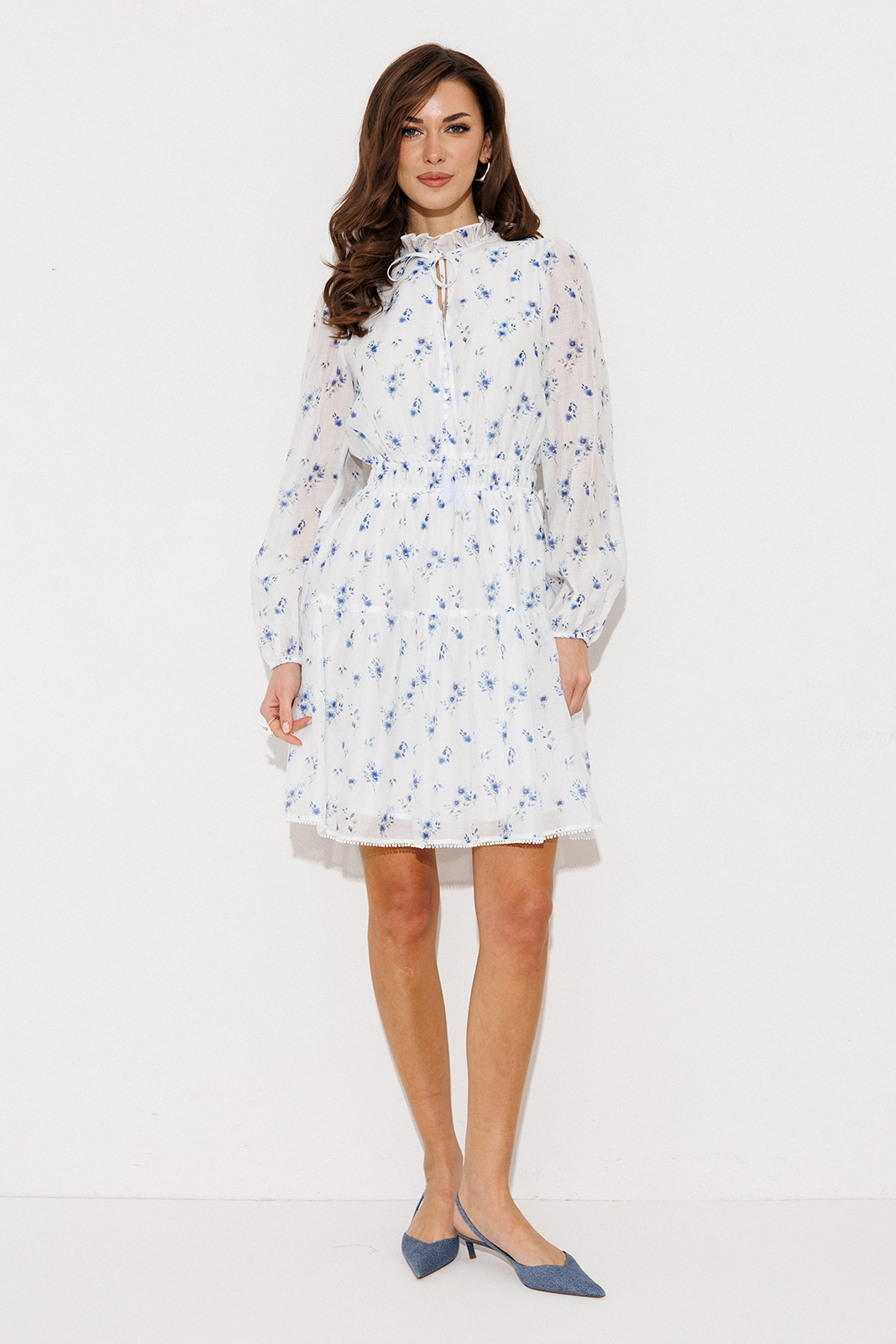 Описание: Платье полуприлегающего силуэта отрезное по линии талии, нижняя часть расширена, с воланом по низу. Платье с втачным рукавом со сборкой по окату и внизу на резинке. Лиф с V-образным вырезом и имитацией центральной застежкой на пуговицы. По спинке и переду вставка на талии с резинками. По горловине стойка с рюшей, которая завязывается по переду. Платье на подкладке.