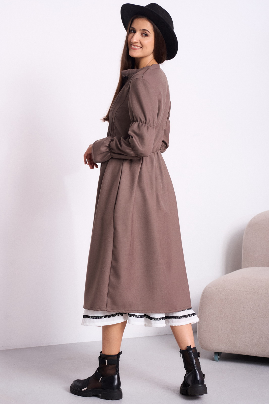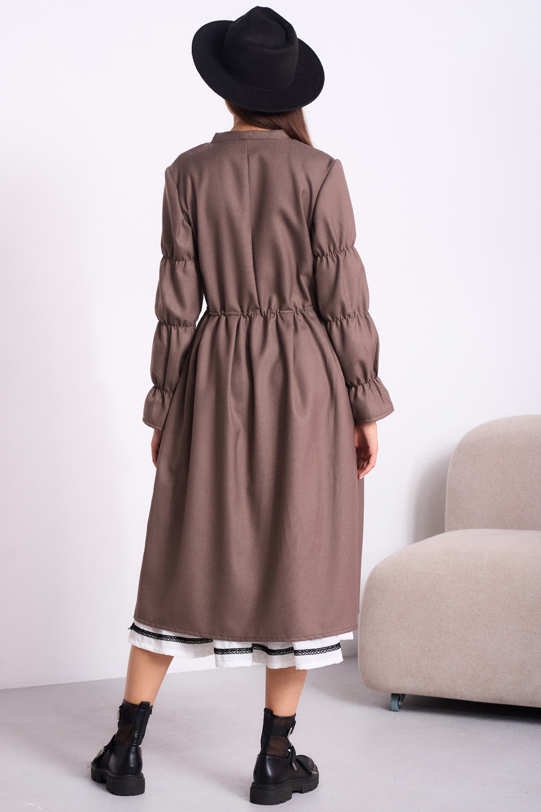 Приталенный силуэт с акцентом на талии достигается за счет призборенной спинки, обеспечивающей идеальную посадку по фигуре. Одношовный вточной рукав длиной 62 см завершается поперечной сборкой, создавая легкий и романтичный объем. Длина платья по спинке – 112 см.