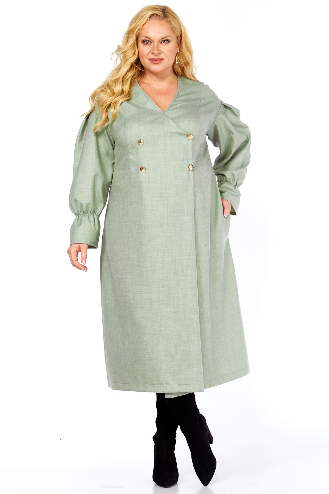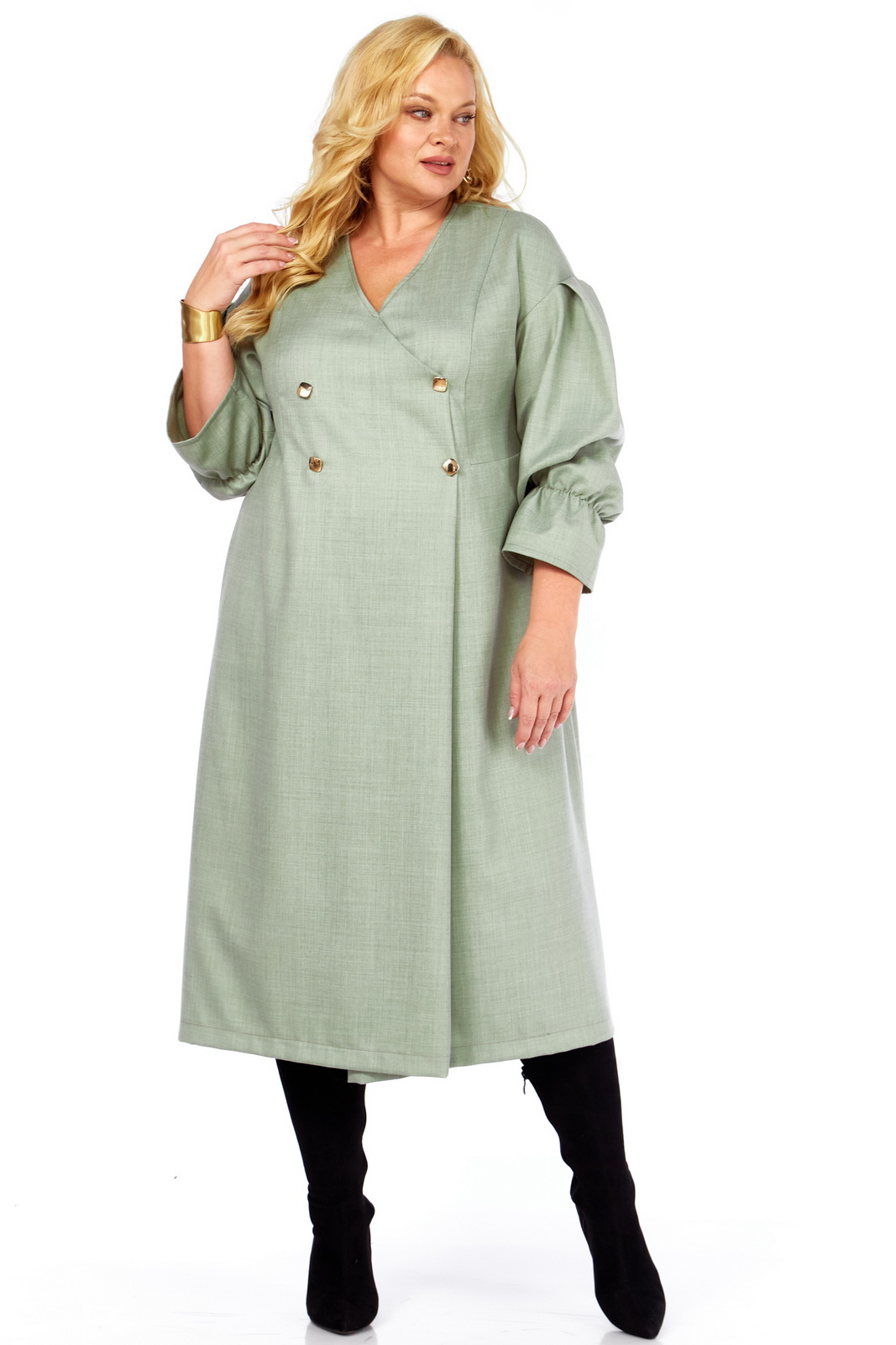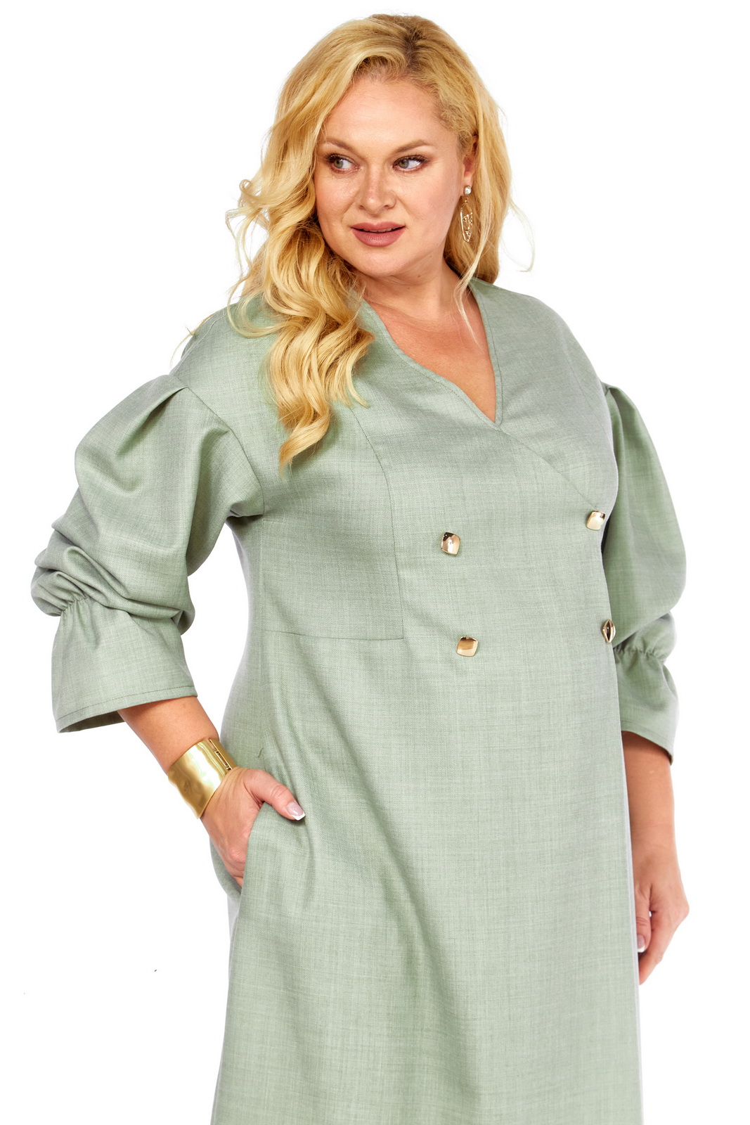 Игра акцентов и пропорций: Дизайн платья с двубортной застежкой и V-образным вырезом визуально стройнит силуэт и подчеркивает линию шеи. Рукава-фонарики добавляют нотку романтики и ретро-шика, а золотистые пуговицы – это яркий акцент, привлекающий внимание и добавляющий образу изысканности.