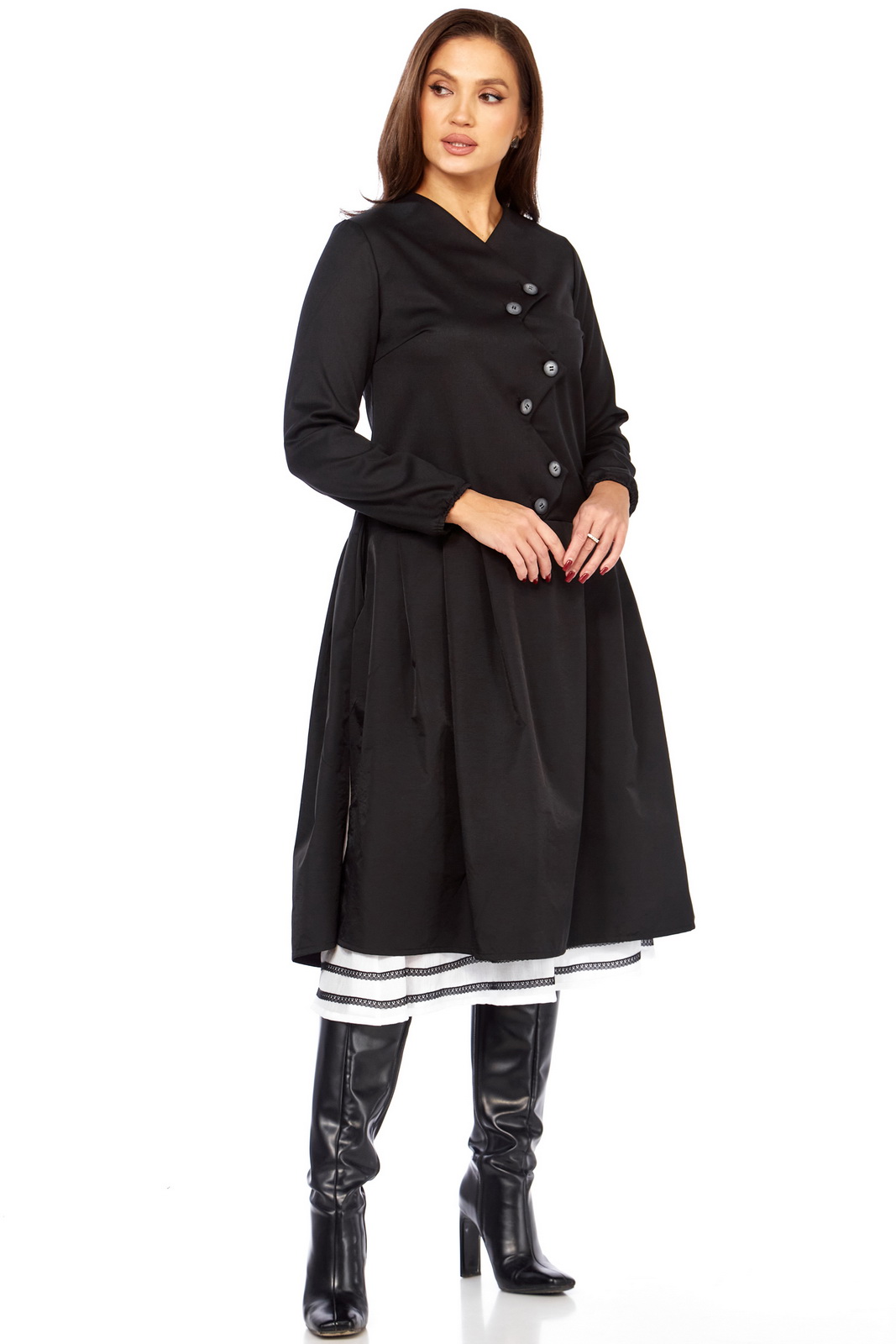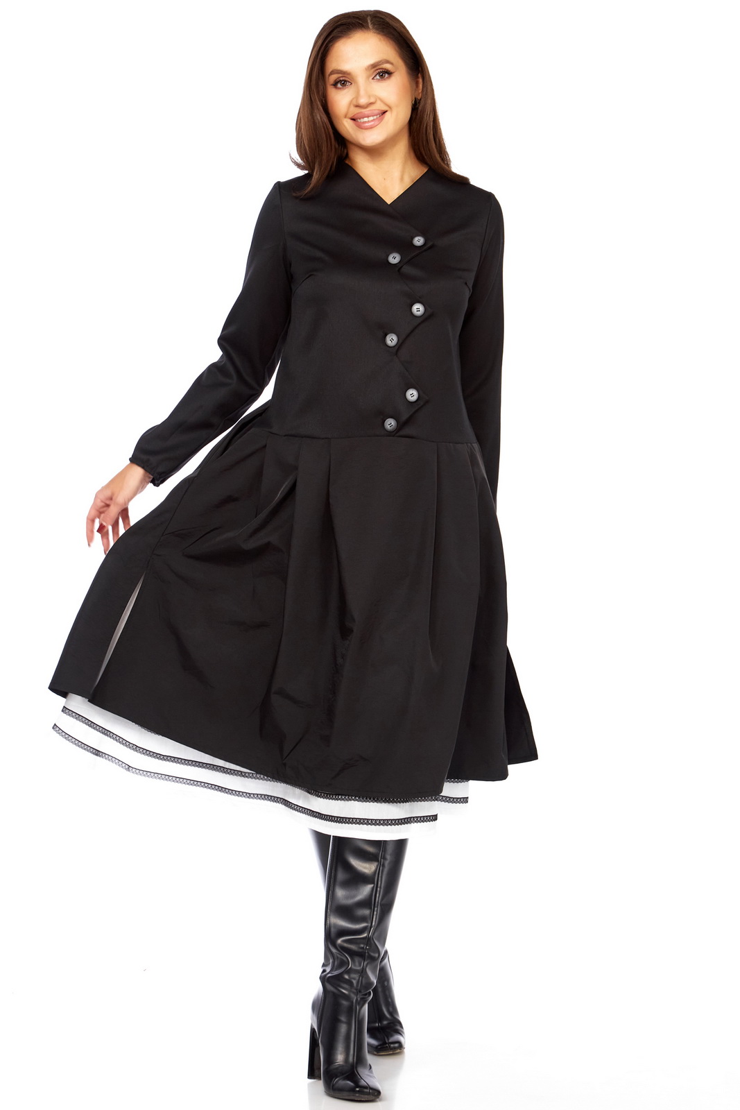 Особый шарм платью придает асимметричная застежка на крупные пуговицы, которая выгодно подчеркивает линию шеи и создает необычный акцент. Удобный крой и качественная ткань гарантируют, что вы будете чувствовать себя комфортно и уверенно в любой ситуации.