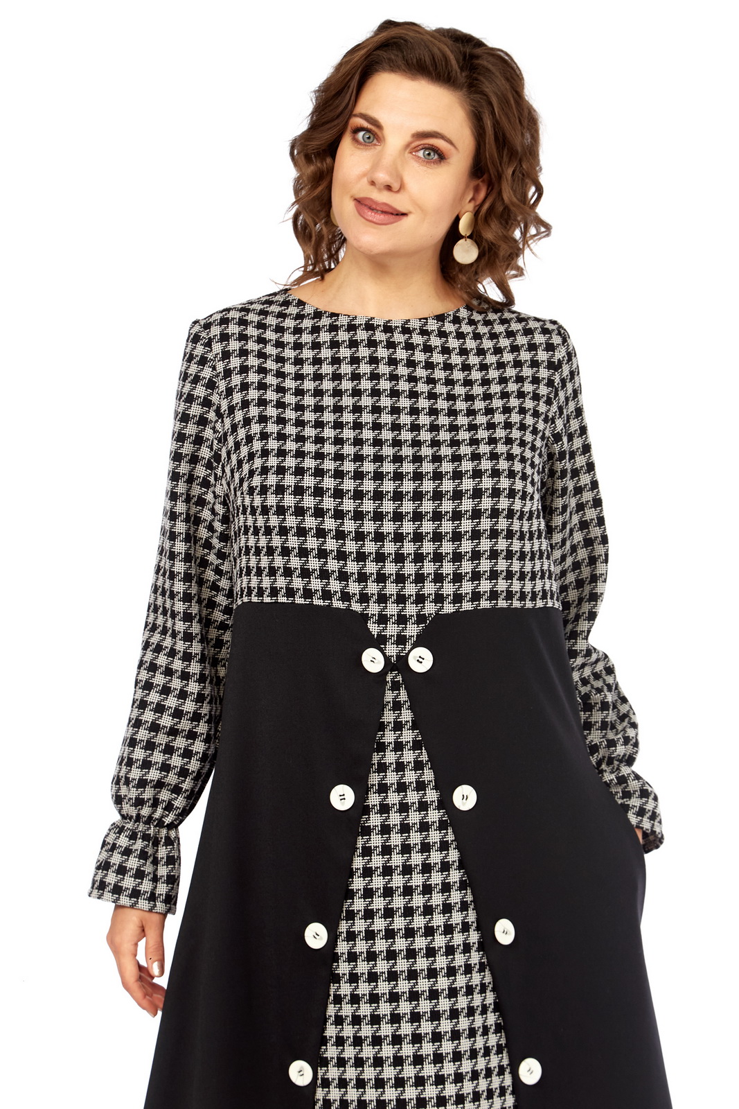Верхняя часть платья (лиф и рукава) выполнена из ткани с принтом “гусиная лапка”— классический черно-белый узор.