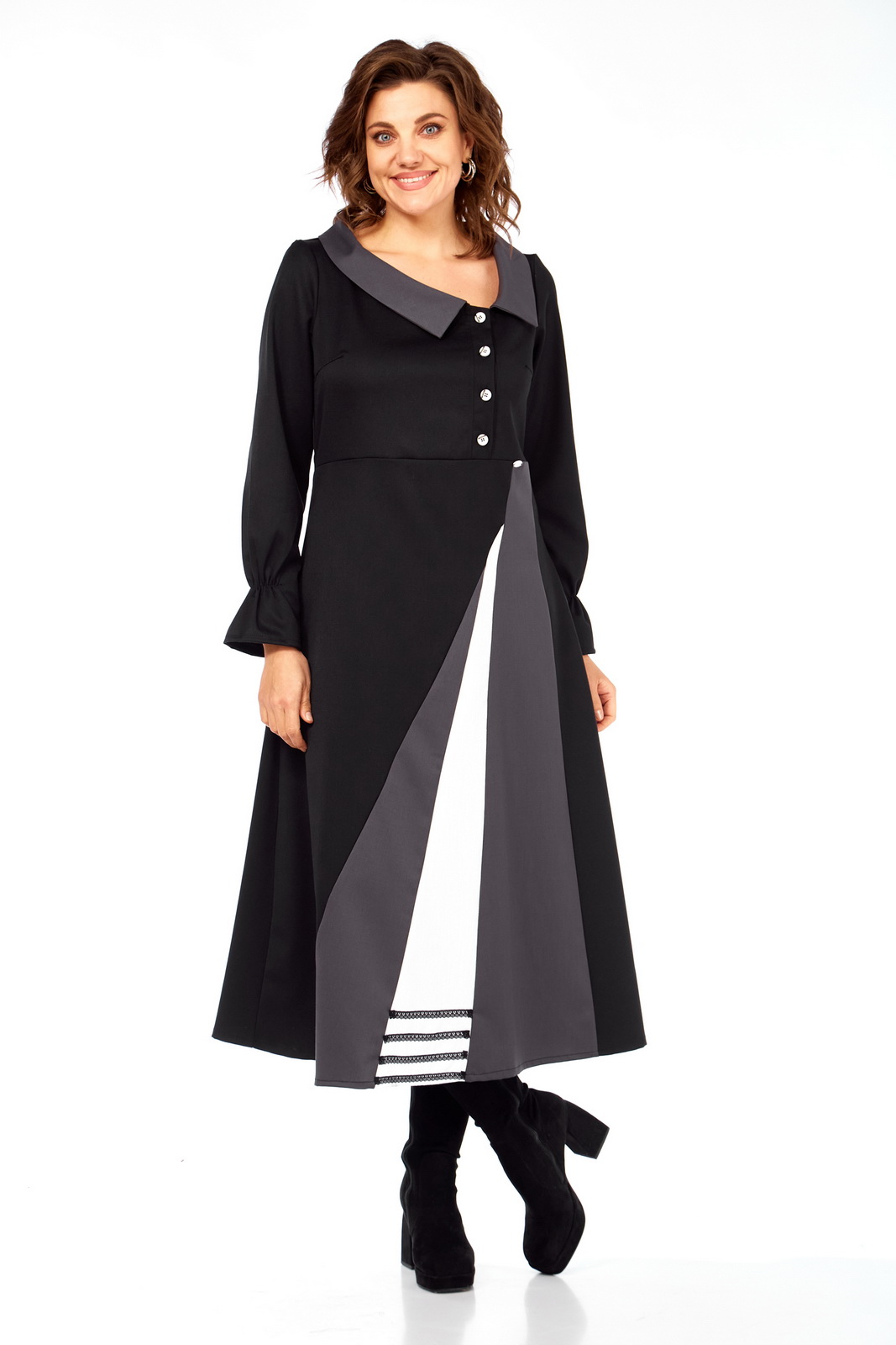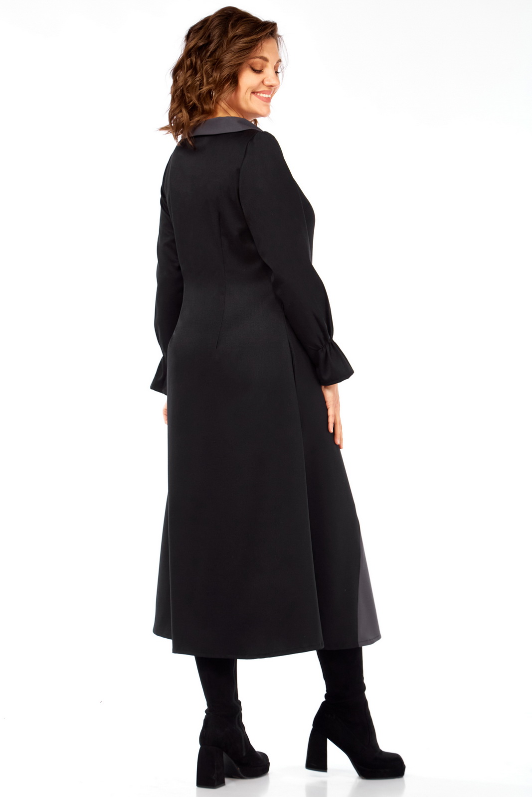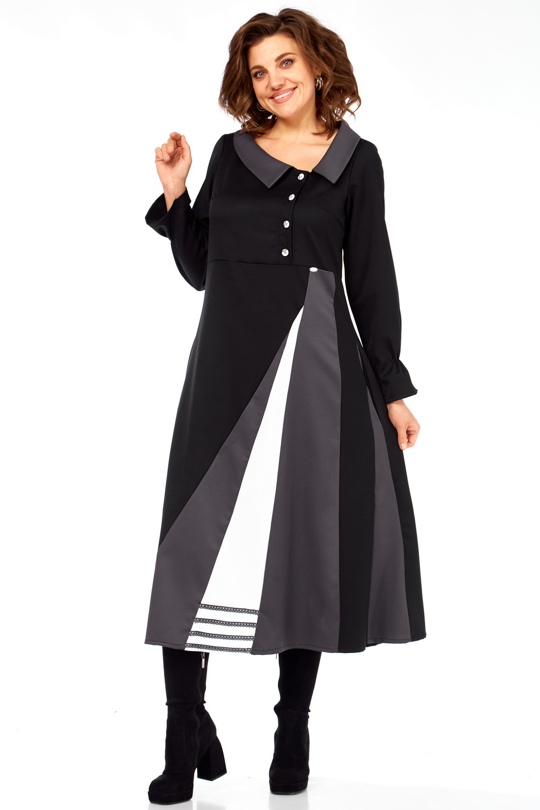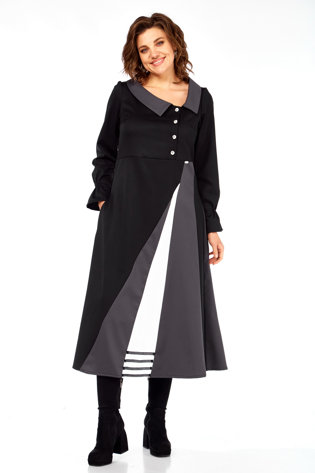 Описание: Это платье-ода элегантности движения и архитектурной точности, где каждый элемент продуман до мелочей. Асимметричные диагональные линии и расклешенный подол визуально вытягивают фигуру, делая ее стройнее и изящнее. Вы будете чувствовать себя уверенно и грациозно. Контраст черного, серого и белого создает графический, но не резкий образ, ассиметричные линии и “разрез” на юбке придают платью динамику, словно оно находится в постоянном, но контролируемом движении. Широкий воротник и декоративные пуговицы напоминают о винтажных патьях и шинелях, добавляя нотку ретро-шика и благородства. Забудьте о скучных нарядах! Это платье — произведение искусства, где каждая линия и каждый цвет продуманы, Вы будете ловить восхищенные взгляды, куда бы ни пошли. Техническое описание: Платье миди сложного асимметричного кроя, силуэт полуприлегающий в верхней части, переходящий в расклешенный А-силуэт к низу, создающий эффект удлиненной и струящейся фигуры. Воротник широкий, плоский, отложной, с закругленными краями, выполненный из темно-серой ткани, что придает ему элегантность и слегка винтажный акцент. Лиф приталенный, с застежкой на петли пуговицы. Декоративный ряд контрастных пуговиц, расположенных асимметрично, подчеркивает V-образный вырез и утончает силуэт. Рукава длинные, втачные, с легкой сборкой на манжетах, что добавляет мягкости и женственности. Основная часть низа выполнена из плотной черной ткани. Главная изюминка — асимметричный крой с вертикальными контрастными вставками, создающими эффект интригующего запаха или разреза. Контрастные вставки из черного основания юбки вырываются две широкие клиновидные вставки: одна темно-серая, другая — ярко-белая. Они расположены диагонально, пересекаясь, и создают визуальную игру. Белая вставка имеет выраженный декор в нижней части — три горизонтальные кружевные полоски, что добавляет графичности и уникальности. Спинка цельнокроеная с двумя выточками для лучшего прилегания фигуры, выполнена из основной черной ткани, подчеркивая стройность силуэта. длинаспинки 125см длина рукава 62см