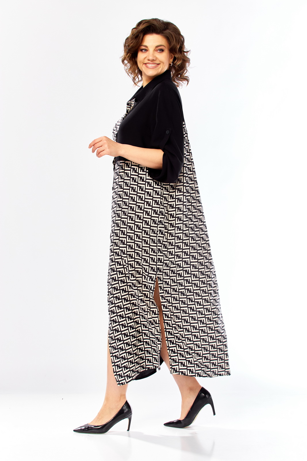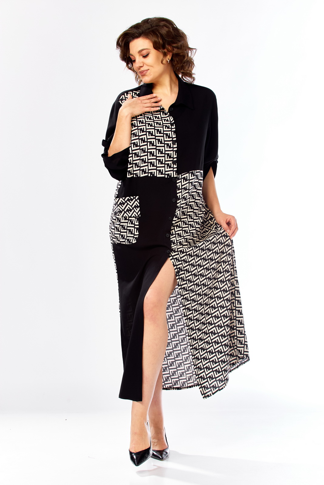 Описание: Платье женское свободного кроя с центральной застежкой на петли и пугоцы. Спинка окрглой формы. Перед с подрезом на талии. Платье из 2-ух видов ткани, расположенных в шахматном порядке. На правой половине боковой накладной карман с клапаном. Воротник рубашечный на стойке. Рукав втачной одношовный длиной 7/8 с хлястиком с возможностью регулировки длины.