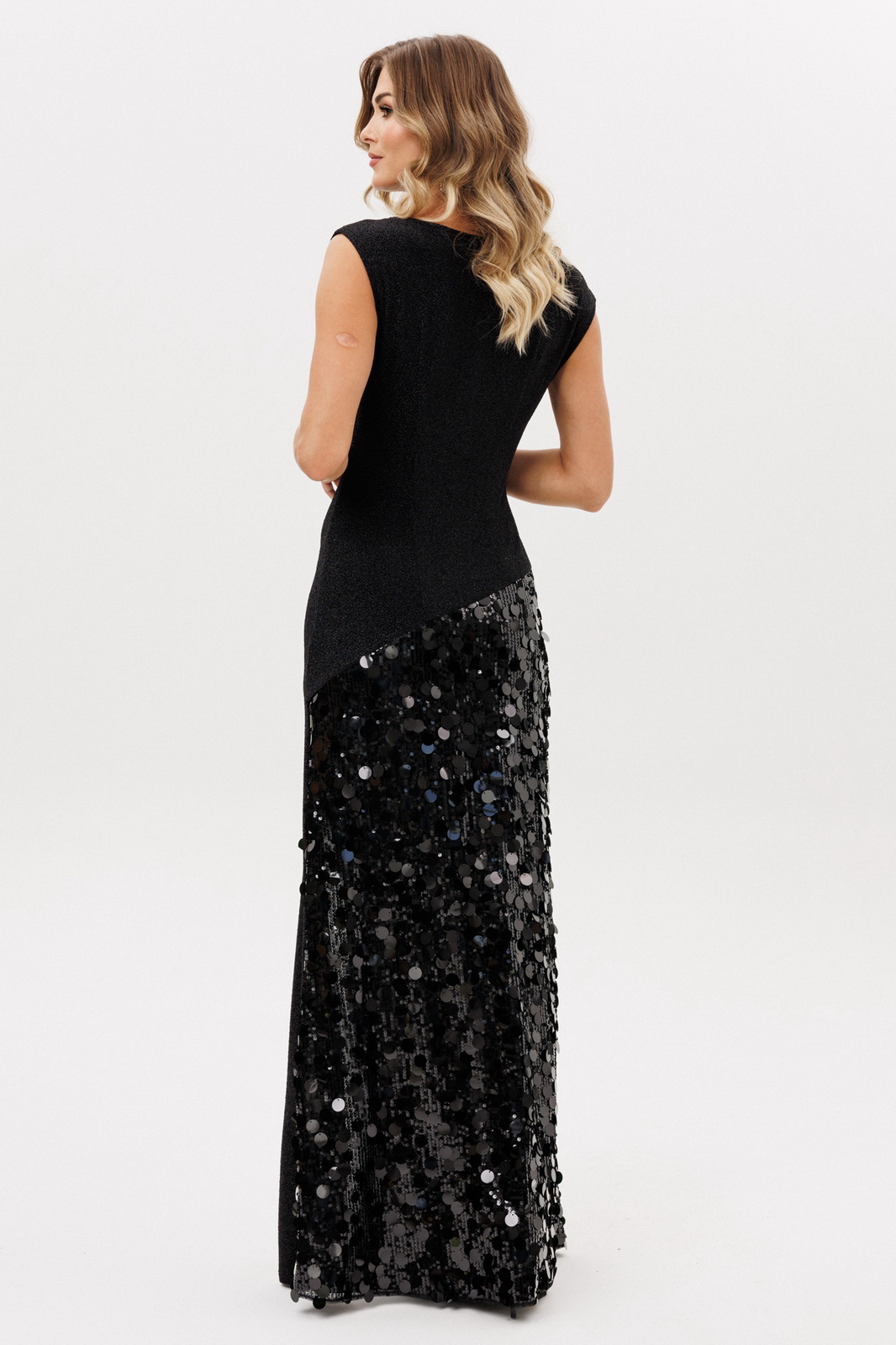 Описание: Платье выполнено из комбинации двух тканей: трикотажного полотна с блеском и крупных пайеток на сетке. Платье приталенного силуэта длиной в пол. Перед и спинка ассиметричные. Спереди драпировки от плеча и от линии талии. Горловина формы “лодочка”. Правый плечевой шов удлинен. Нижняя часть платья на отлетной по низу подкладке.