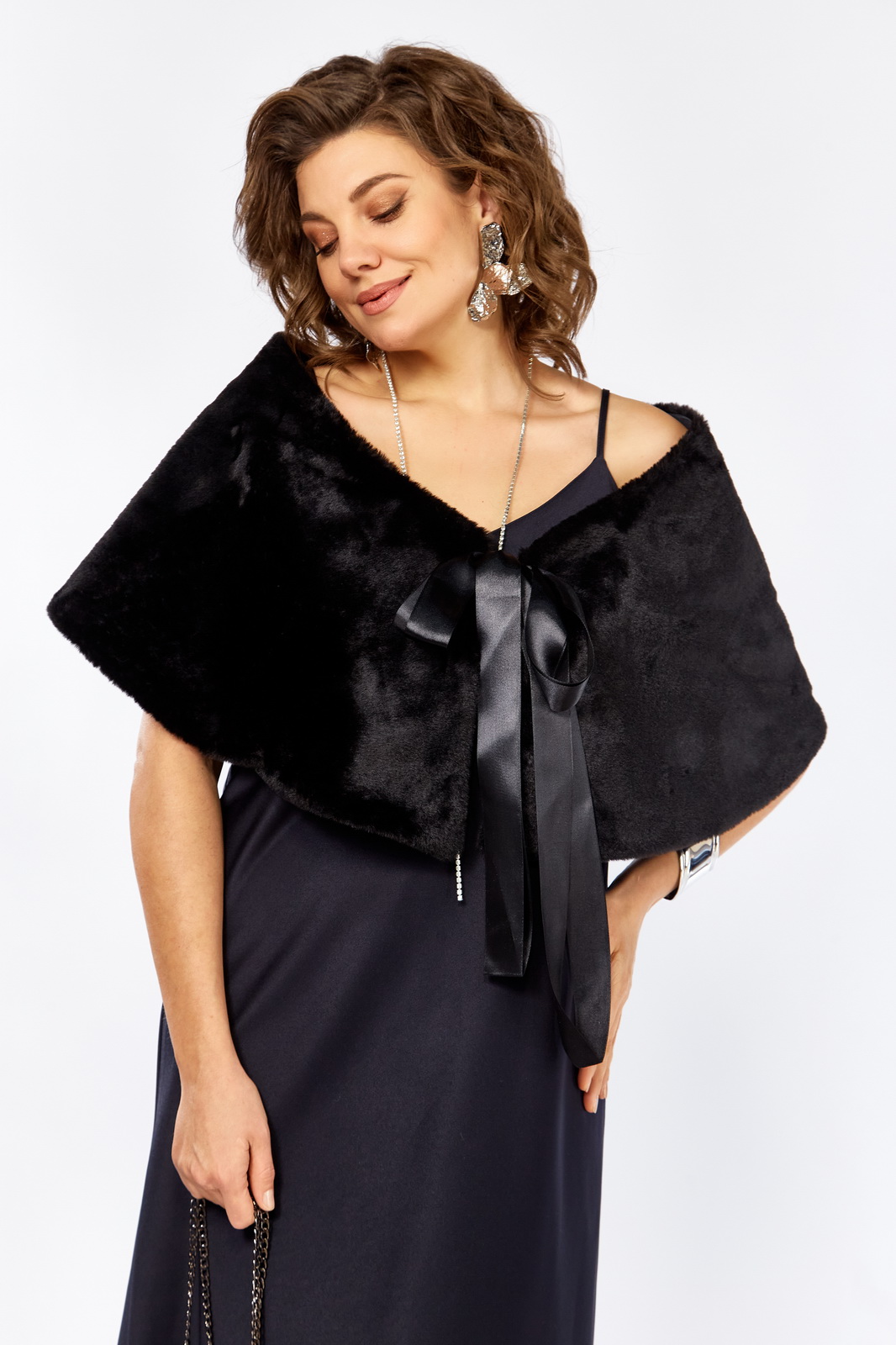 Описание: Изысканный комплект сочетает в себе платье из плотного атласа, свободного А образного силуэта ,изящной меховой горжеткой создавая образ утончённой элегантности женственности