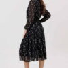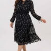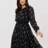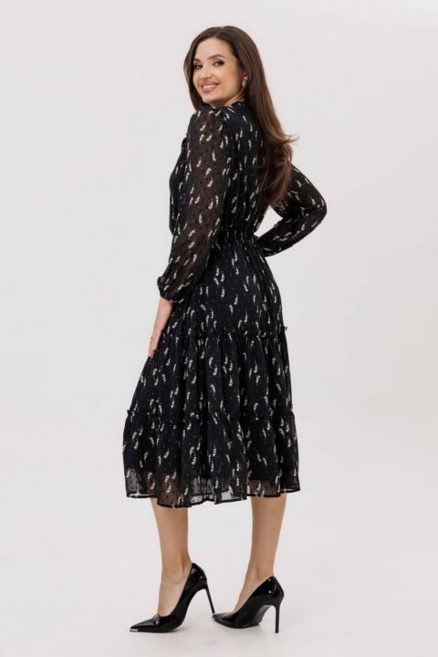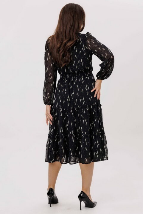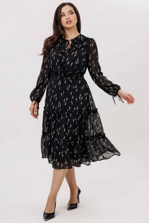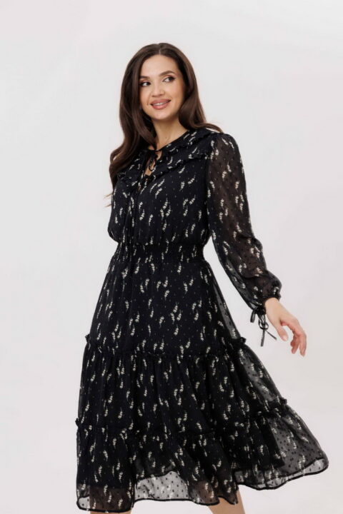 Описание: Платье женское свободного силуэта, отрезное по линии талии, расклешённое к низу, выполнено из ткани шифон. По линии талии сборка на резинку «венгерку» с отделкой рюшами. Горловина v-образная с небольшими рюшей по переду до линии талии на завязках. Передняя полочка дополнительно украшена рюшами. Рукава одно шовные втачные, по низу сборка на резинку-венгерку. Платье на тонкой трикотажной подкладке.