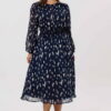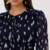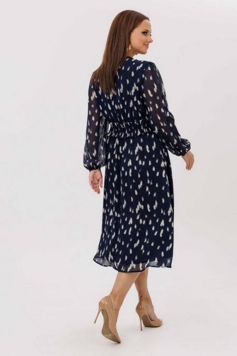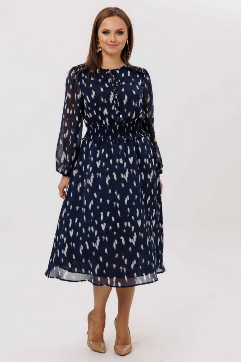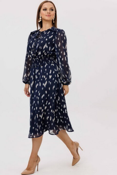 Описание: Платье женское свободного силуэта, отрезное по линии талии, расклешённое к низу, выполнено из ткани шифон. По линии талии сборка на резинку «венгерку». Горловина v-образная с небольшими рюшей по переду до линии талии на завязках. Передняя полочка дополнительно украшена рюшами. Рукава одно шовные втачные, по низу легкая сборка. Платье на тонкой трикотажной подкладке с декоративной пришивной тесьмой..