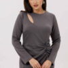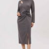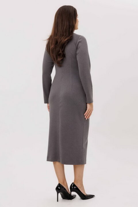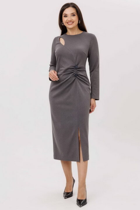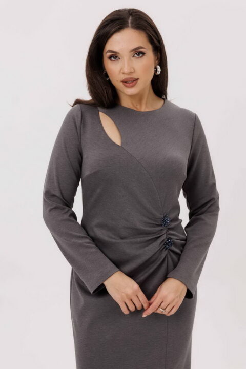 Описание: Платье полуприлегающего силуэта с ассиметричным фигурным подрезом, в верху которого расположен фиругрый вырез. Подрез заканчивается разрезом. В середине подреза сборка. По переду нагрудные вытачки. Спинка со средним швом, в который вставлена тесьма-молния. По спинке талиевые вытачки. Рукав одношовный, втачной. Горловина на обтачке. Дополняют модель пришитые декоративные броши.