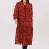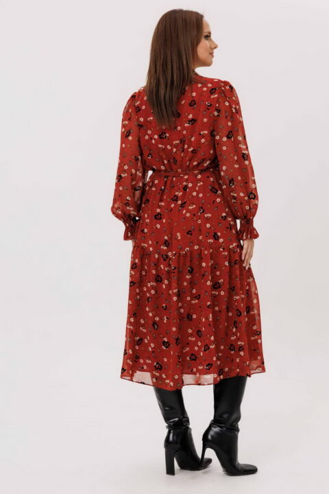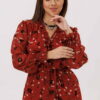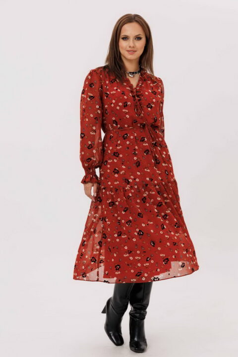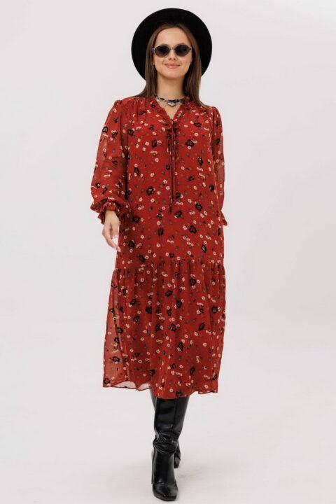 Описание: Платье свободного силуэта с подрезом ниже линии бедер. Перед с кокеткой. Горловина обработана рюшей и завязками. Рукав одношовный, заканчивающийся манжетой на венгерке. По окату рукава сборка. Платье на подкладке. Дополняет модель пояс.